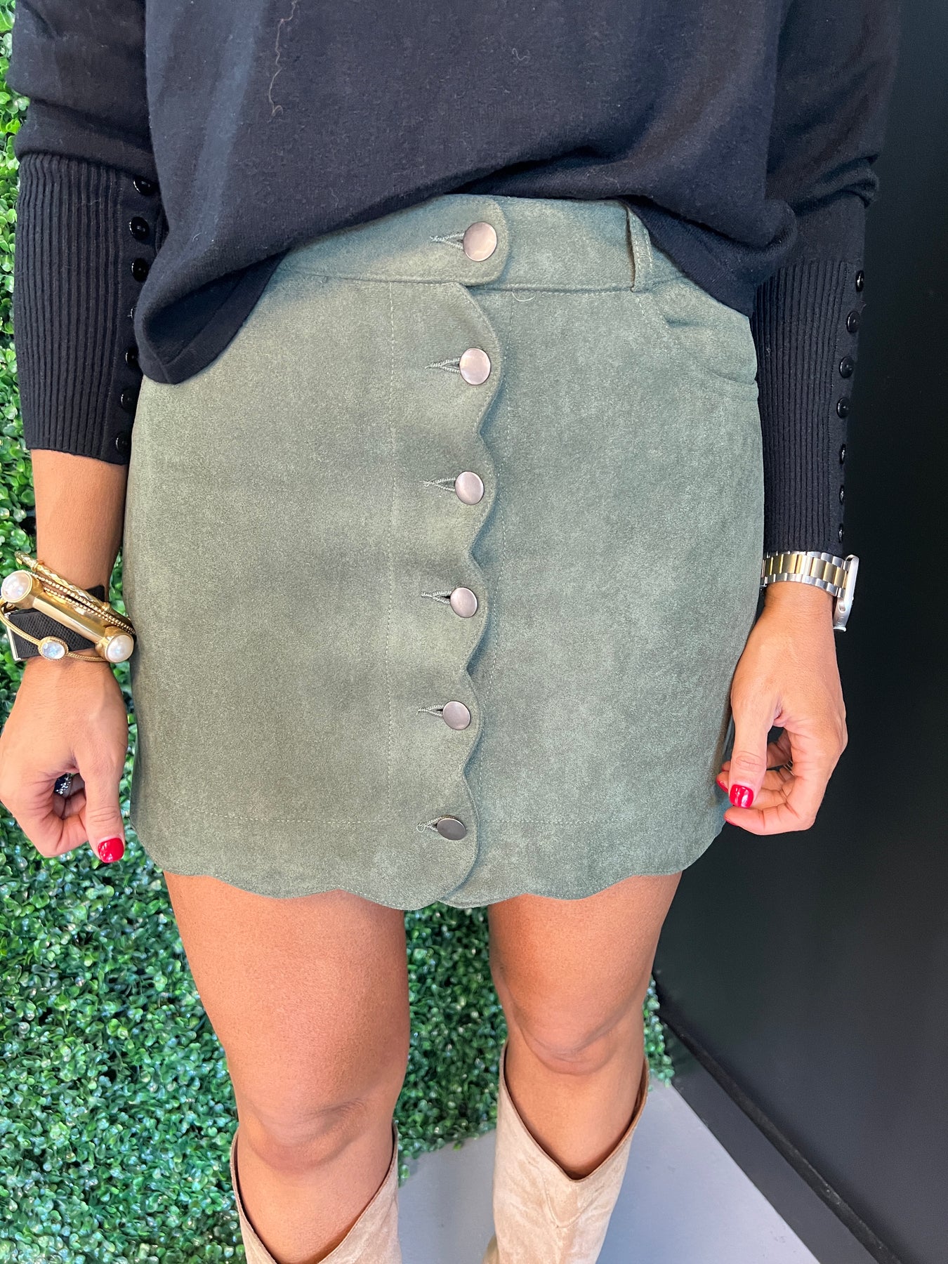 Flirty and fun, this olive green mini skirt features delicate scalloped edges that add a touch of whimsy to your wardrobe. The soft, flattering silhouette pairs perfectly with crop tops, oversized tees, or fitted sweaters for effortless style. Whether you're heading out for a casual day or dressing up for the evening, this versatile piece brings a pop of color and personality to any outfit. A wardrobe essential that's equal parts cute and comfortable.