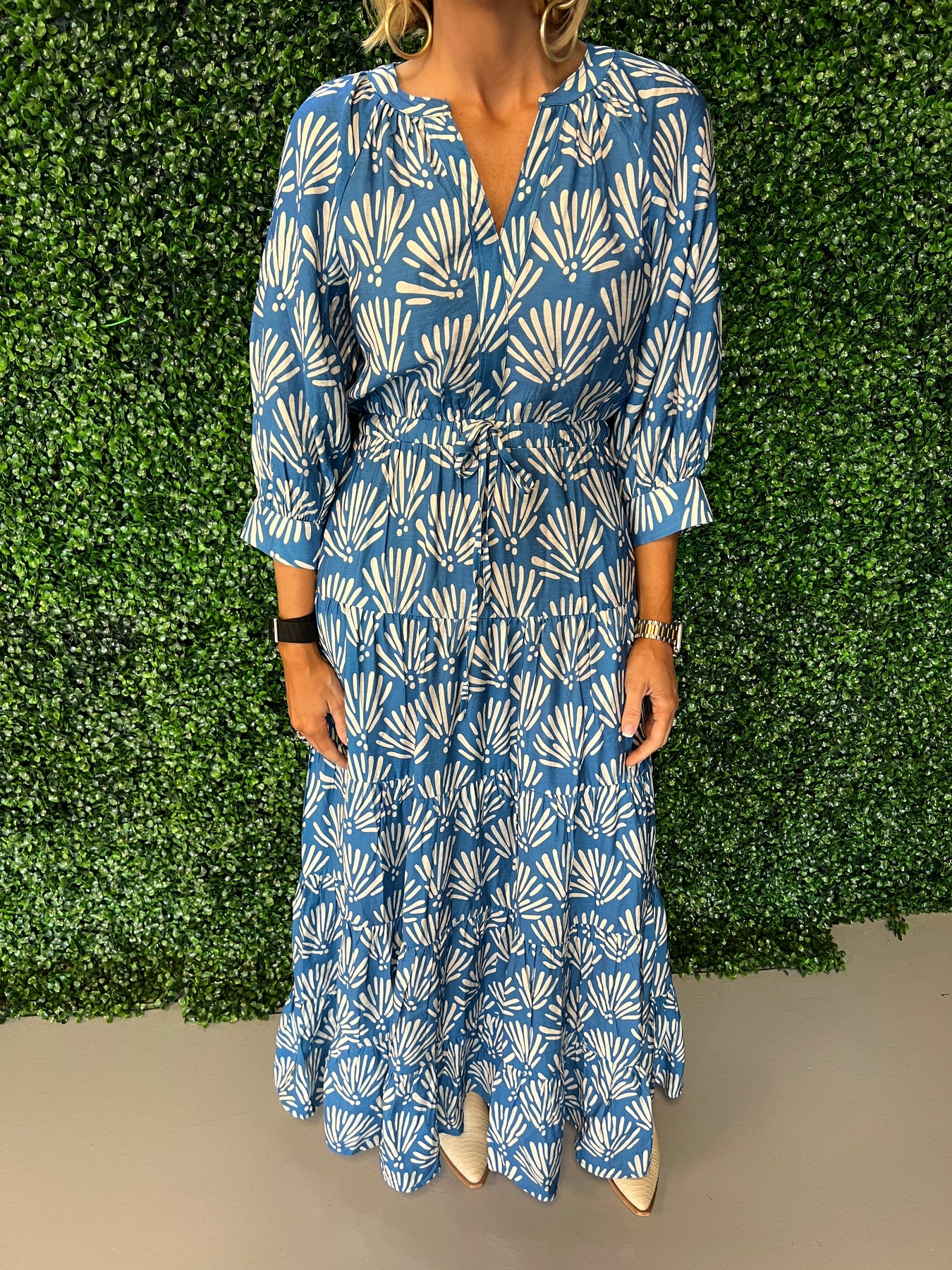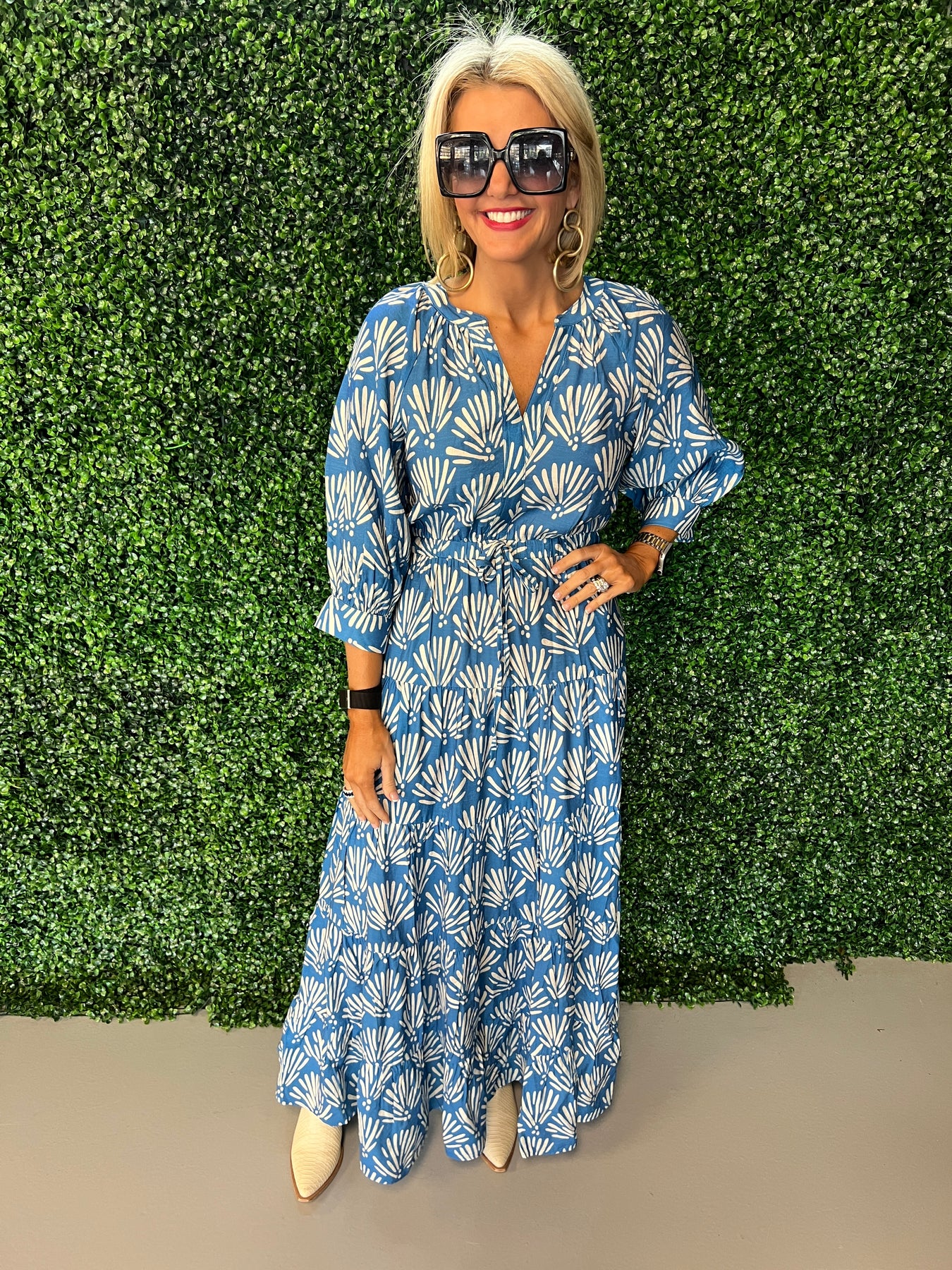 Twirl into elegance with this stunning blue print tiered maxi dress! Featuring cascading layers that add movement and dimension, this piece effortlessly transitions from casual daytime adventures to evening sophistication. The vibrant blue print brings a pop of personality to your wardrobe, while the flowing maxi silhouette flatters every frame. Perfect for those moments when you want to feel both comfortable and absolutely fabulous.