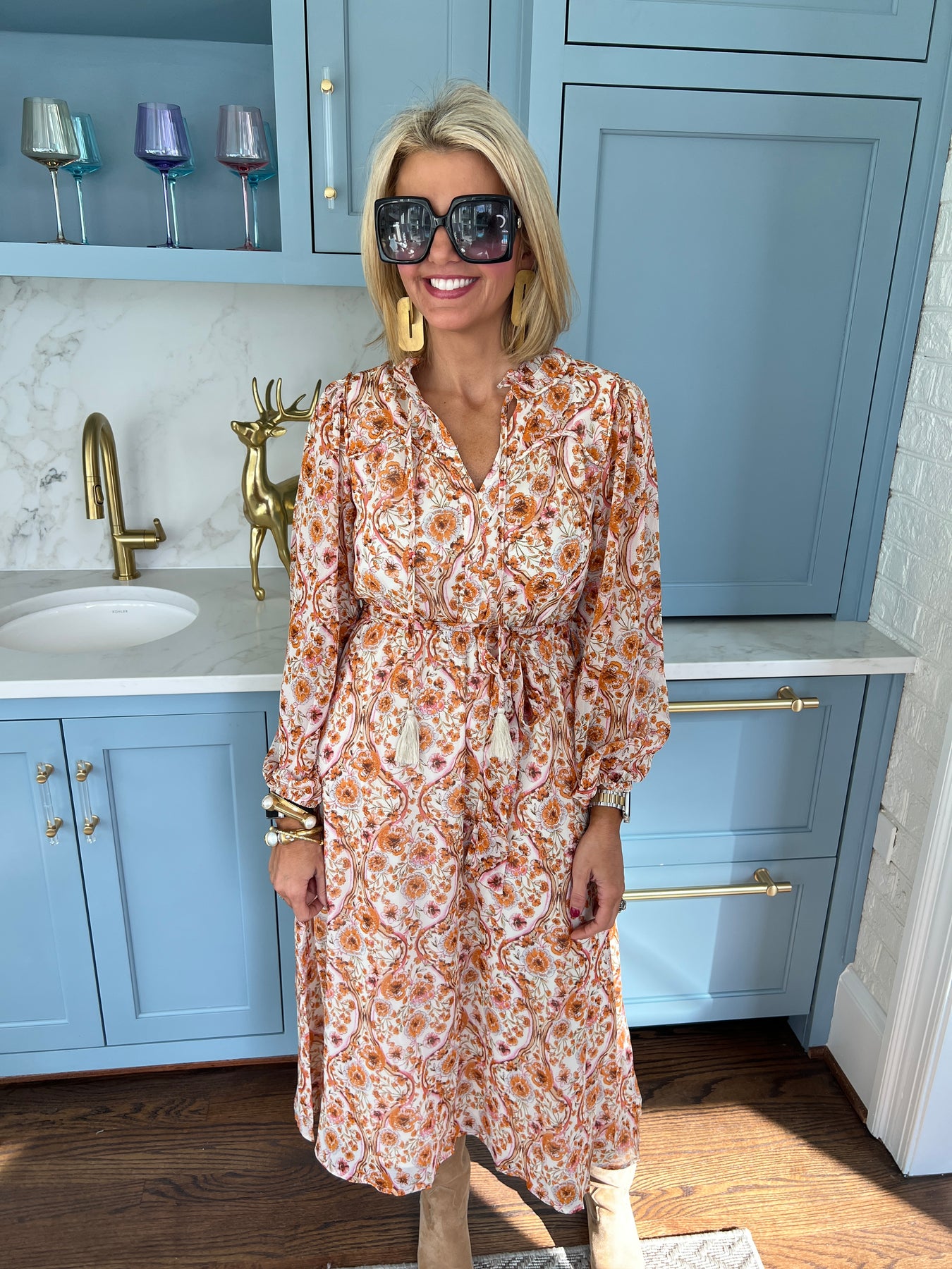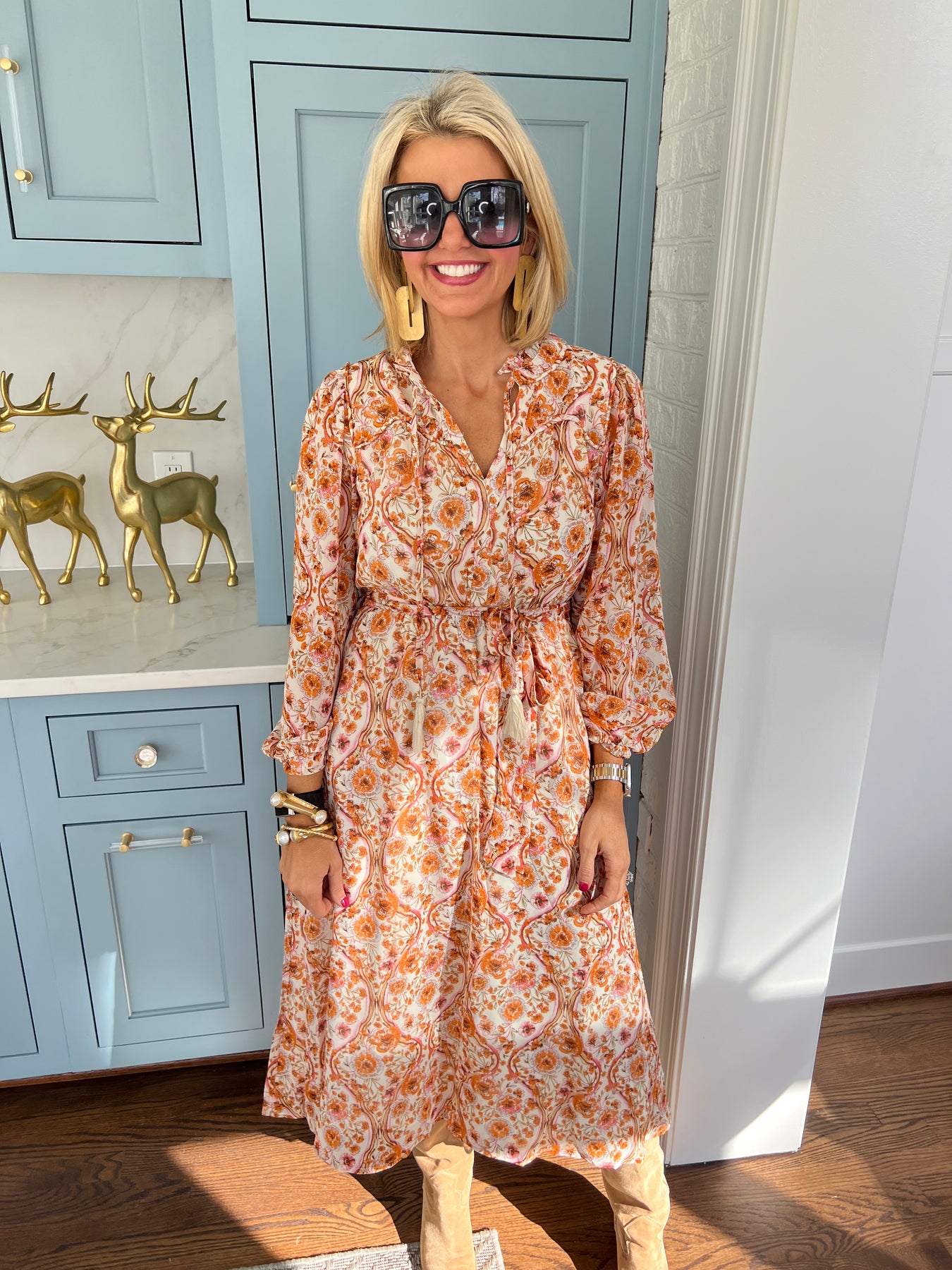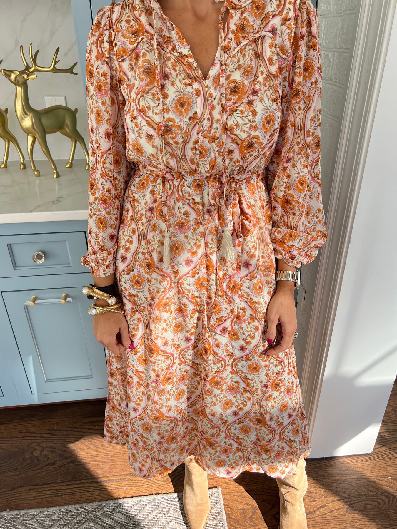 Elevate your wardrobe with this Floral Print Belted Midi Dress, designed to flatter every silhouette. The vibrant floral pattern brings a fresh, feminine touch, while the adjustable belt cinches the waist for a tailored fit. Crafted for comfort and style, its midi length offers versatile elegance, perfect for day-to-night wear. Experience effortless charm and confidence wherever you go.