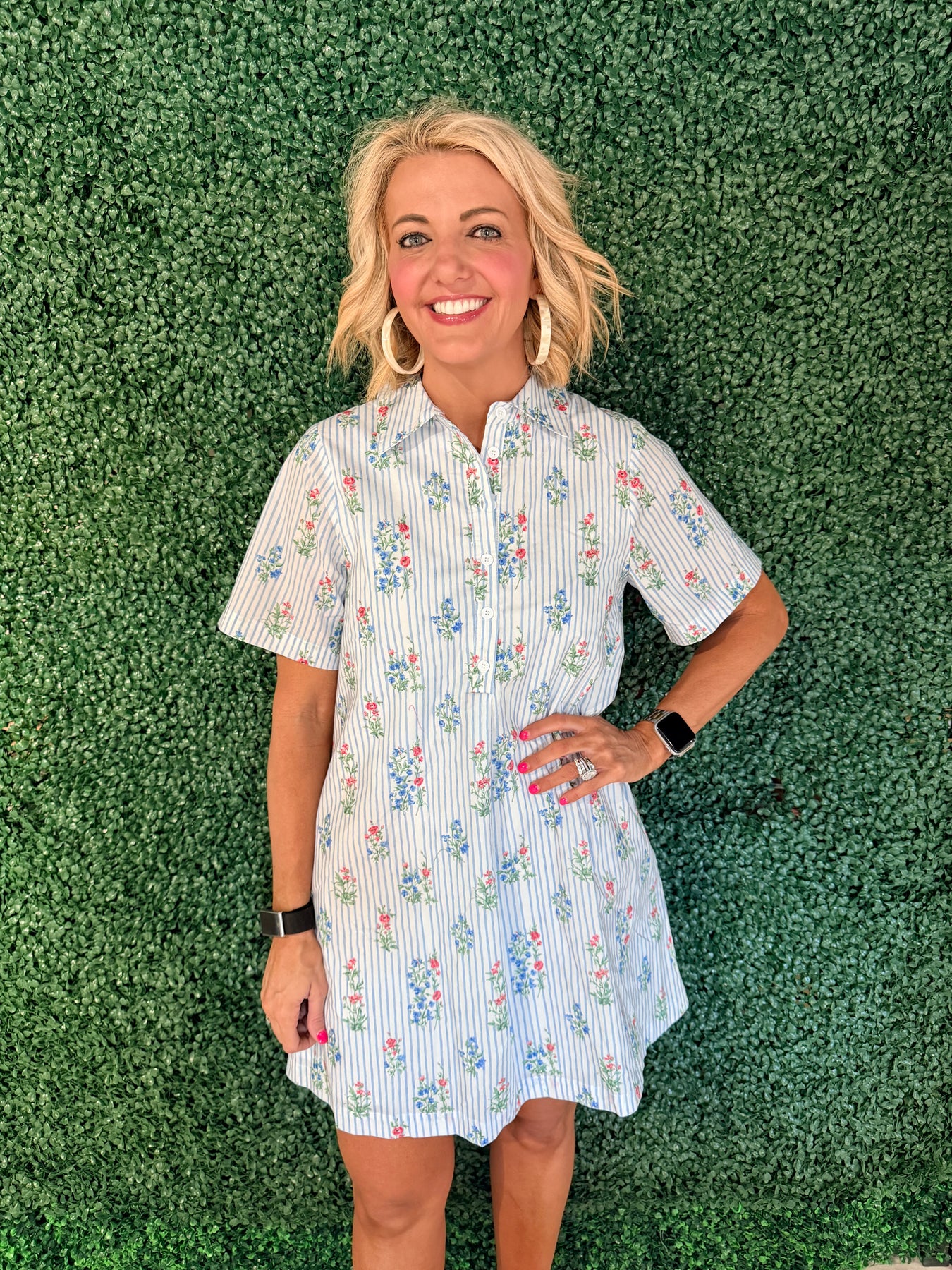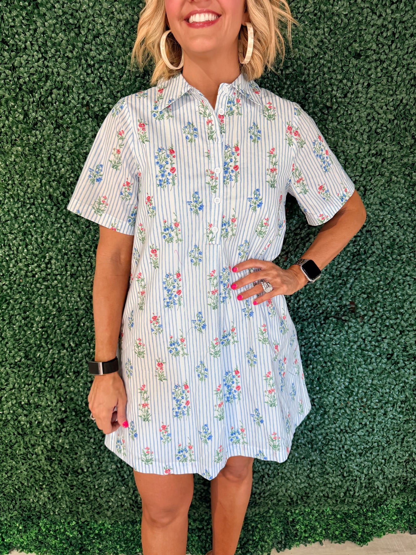 Effortlessly chic and versatile, this shift dress combines classic elegance with modern flair. The striking combination of pleated detailing, crisp stripes, and delicate floral print creates visual interest that transitions seamlessly from day to night. Cut in a relaxed shift silhouette, it offers comfortable movement without sacrificing style. Perfect for casual outings, office settings, or weekend gatherings, this dress pairs beautifully with sneakers, heels, or flats. A wardrobe essential that delivers timeless appeal with contemporary design.