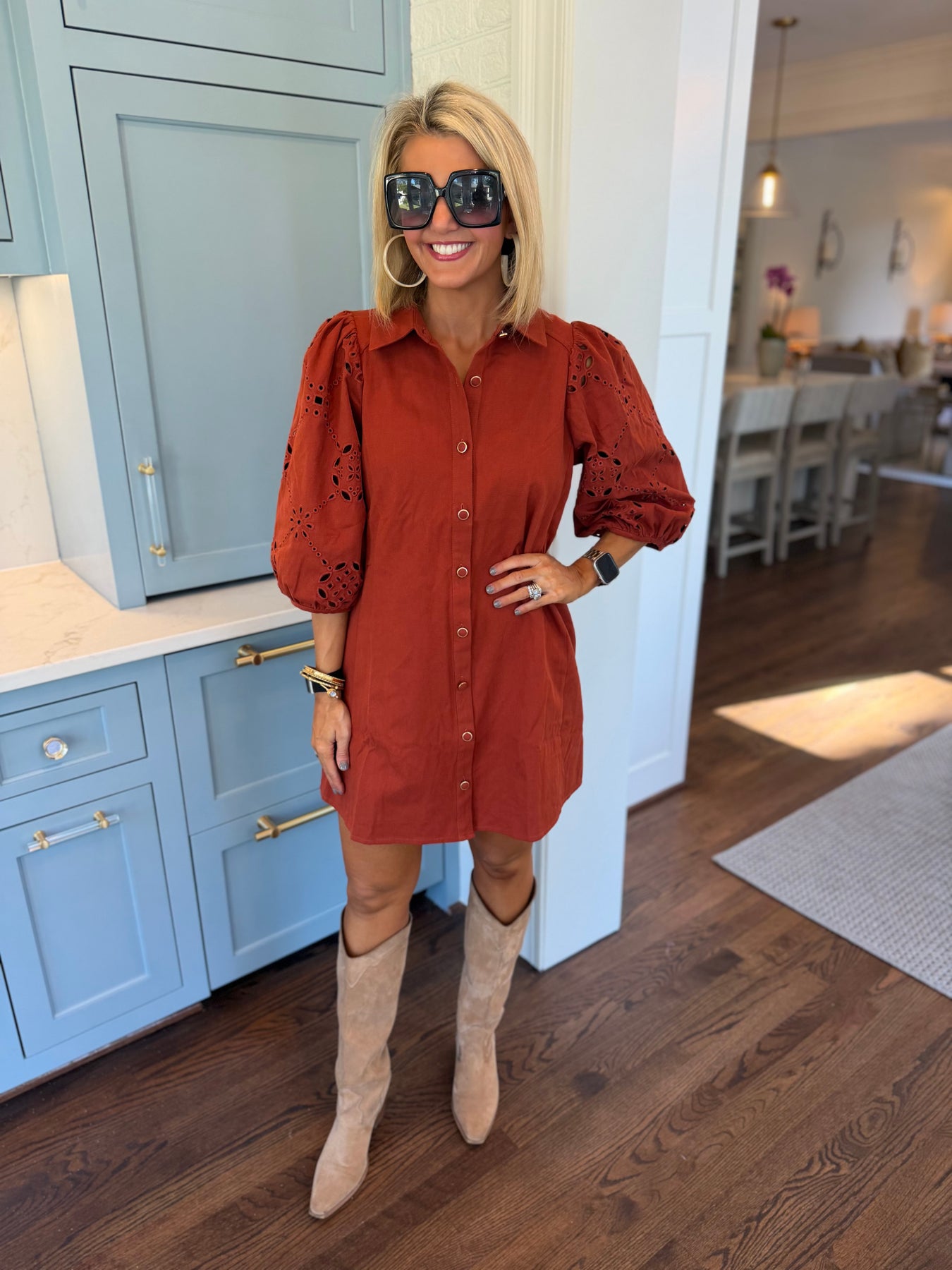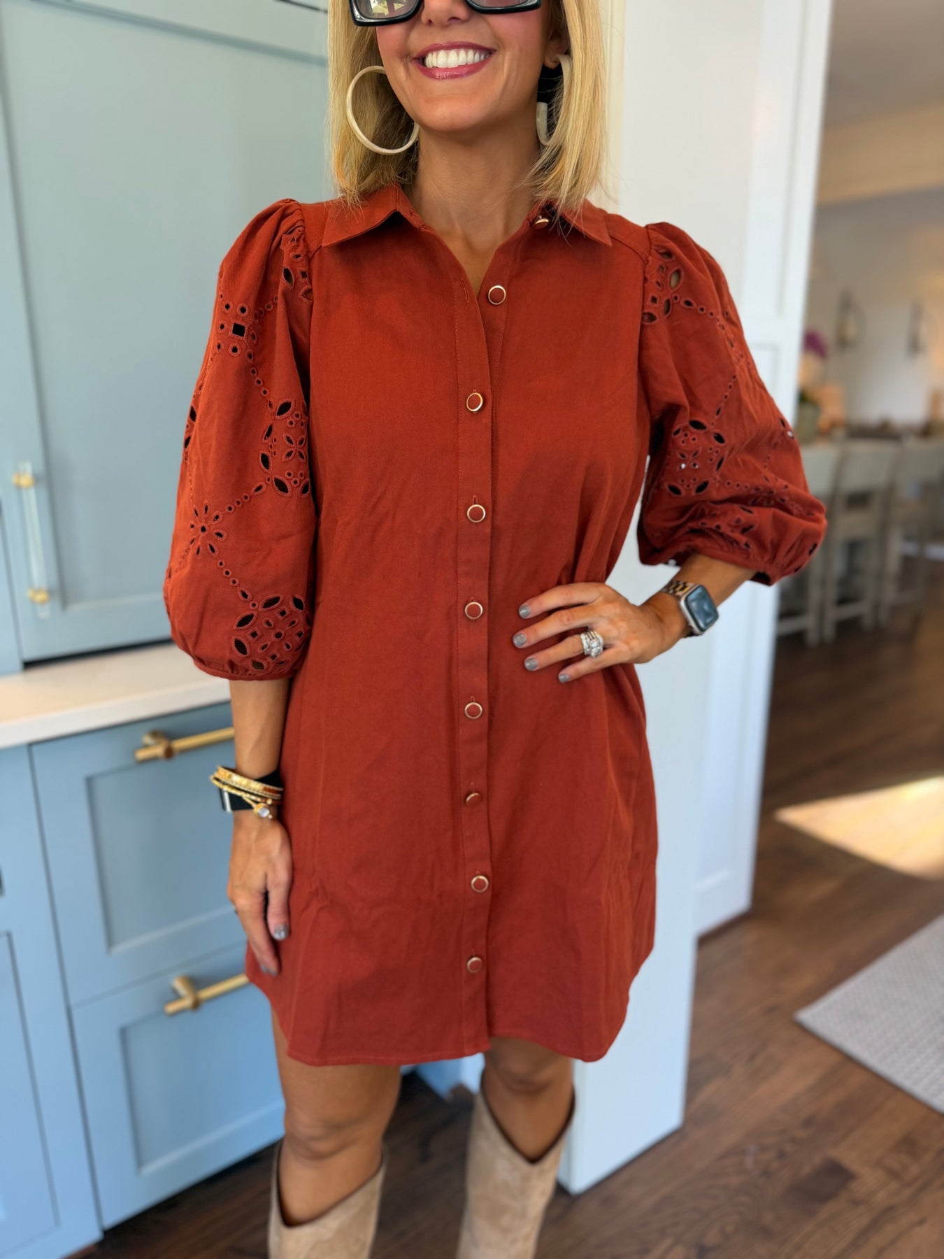 Elevate your wardrobe with this Rust Eyelet Puff Sleeve Mini Dress, blending classic charm and modern flair. The delicate eyelet fabric adds textured elegance, while the puff sleeves create a flattering silhouette that captures attention. Its mini length offers playful sophistication, perfect for both daytime outings and evening events. Experience effortless style and confidence in a dress designed to turn heads wherever you go.