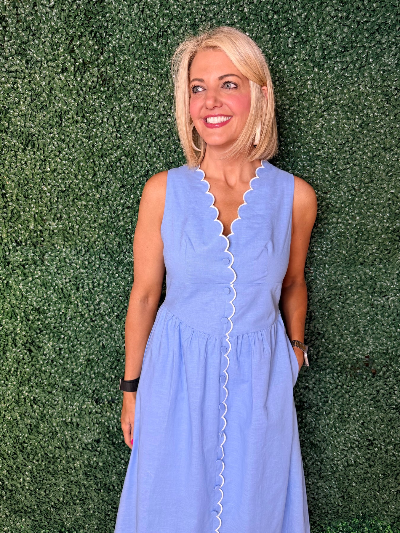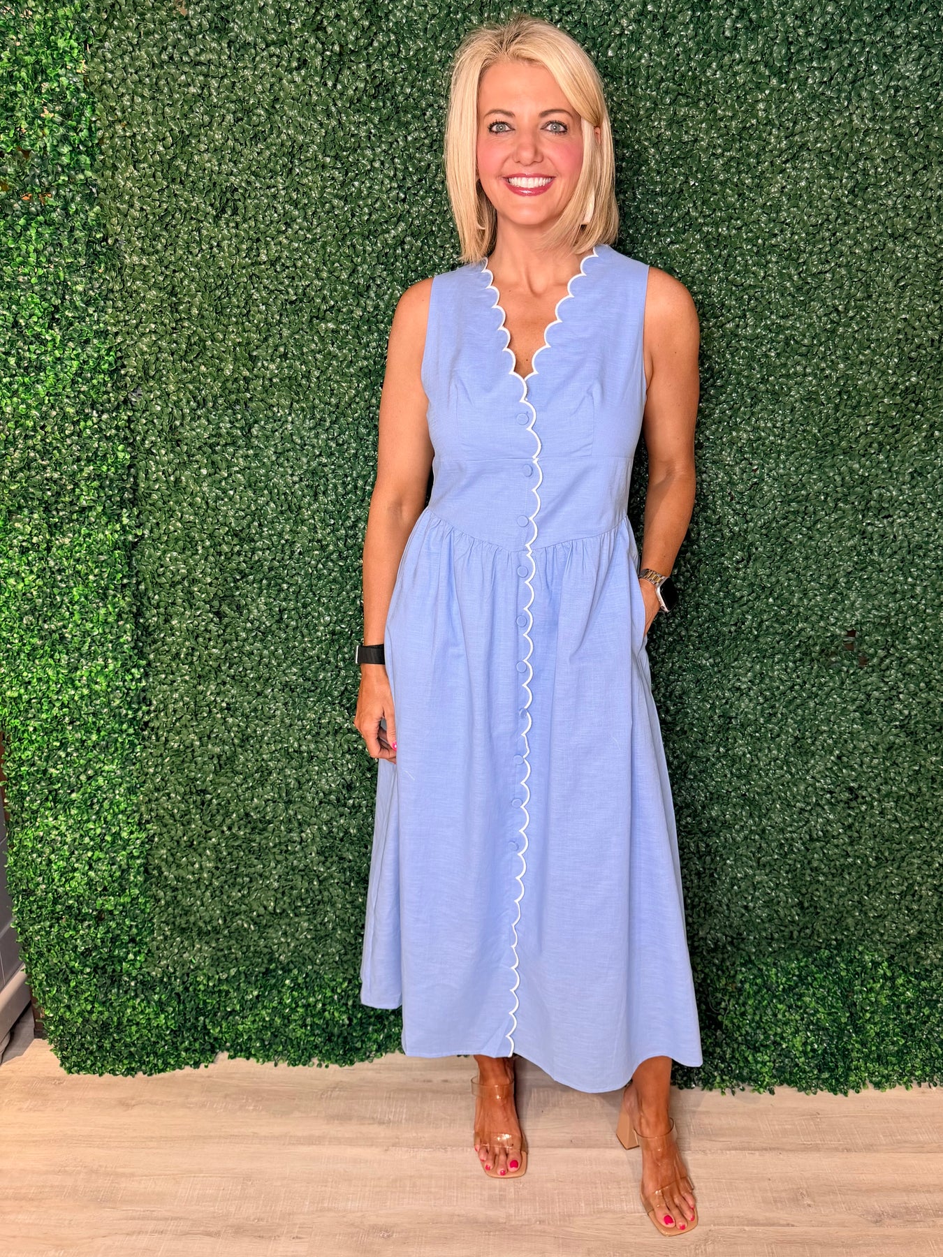 Elevate your wardrobe with this sophisticated V-neck sleeveless midi dress, designed for effortless elegance. The delicate scallop edge detailing adds a refined feminine touch that sets it apart from everyday basics. Perfect for transitioning from office to evening events, this versatile piece flatters various body types with its timeless silhouette. The midi length offers modest coverage while maintaining a contemporary feel. Pair it with heels for a polished look or dress it down with flats for casual sophistication. An essential addition to any style-conscious closet.