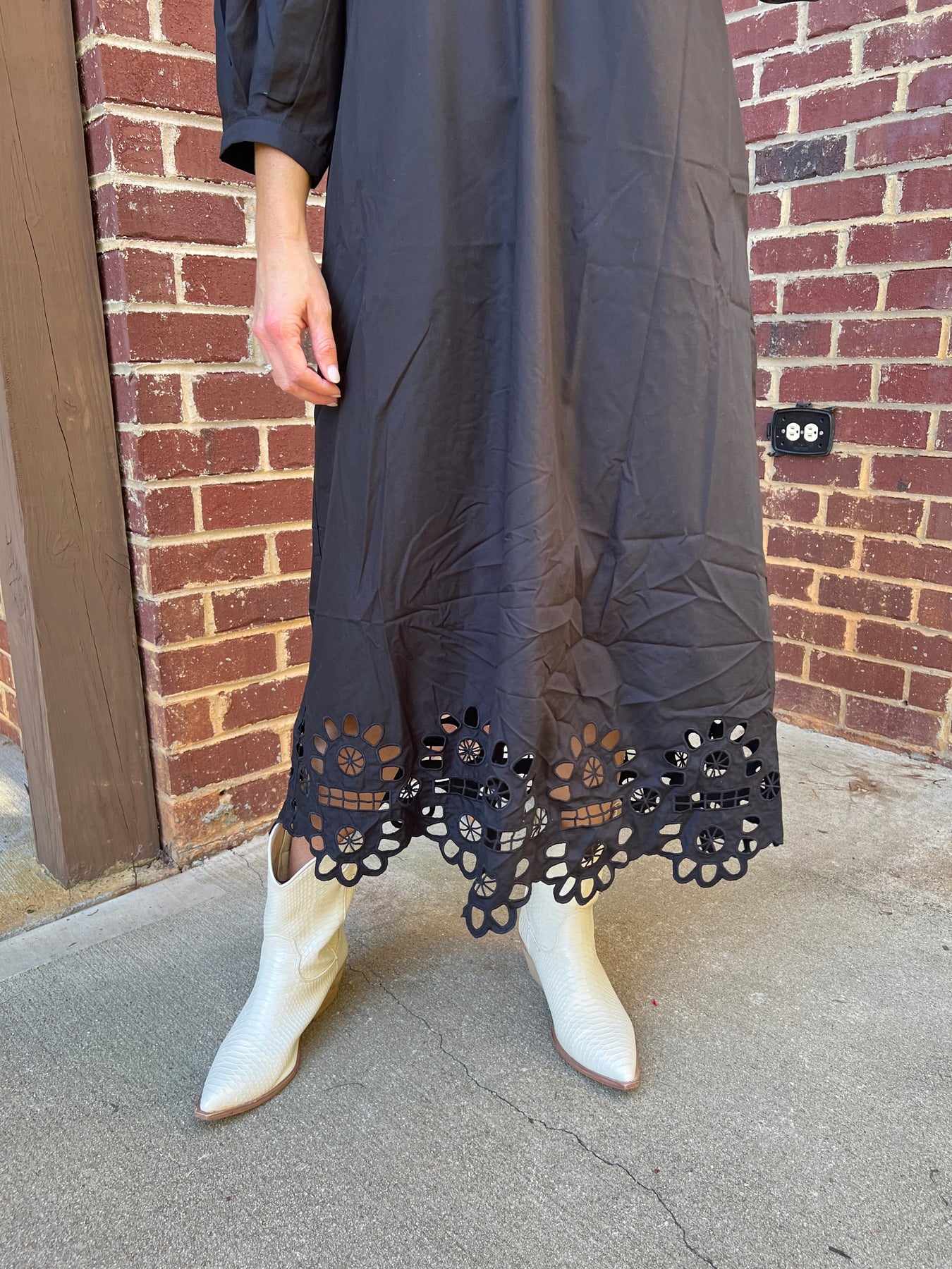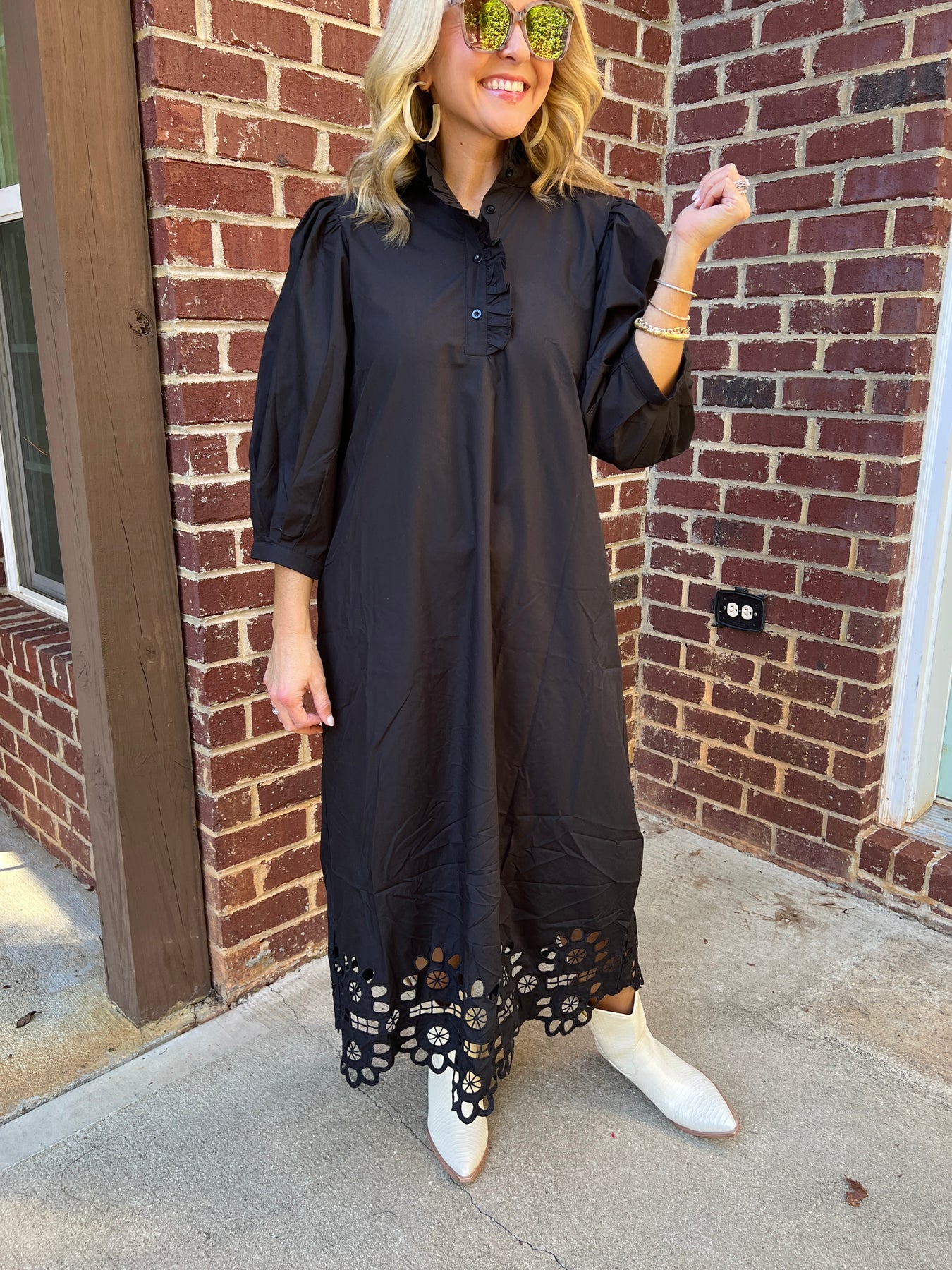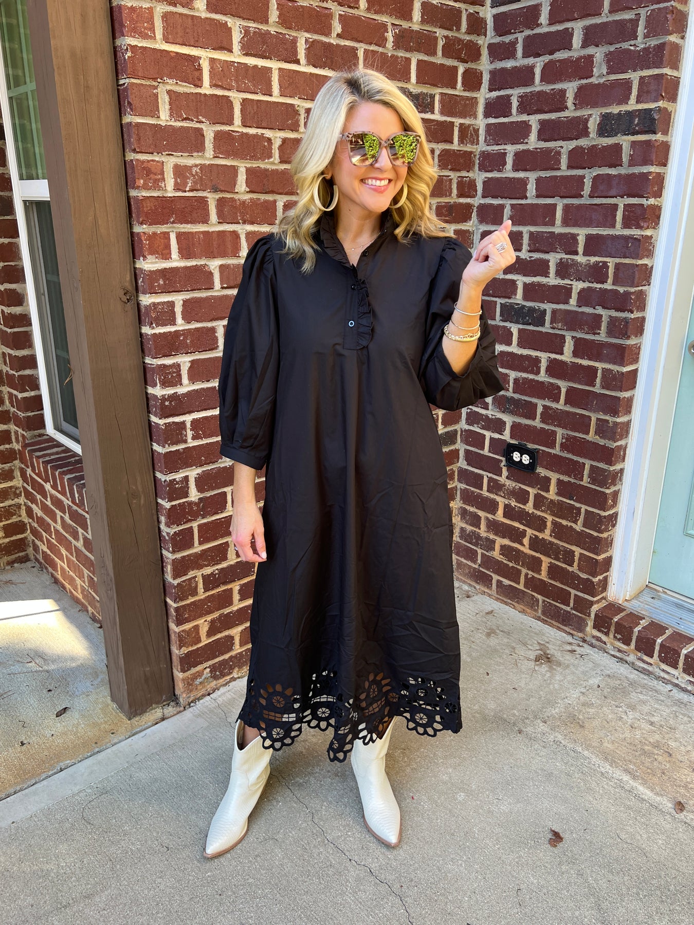 Black Puff Sleeve Dress with Scallop Cutout Hem