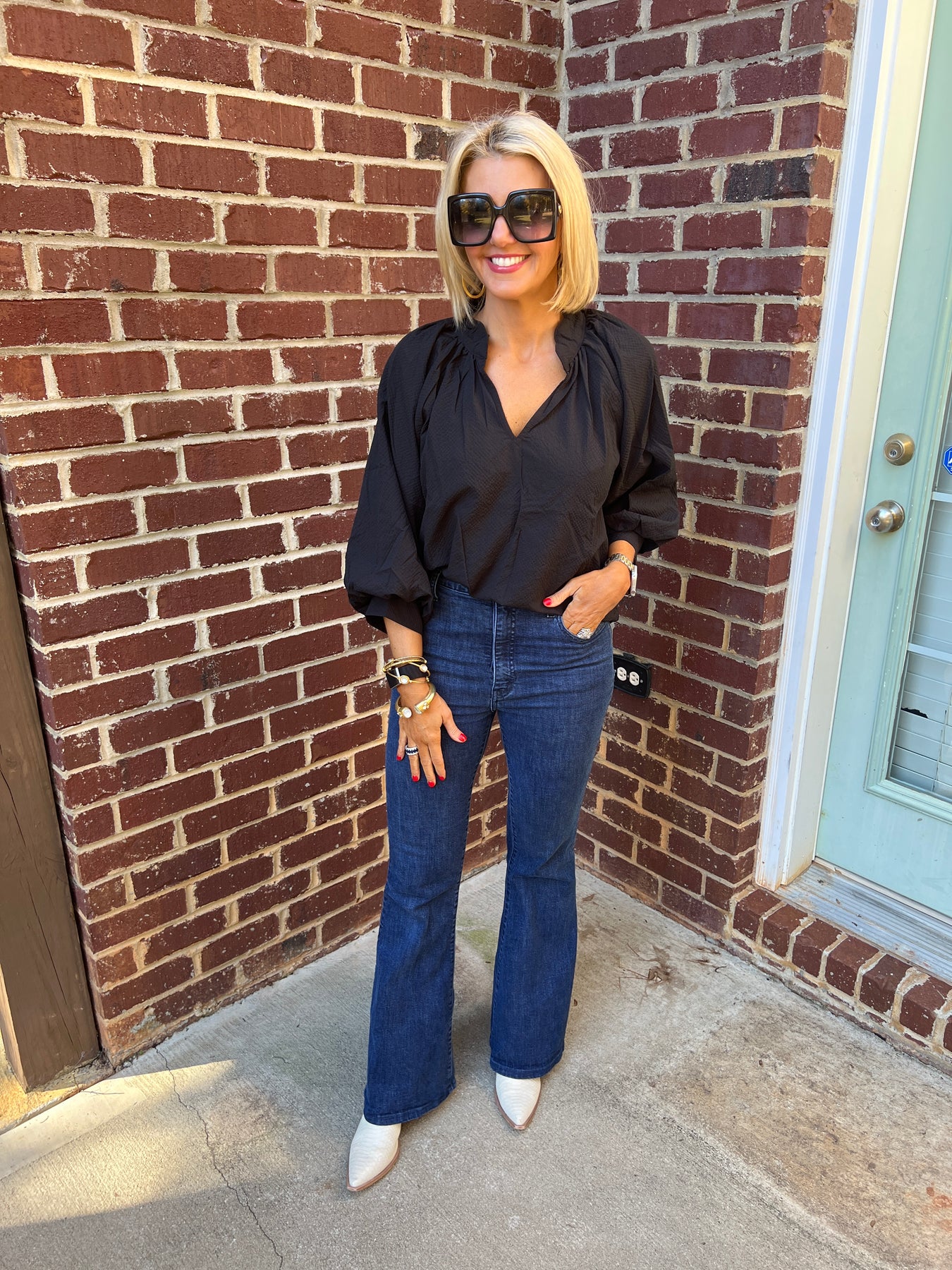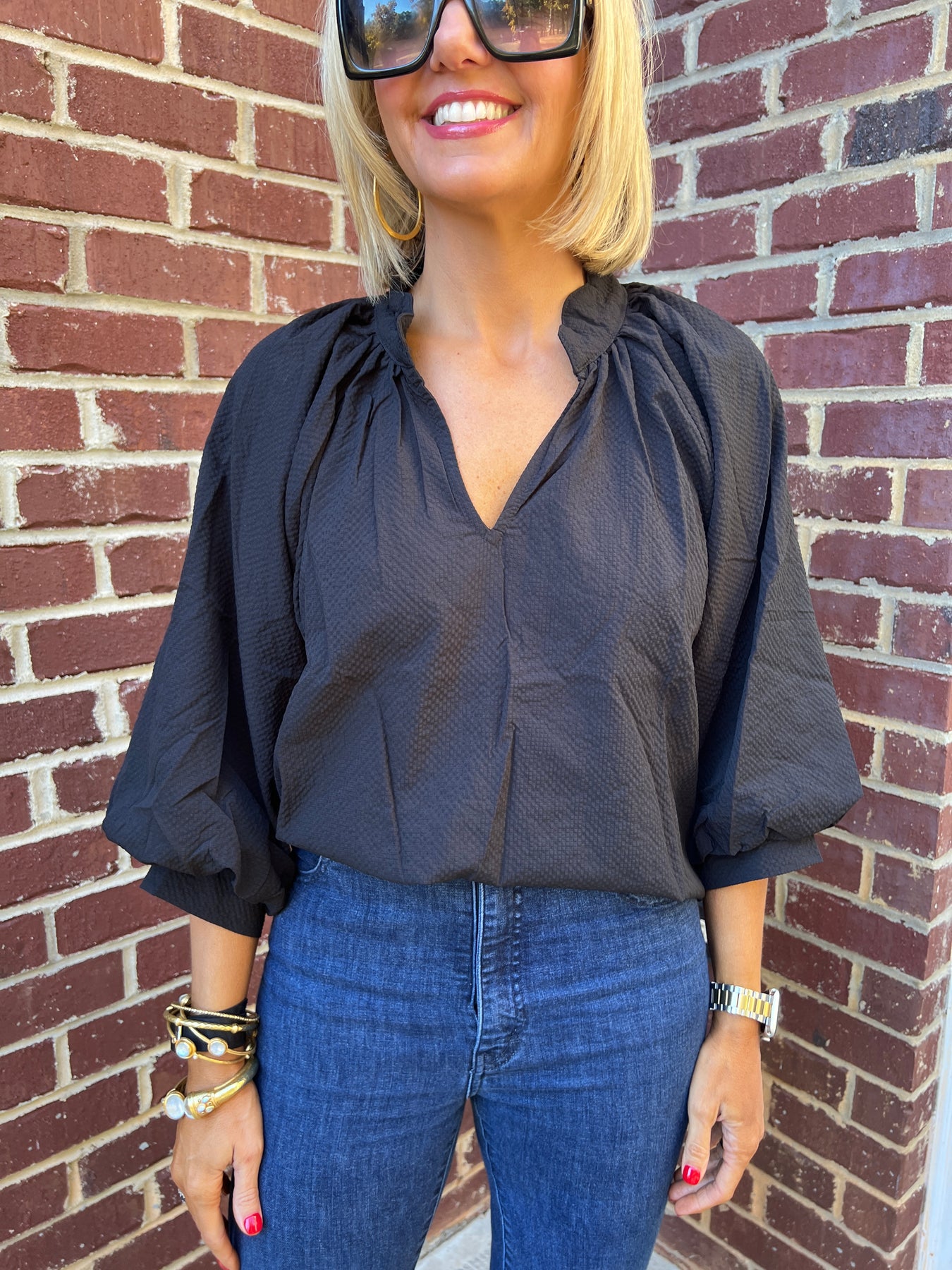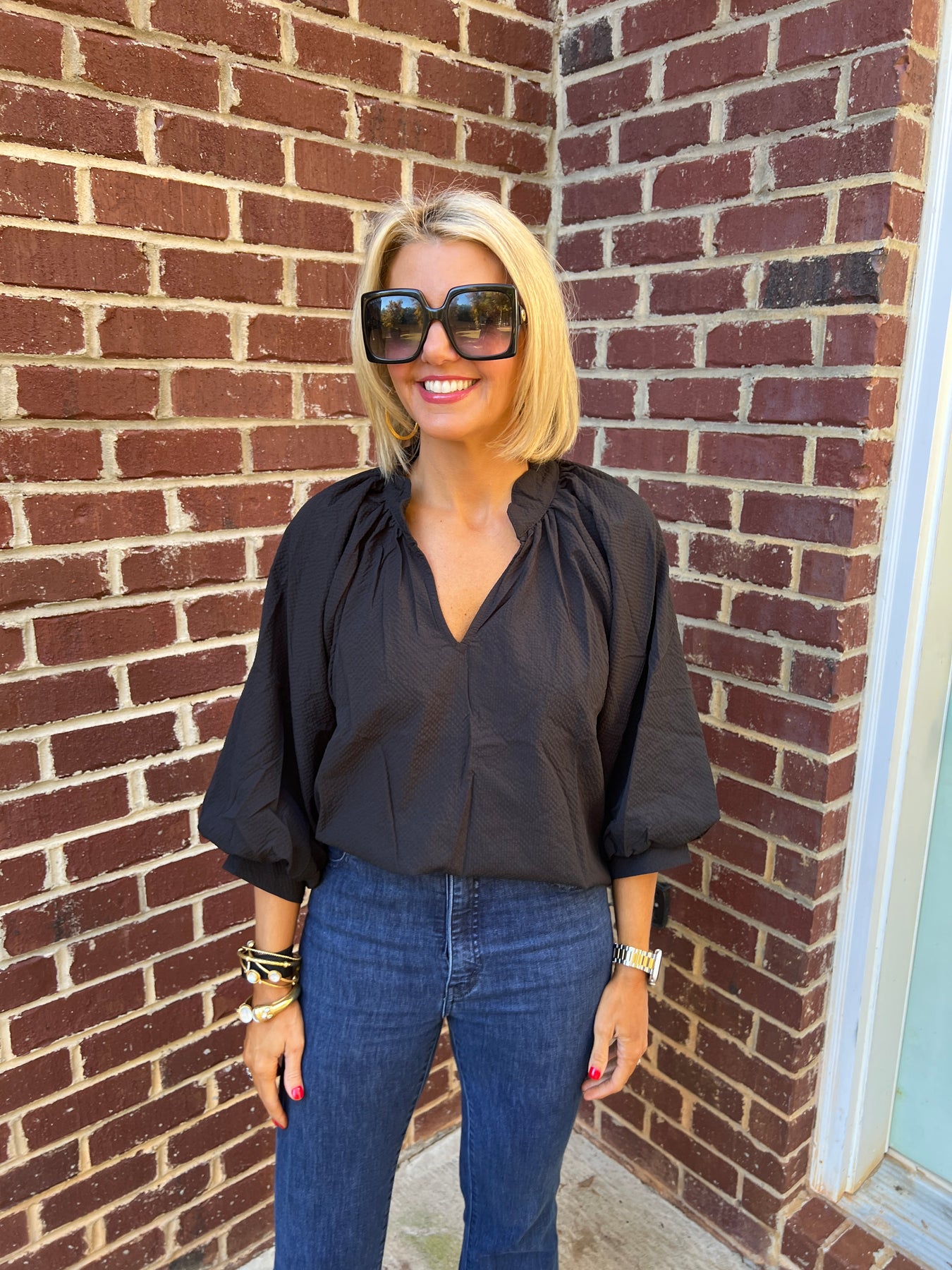 Elevate your wardrobe with this striking black split V-neck top, designed to turn heads with its dramatic balloon sleeves. The deep V-neckline creates a flattering silhouette while the voluminous sleeves add contemporary flair and movement to every outfit. Perfect for dressing up casual jeans or pairing with tailored trousers, this versatile piece transitions seamlessly from day to night. The rich black hue pairs effortlessly with any color palette, making it an essential addition to your closet. Whether you're heading to brunch, the office, or an evening out, this top delivers style and confidence with every wear.