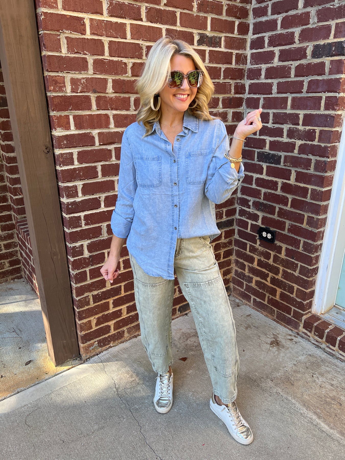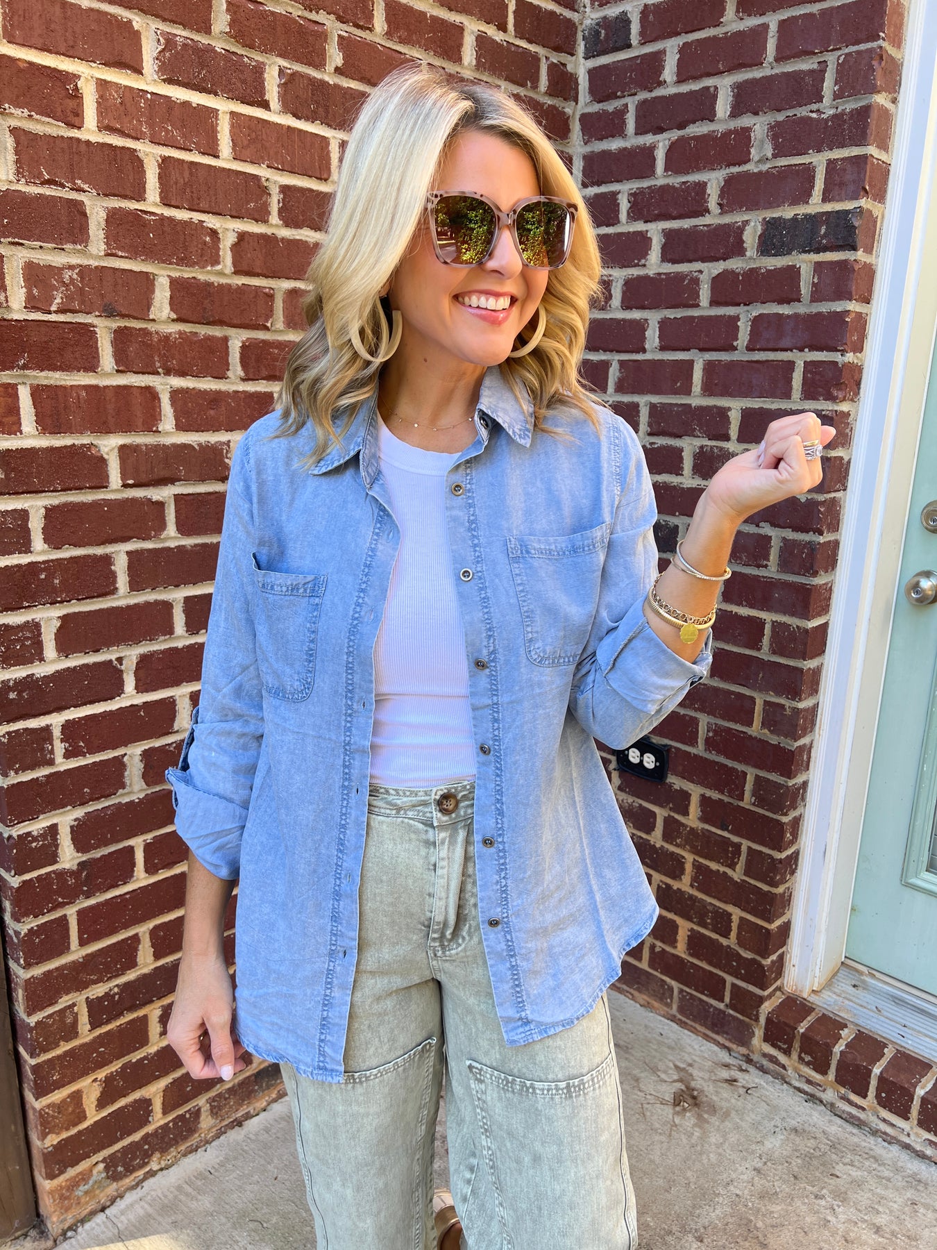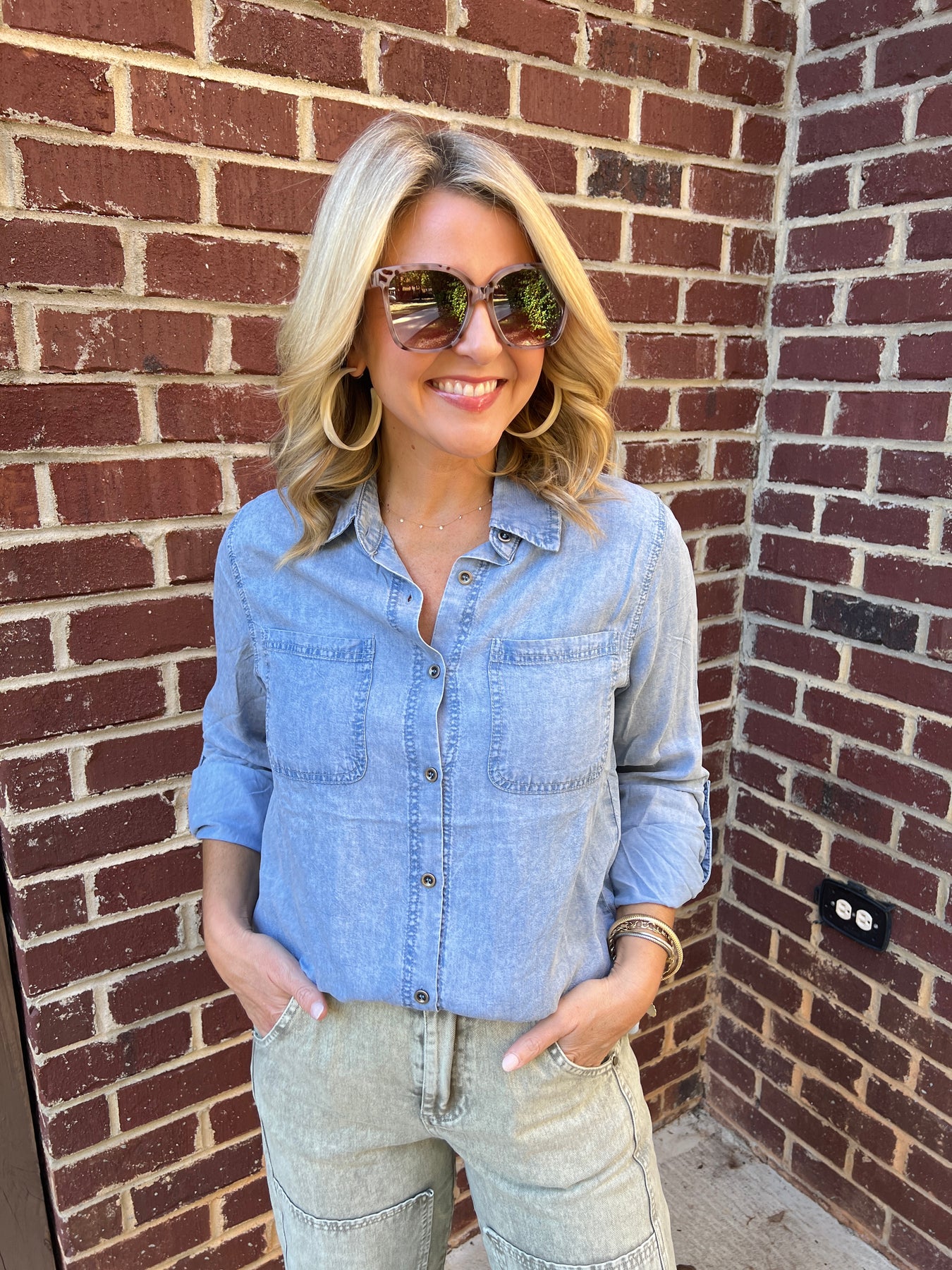Elevate your everyday wardrobe with this versatile chambray shirt, a timeless piece that effortlessly transitions from casual to polished. Crafted from breathable chambray fabric, it offers comfort and durability for all-day wear. Practical front pockets keep your essentials within reach, while the classic design pairs seamlessly with jeans, chinos, or skirts. Whether you're dressing down for the weekend or layering for the office, this shirt delivers style and functionality that works as hard as you do.