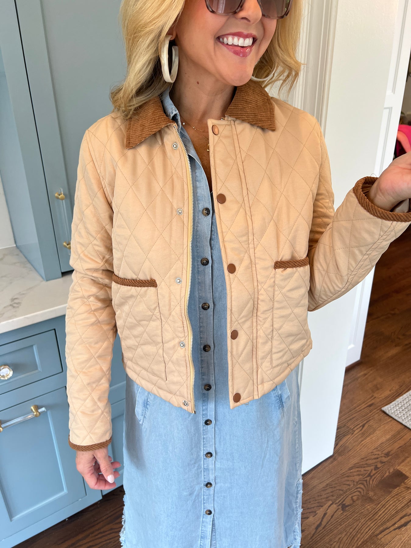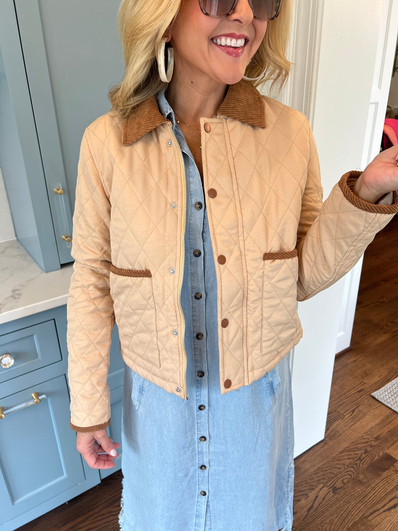 Stay warm and stylish with this Corduroy Collar Quilted Jacket. Its classic quilted design offers excellent insulation, while the soft corduroy collar adds a touch of timeless charm. Perfect for layering on chilly days, this jacket combines comfort and durability, making it an essential addition to your wardrobe. Whether you're heading out for a casual day or evening stroll, it keeps you cozy without compromising on style.