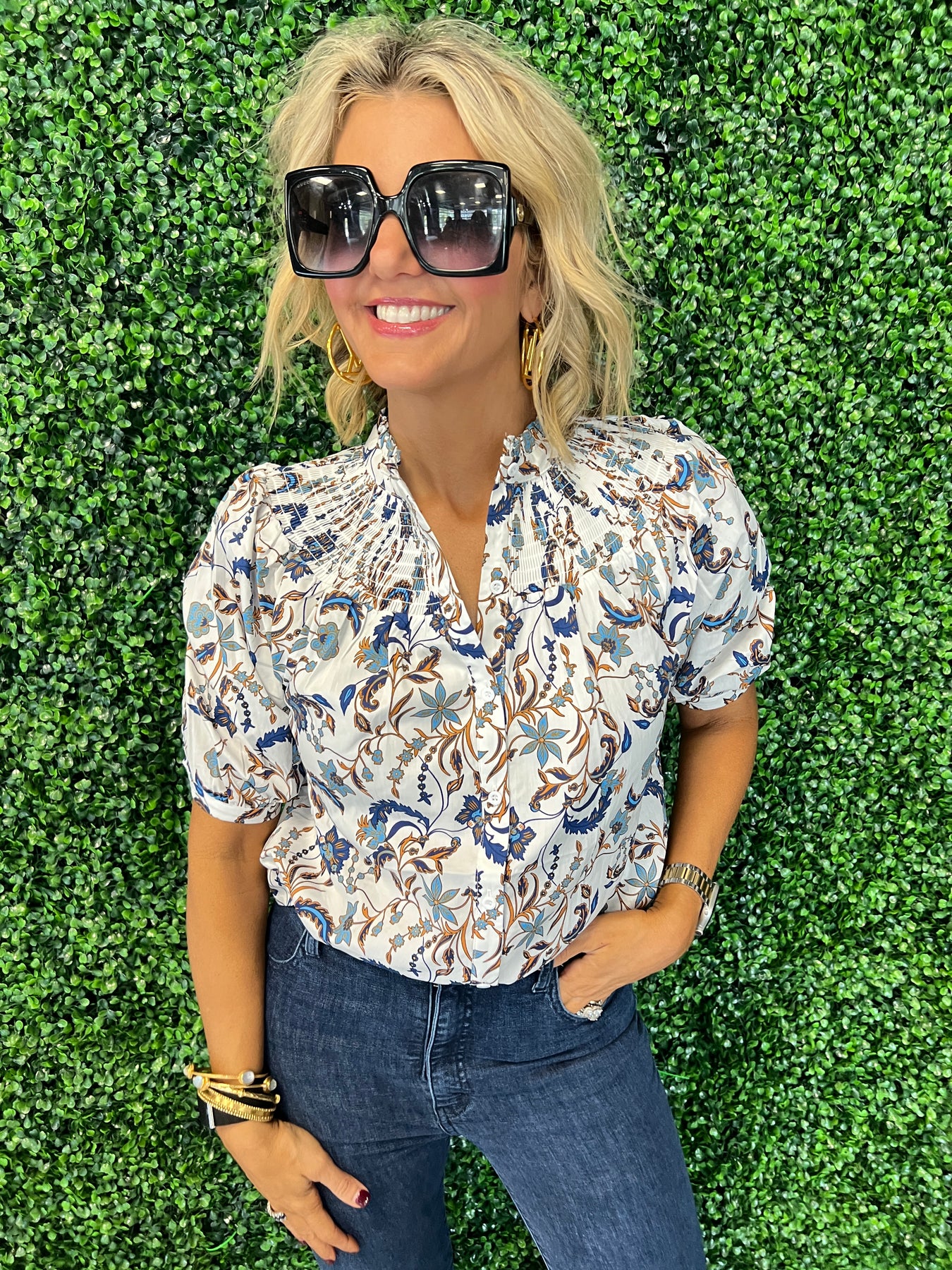 Elevate your style with the Floral Blossom Smocked Mock Neck Top, designed to combine comfort and elegance. The smocked bodice offers a flattering fit, while the delicate floral pattern adds a fresh, feminine touch. Its mock neck design ensures a chic look perfect for both casual outings and dressier occasions. Lightweight and breathable, this top keeps you comfortable all day long. Refresh your wardrobe with a piece that effortlessly blends classic charm and modern flair.