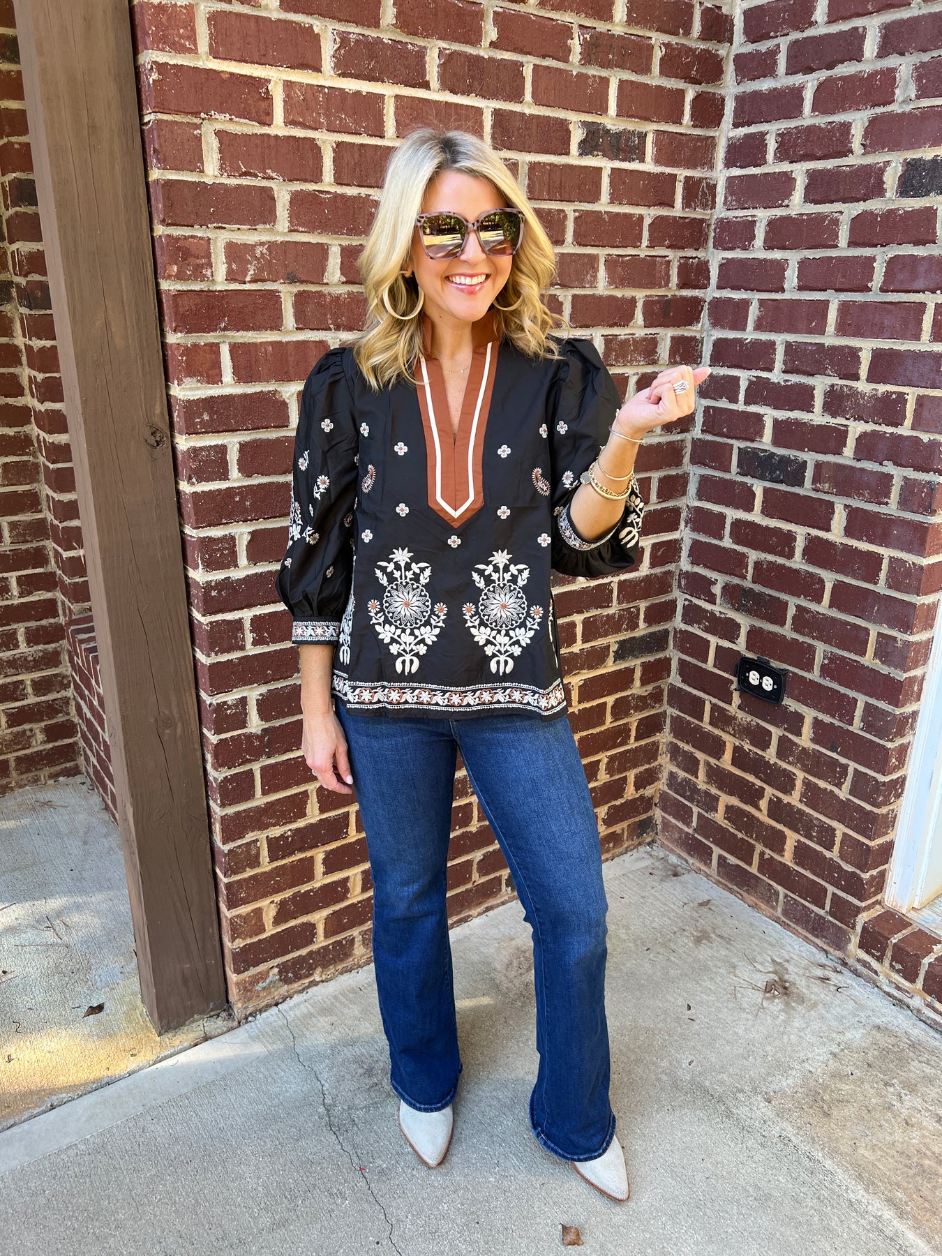 Elevate your wardrobe with this charming floral embroidered top, featuring romantic 3/4 puff sleeves that add instant sophistication to any outfit. The delicate embroidery brings artisanal detail and visual interest, while the voluminous sleeves create a flattering silhouette that works beautifully for both casual and dressed-up occasions. Perfect for layering or wearing solo, this versatile piece transitions seamlessly from season to season. Whether you're heading to brunch, the office, or a weekend gathering, this top delivers effortless style with a touch of feminine elegance that sets you apart from the crowd.
