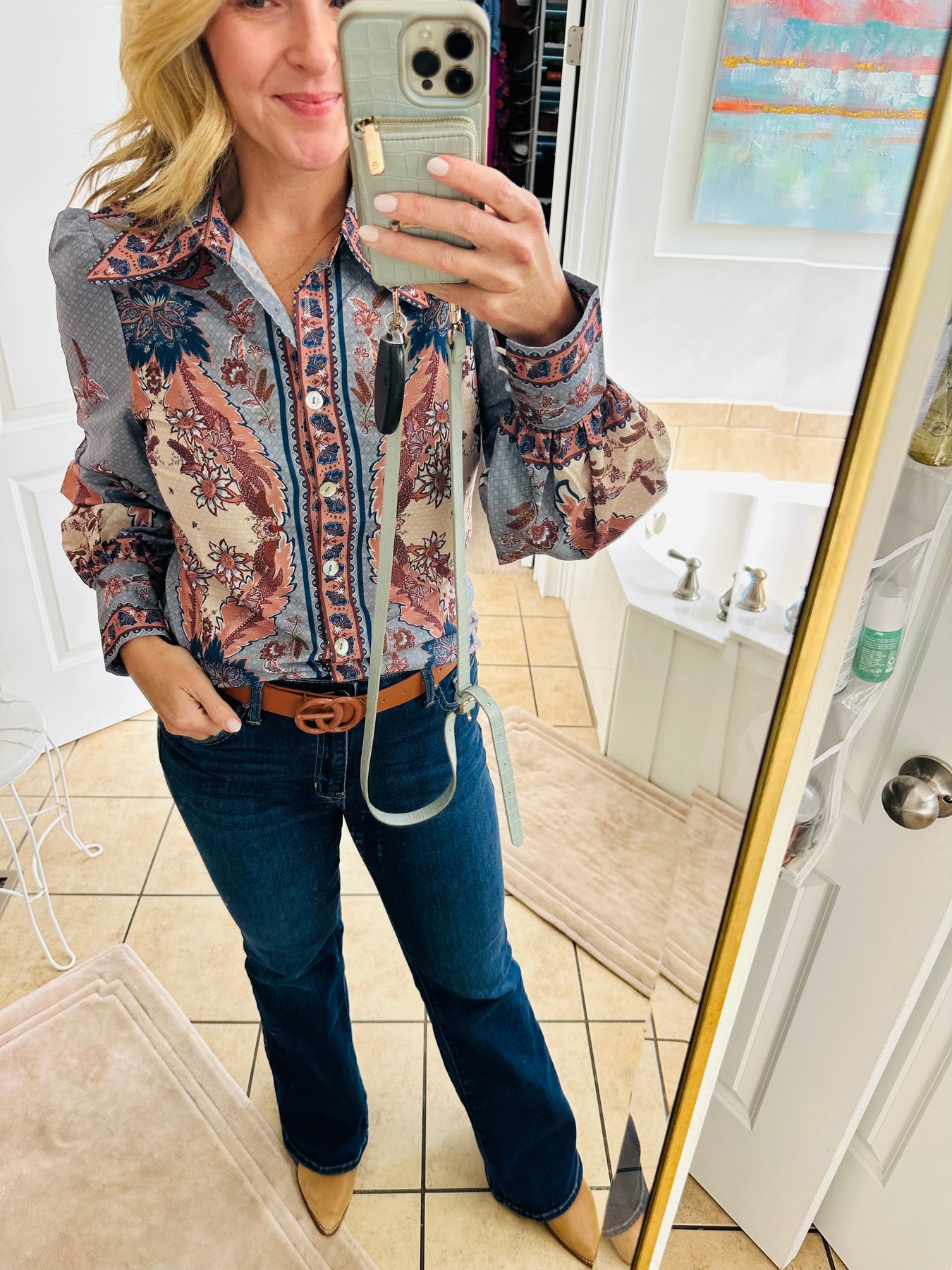 Elevate your wardrobe with this Floral Print Long Sleeve Blouse, featuring a captivating abstract floral design that adds a fresh, artistic touch to any outfit. Crafted for comfort and style, its lightweight fabric and flattering fit make it perfect for both work and weekend wear. Embrace effortless elegance and let this blouse become your go-to piece for a chic, confident look.