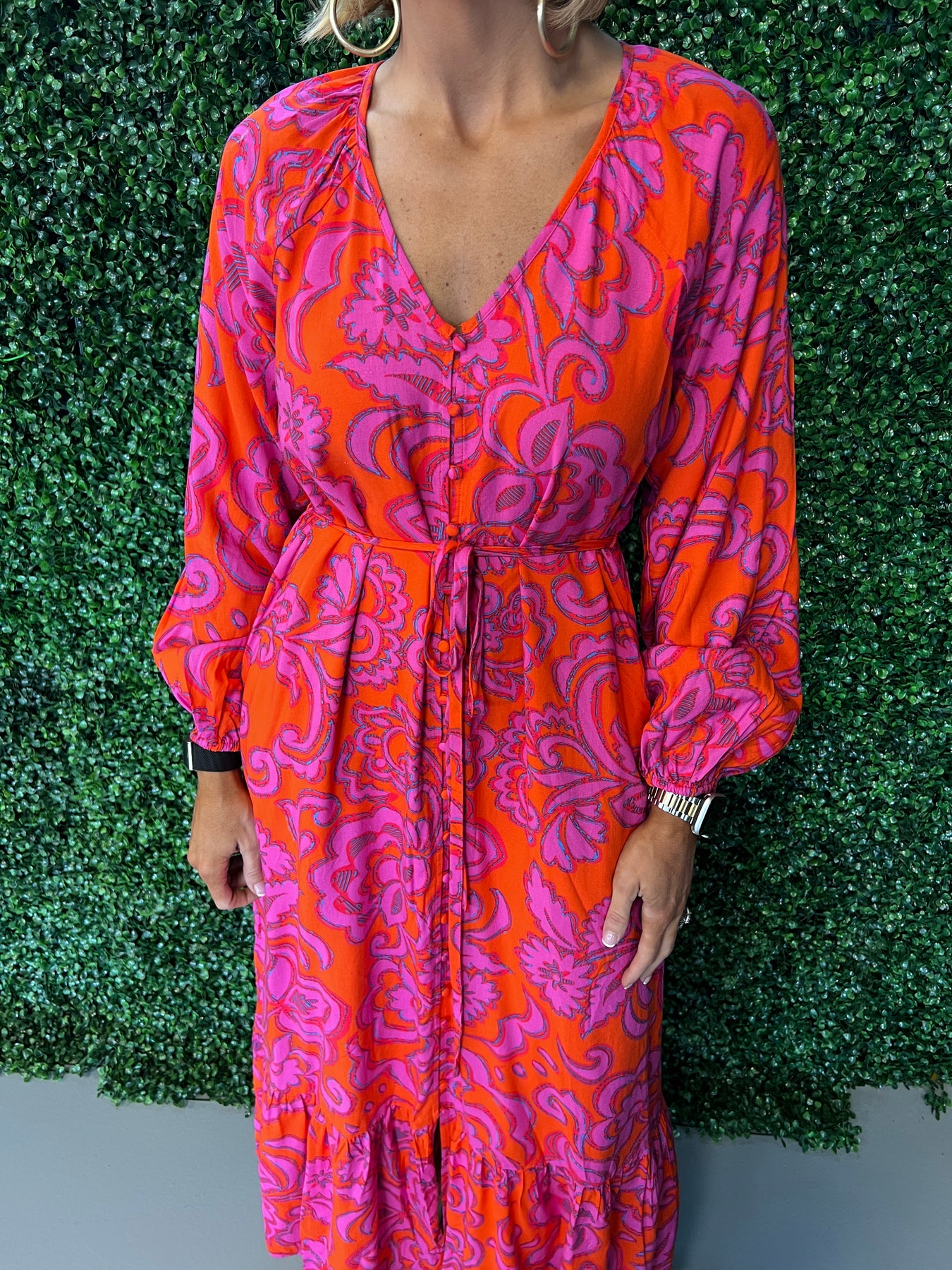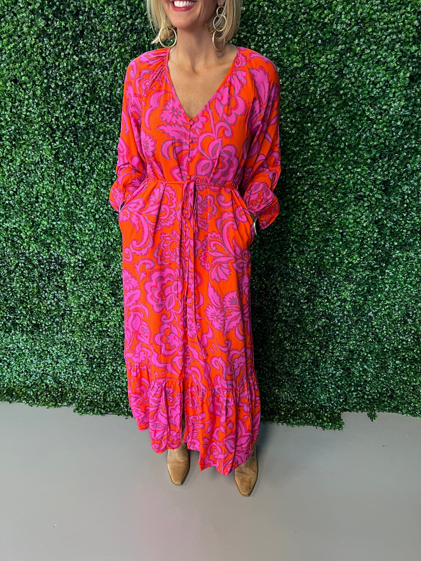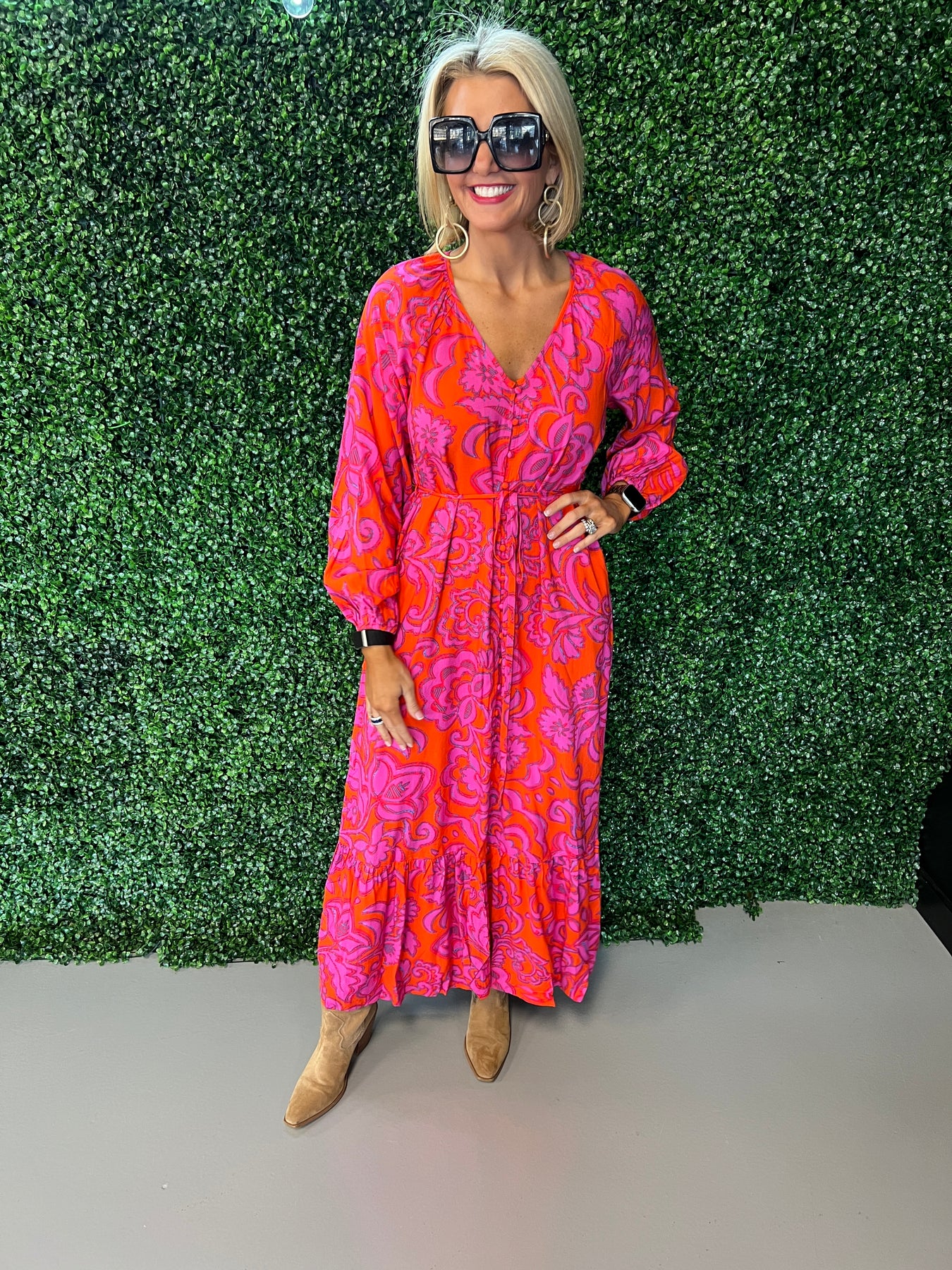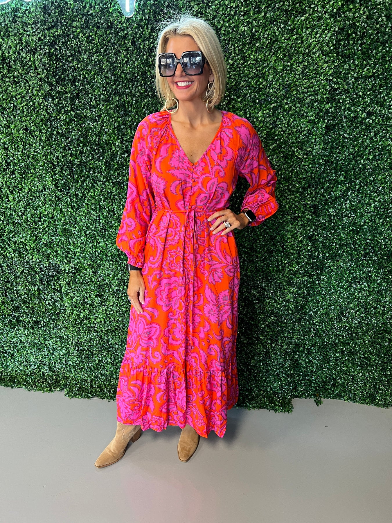 Make a statement in this stunning fuchsia floral button-down maxi dress. The vibrant botanical print commands attention while the classic button-front silhouette keeps things timeless and versatile. Perfect for everything from garden parties to casual weekend outings, this piece transitions effortlessly from day to night. The flowing maxi length offers elegant coverage and movement, while the structured button-down design provides a polished, put-together look. Elevate your wardrobe with a dress that combines bold color, feminine charm, and everyday wearability.