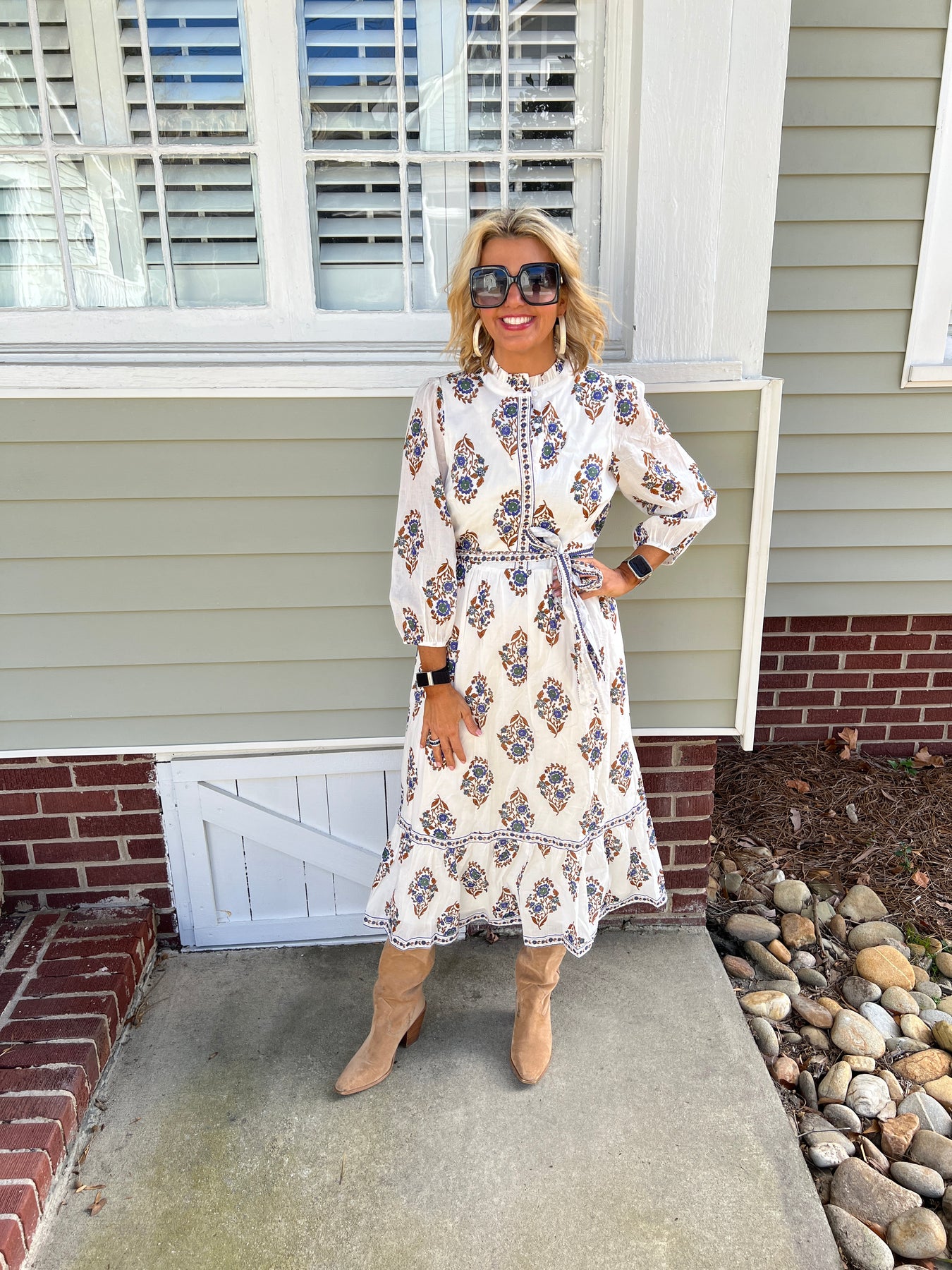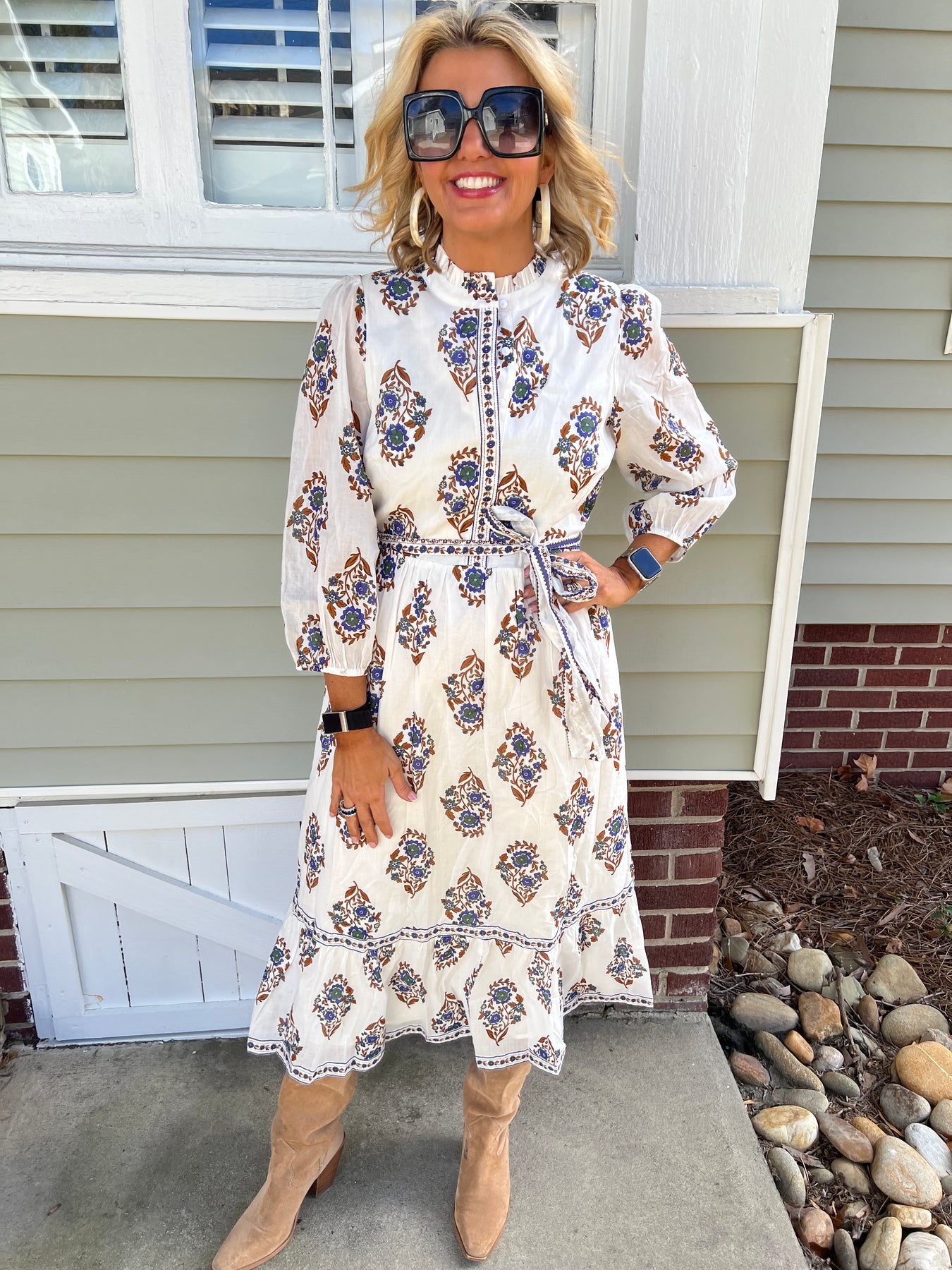Elevate your everyday wardrobe with the Rennie Floral Long Sleeve Midi Dress—a timeless piece that effortlessly transitions from season to season. The enchanting floral print brings natural beauty and movement to your look, while the midi length offers a sophisticated silhouette that flatters every frame. Long sleeves provide versatile coverage, making it perfect for layering or wearing solo. Whether you're heading to brunch, a casual date, or weekend gatherings, this dress delivers comfort without compromising on style. A wardrobe essential that works as hard as you do.