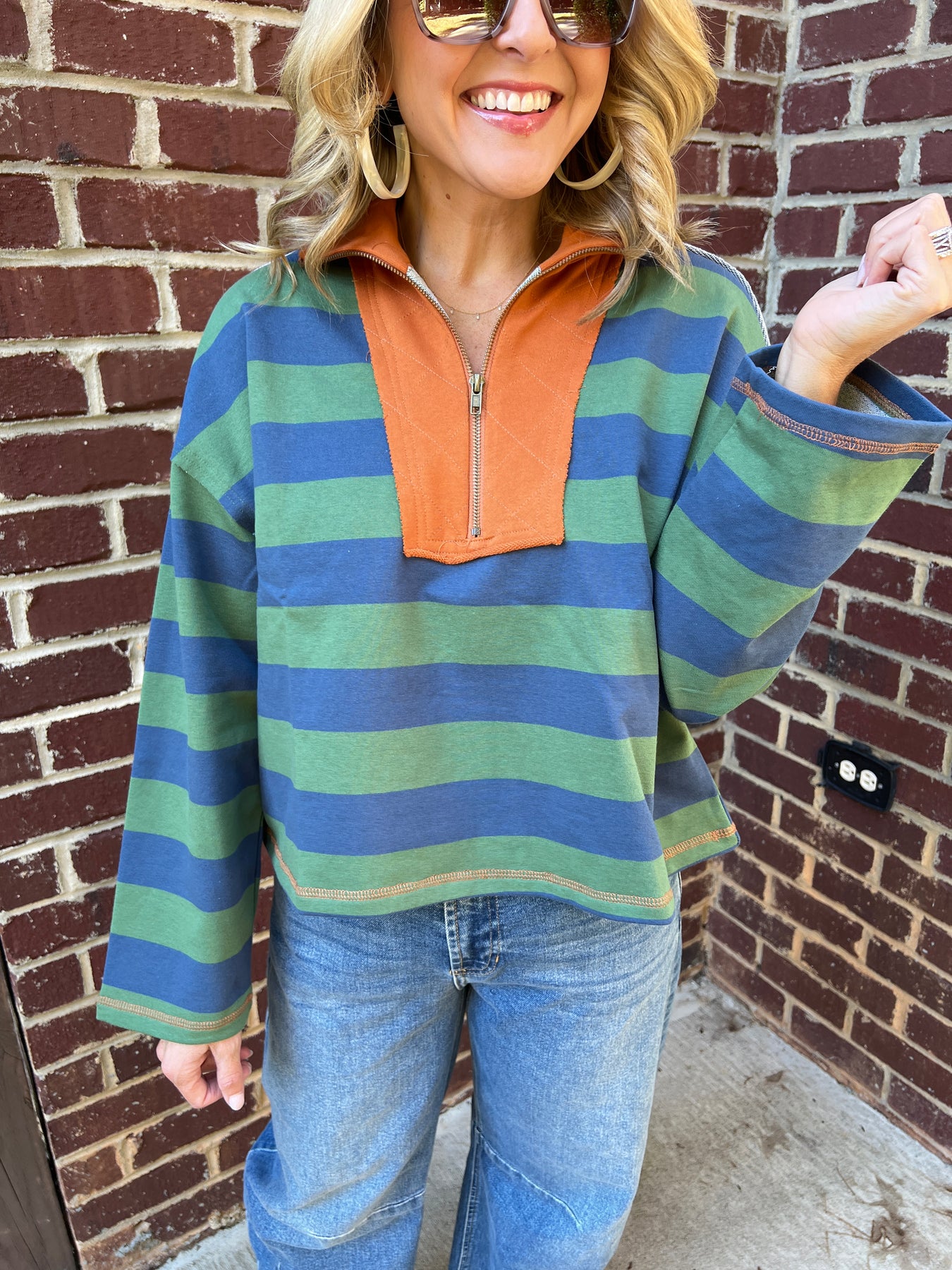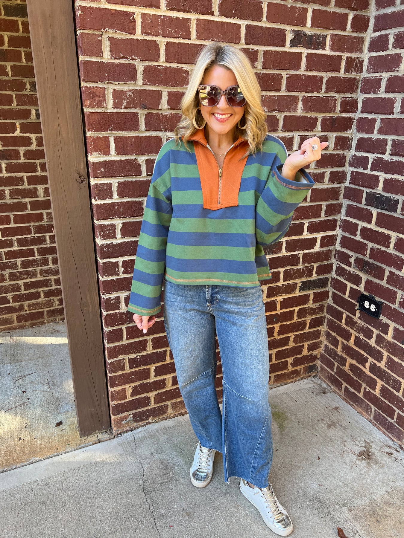 Elevate your casual wardrobe with this versatile striped quarter-zip sweatshirt, designed for effortless style and comfort. The eye-catching contrast collar adds a polished touch that transitions seamlessly from weekend lounging to casual office settings. The quarter-zip construction offers easy layering and temperature control, while the classic striped pattern ensures you'll reach for it season after season. Crafted for durability and all-day wearability, this sweatshirt is the perfect foundation piece for building countless outfits.