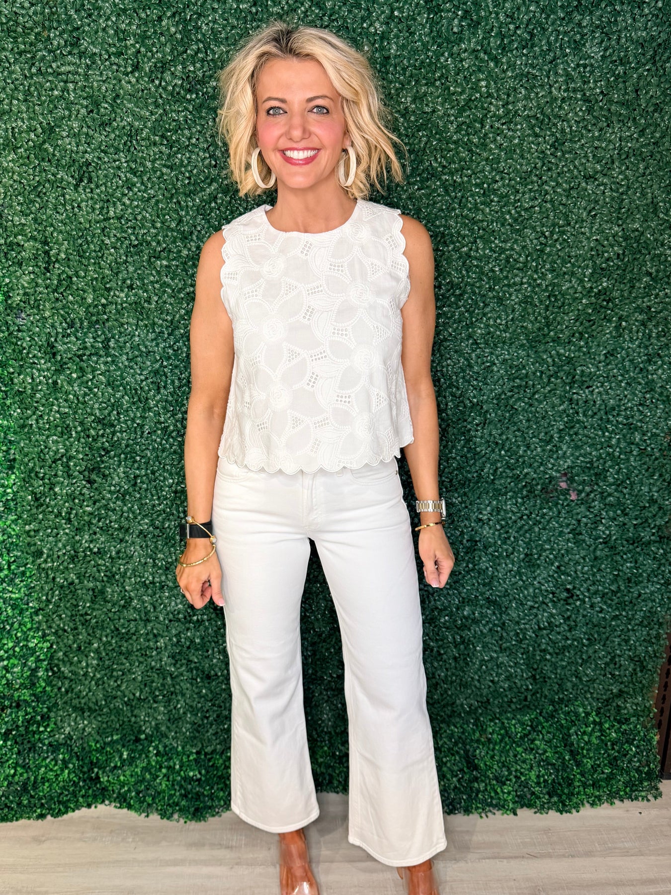 Elevate your wardrobe with this charming White Eyelet Scallop Edge Top, a timeless piece that effortlessly transitions from casual to polished. The delicate eyelet detailing and graceful scalloped edges create an undeniably feminine silhouette that flatters every figure. Perfect for spring brunches, weekend outings, or layering under your favorite blazer, this versatile top pairs beautifully with denim, skirts, or tailored trousers. The crisp white hue ensures endless styling possibilities while the intricate fabric work adds visual interest and sophistication. Invest in a piece that combines classic elegance with modern appeal—a wardrobe essential you'll reach for season after season.