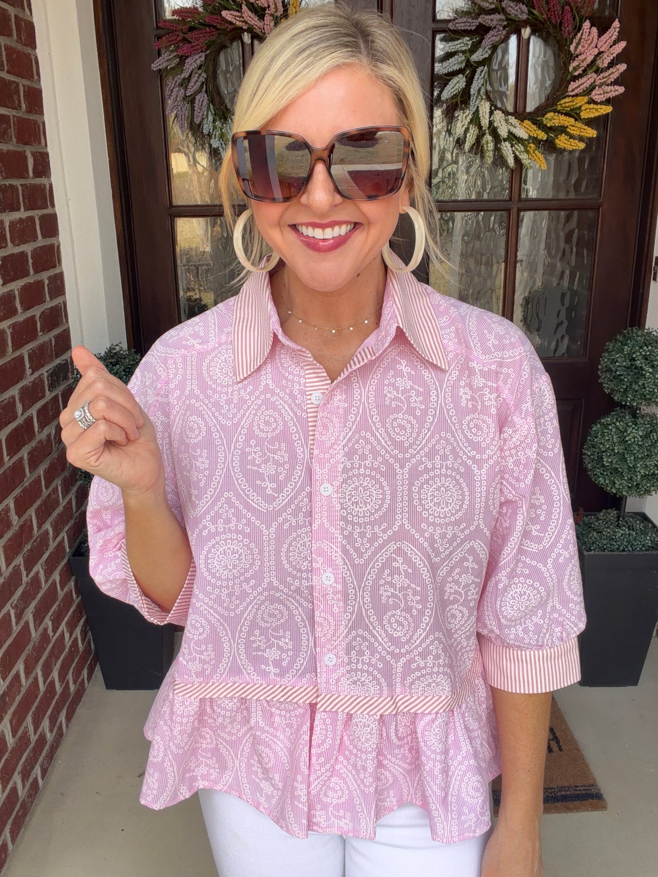 Effortless style meets everyday comfort in this versatile 3/4 sleeve button down top. The cropped sleeves offer a modern silhouette perfect for layering or wearing solo, while the classic button front allows for easy styling options. Crafted for a flattering fit, this wardrobe essential transitions seamlessly from casual weekends to professional settings. Whether dressed up with tailored pants or down with your favorite jeans, this piece delivers timeless appeal with contemporary flair.
