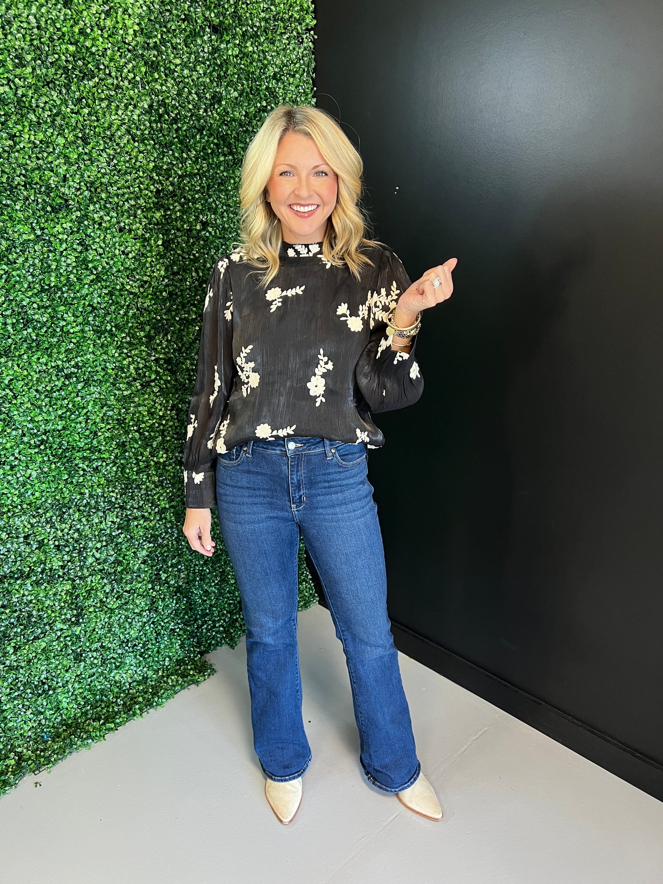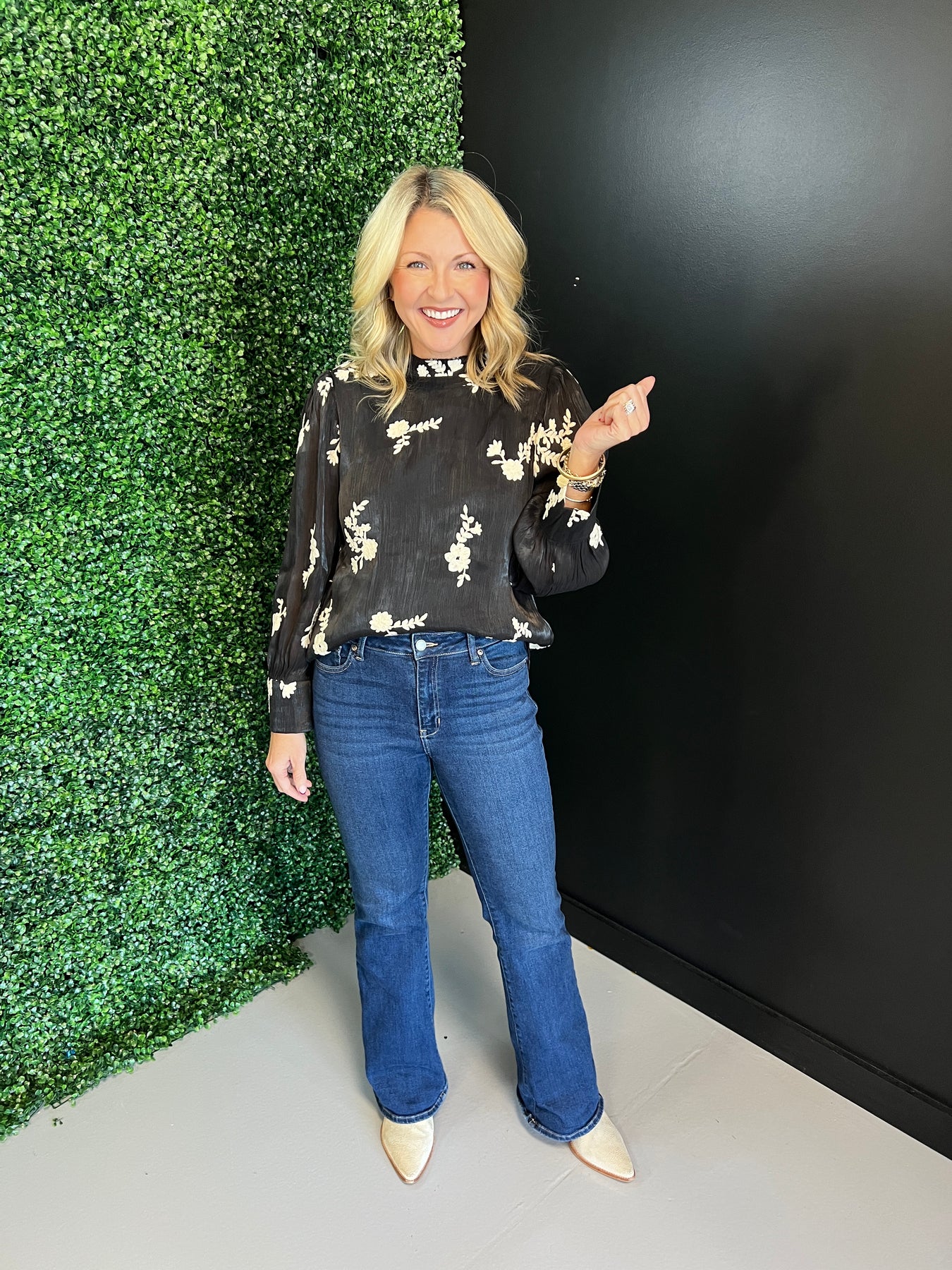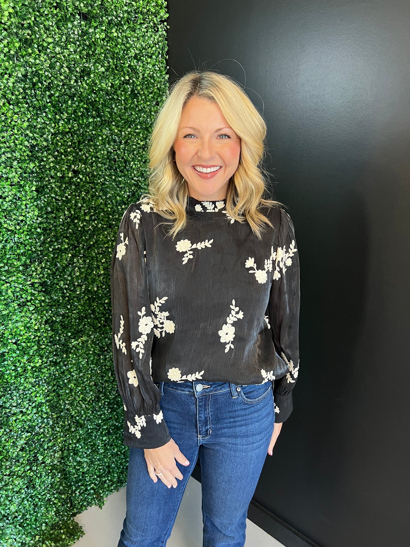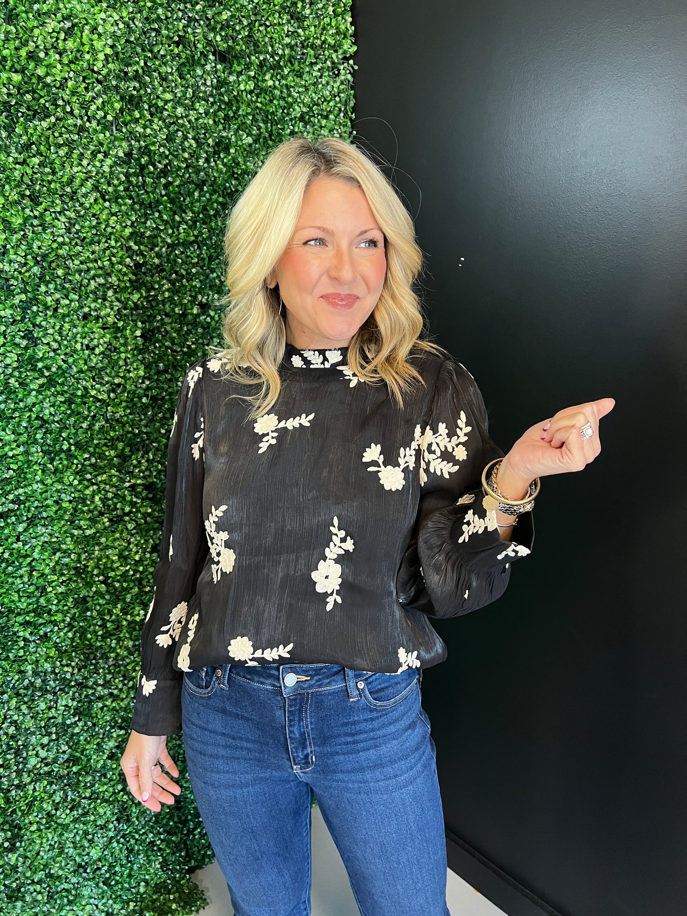 Elevate your everyday wardrobe with this striking black long sleeve featuring delicate flower embroidery. The intricate floral detailing adds a touch of sophistication and artistry to a timeless silhouette, making it perfect for layering or wearing solo. Crafted for comfort and style, this versatile piece transitions seamlessly from casual outings to more polished occasions. The classic black base ensures easy pairing with any bottoms in your collection, while the embroidered florals make a subtle yet memorable statement. A wardrobe essential that combines understated elegance with eye-catching detail.
