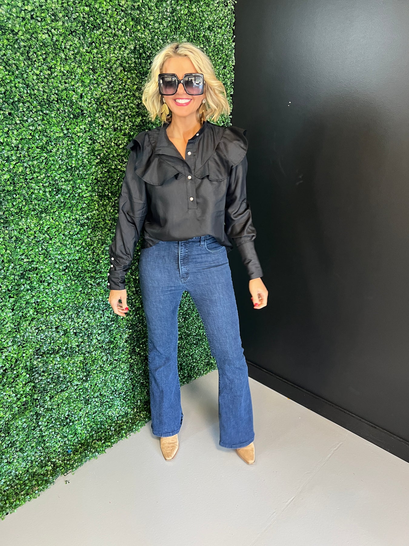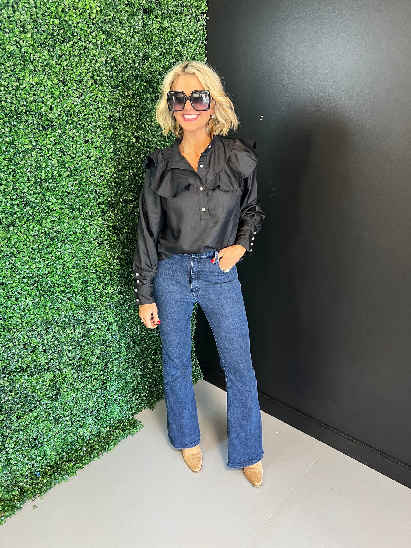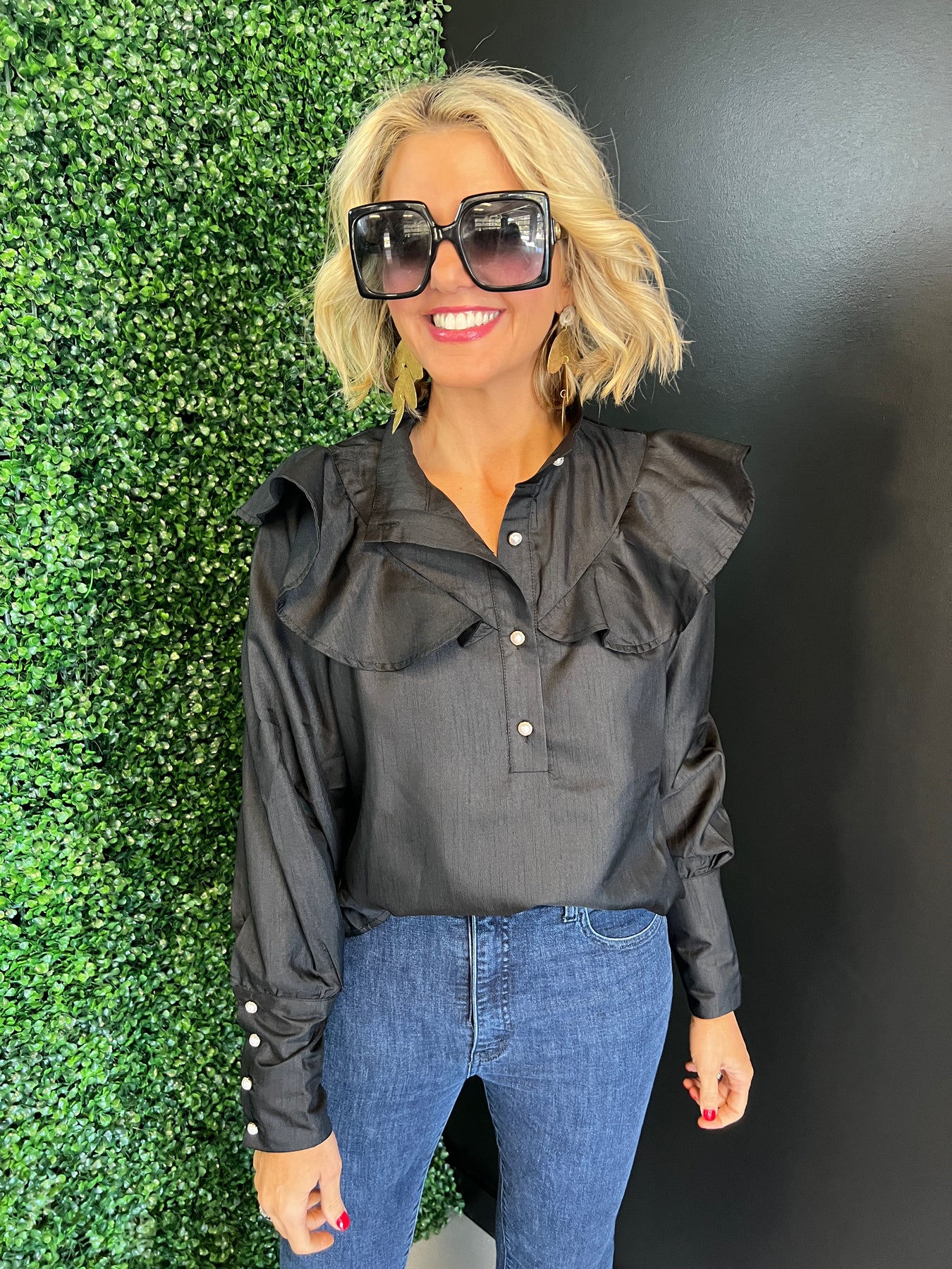Elevate your wardrobe with this Black Ruffle Detail Collar Blouse. Featuring elegant ruffle accents and a classic collar, it blends timeless style with modern flair. Perfect for work or evening outings, its flattering silhouette and sleek black fabric ensure you look effortlessly polished and confident. Make a sophisticated statement with this versatile blouse that pairs beautifully with both skirts and trousers.