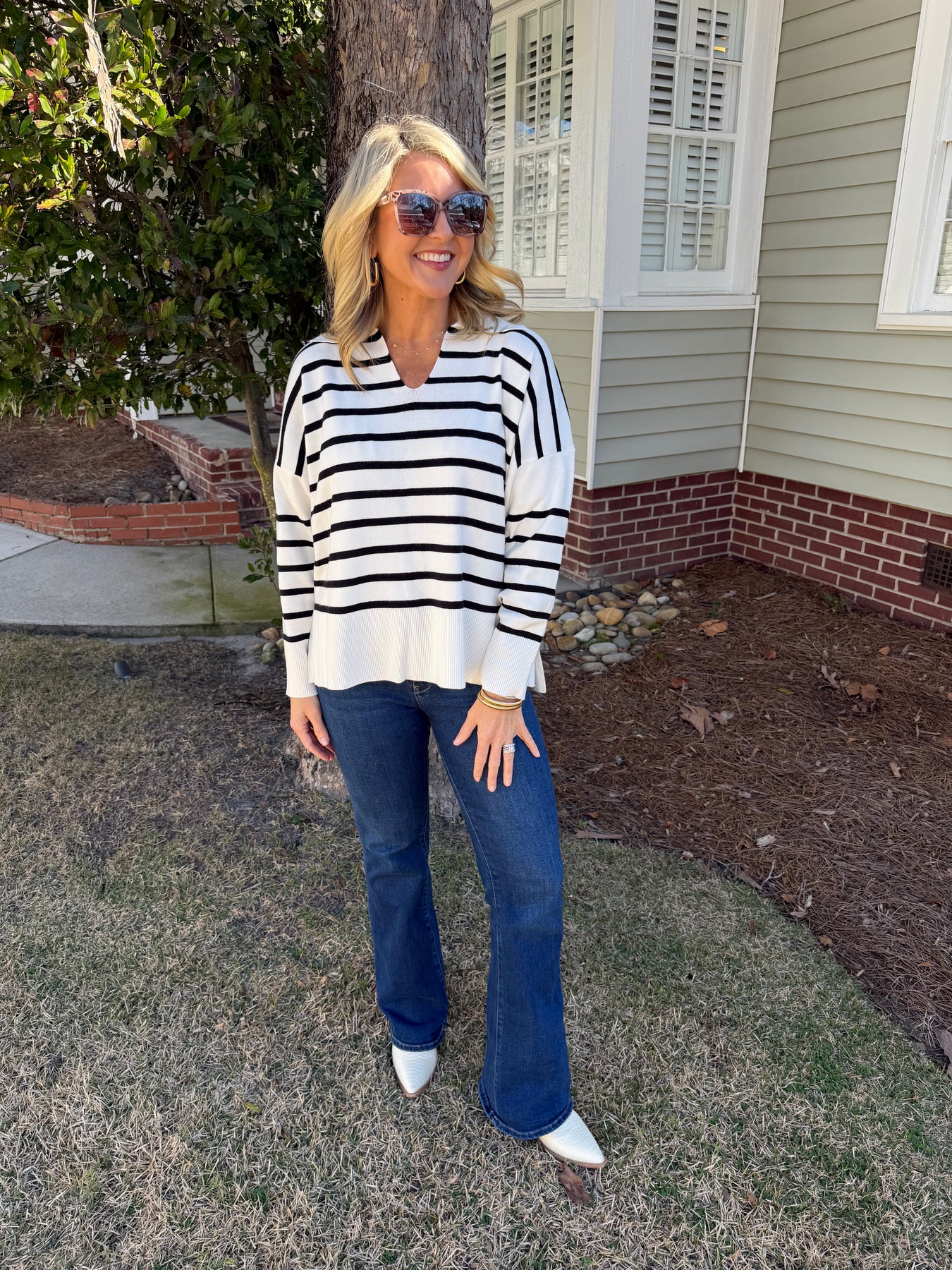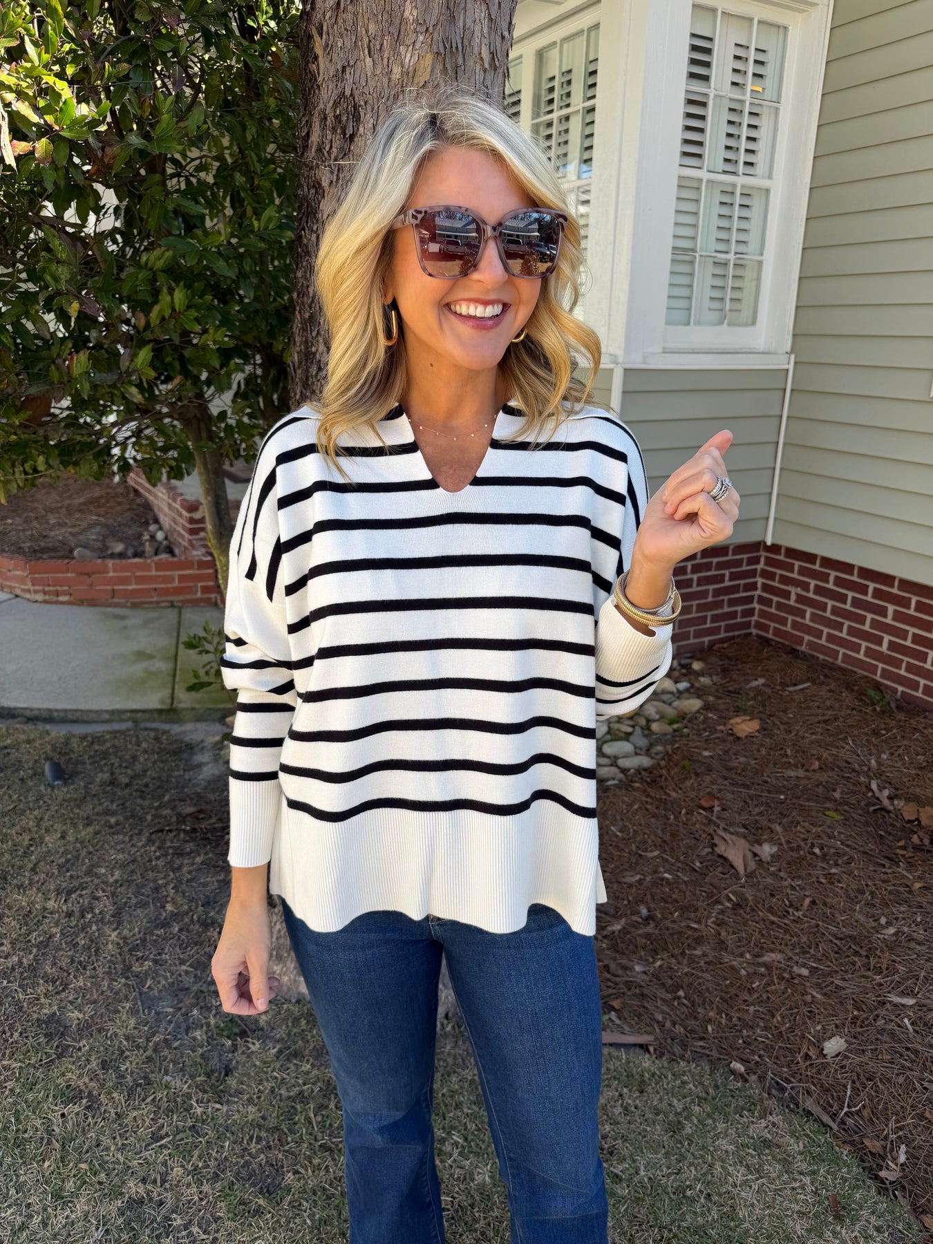 Elevate your everyday wardrobe with this timeless Black & White Striped Collared Sweater. The classic stripe pattern pairs effortlessly with virtually any outfit, while the structured collar adds polish and sophistication. Crafted for comfort and versatility, this piece transitions seamlessly from casual weekends to professional settings. Whether layered under a blazer or worn solo, it's the essential sweater that works as hard as you do. A wardrobe staple that never goes out of style.