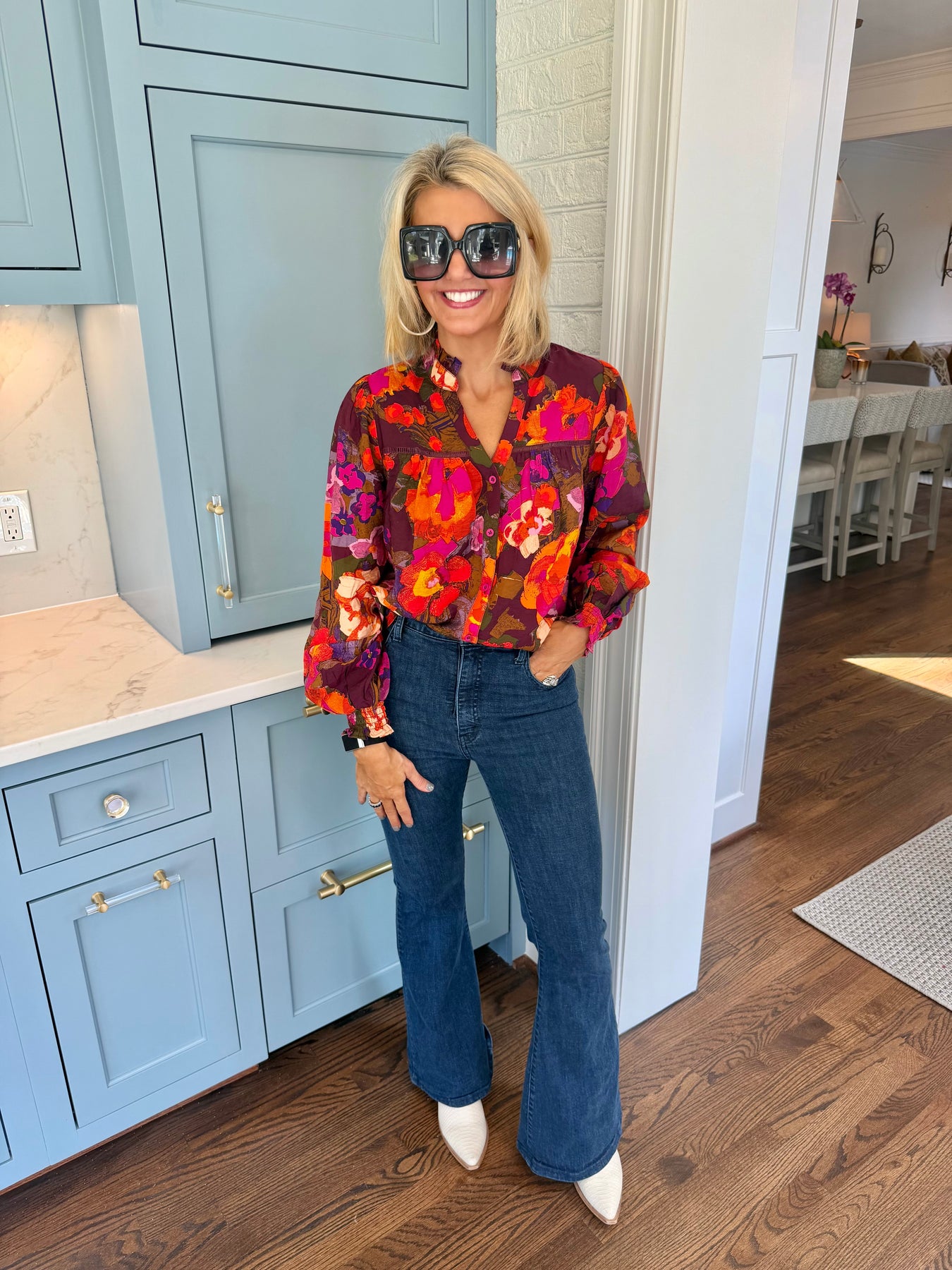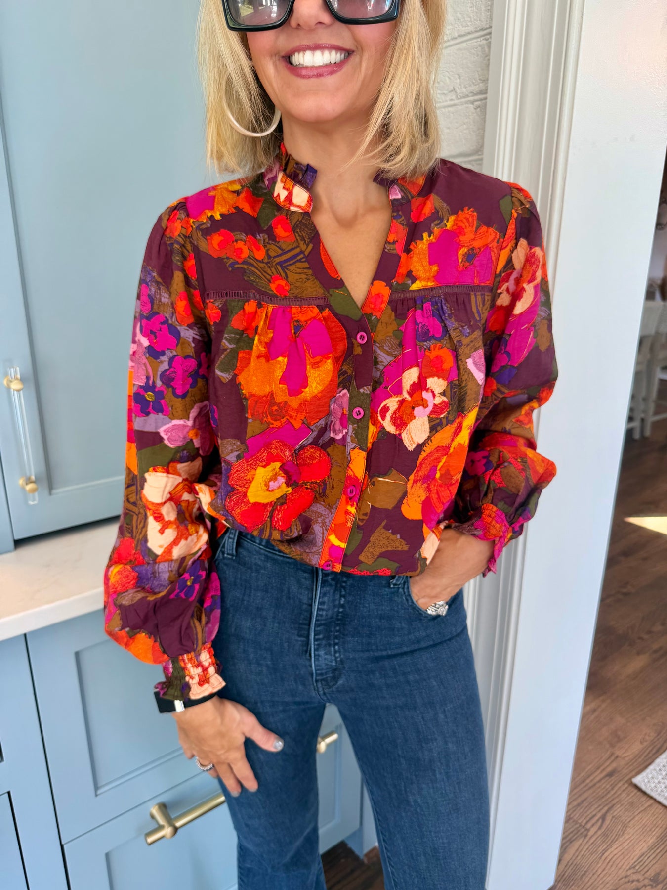 Elevate your wardrobe with this Floral Button-Down Ruffled V-Neck Blouse, designed to blend feminine charm with effortless style. Its delicate floral pattern and ruffled detailing add a touch of romance, while the V-neck enhances your silhouette. Perfect for both casual outings and office wear, this blouse offers a flattering fit and easy button-down closure for versatile styling. Make every day a little more elegant with this must-have piece.
