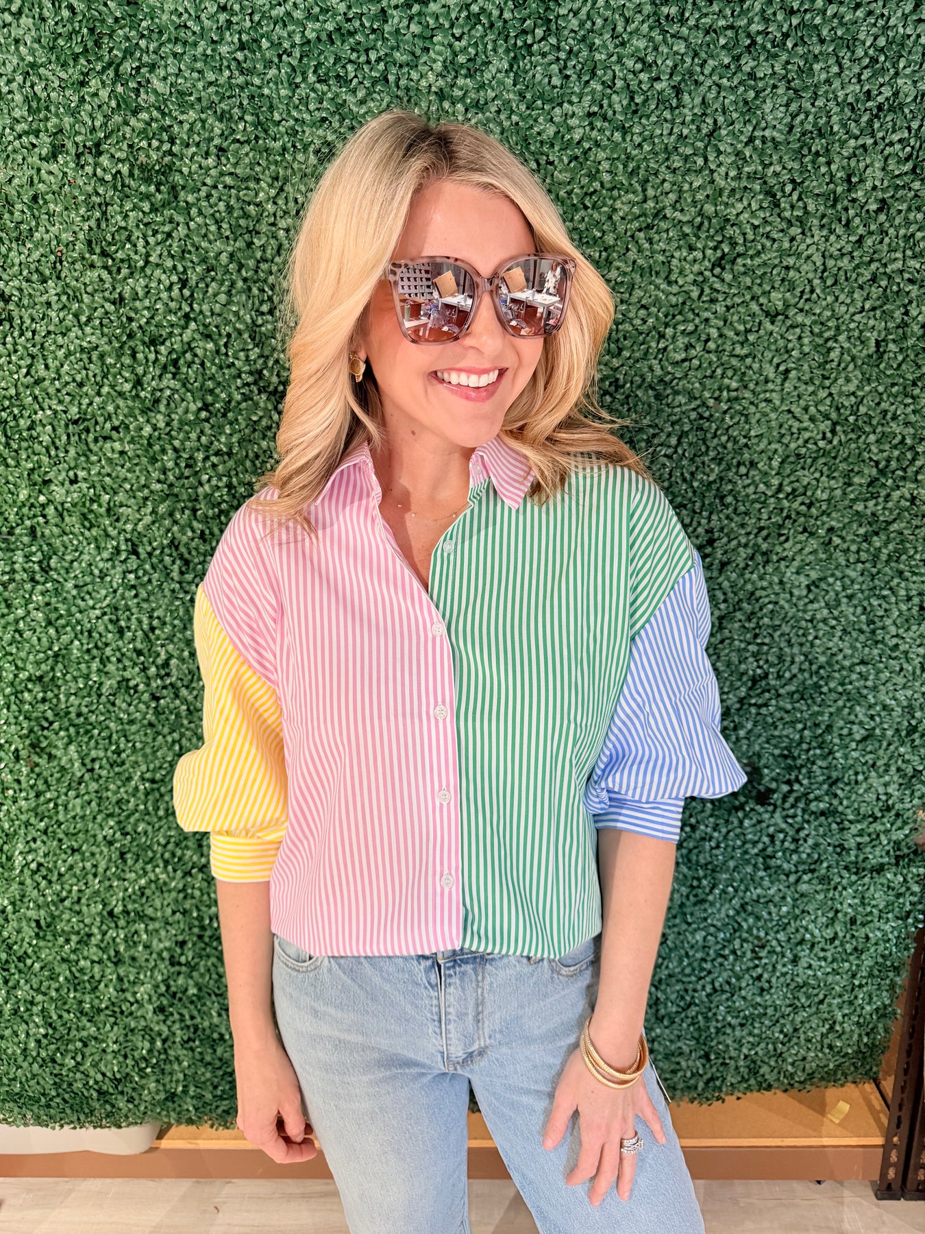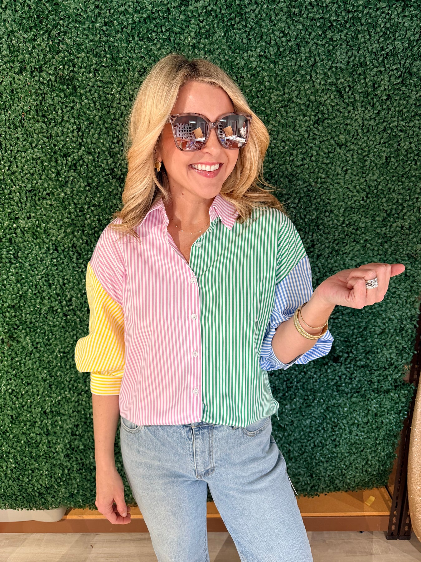 Make a statement with this vibrant Multi Color Block Stripe Button Down Shirt Top. Bold color blocking and dynamic stripes create eye-catching visual interest, while the classic button-down silhouette keeps it versatile enough for any occasion. Perfect for layering or wearing solo, this piece transitions seamlessly from casual weekends to polished workdays. The structured fit flatters your frame while the breathable fabric ensures all-day comfort. Elevate your wardrobe with a top that combines contemporary style with timeless appeal.