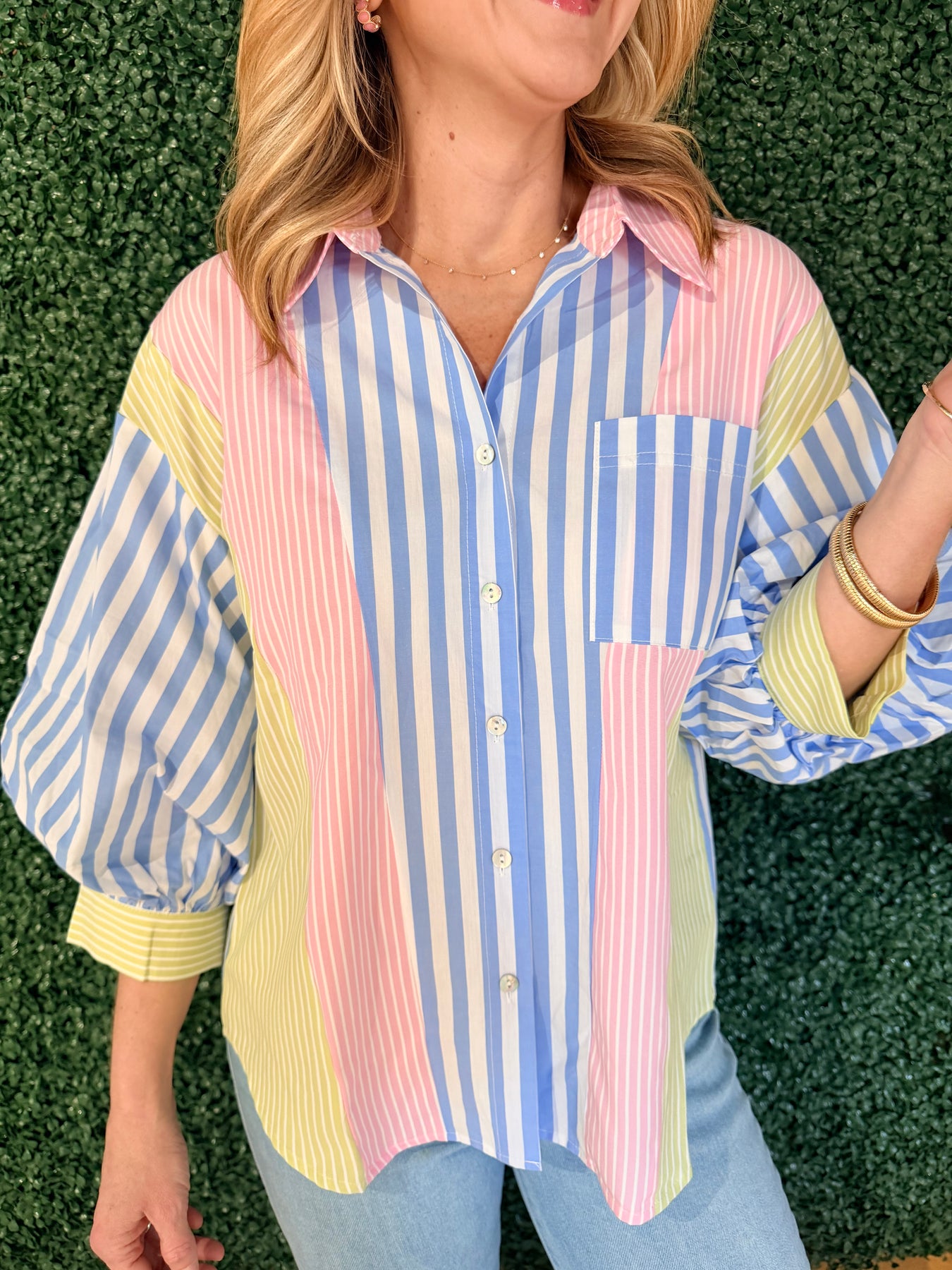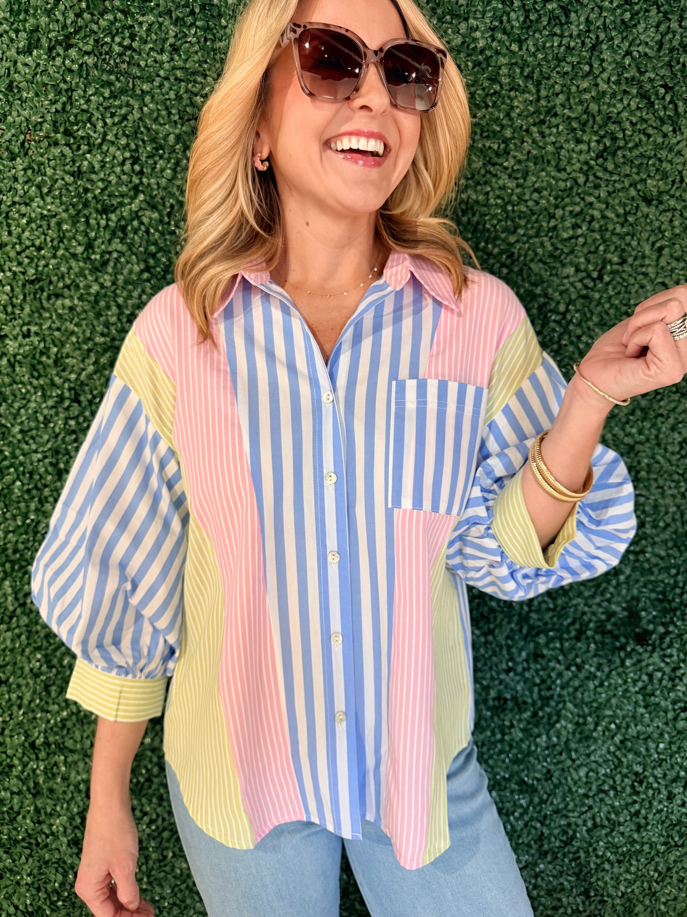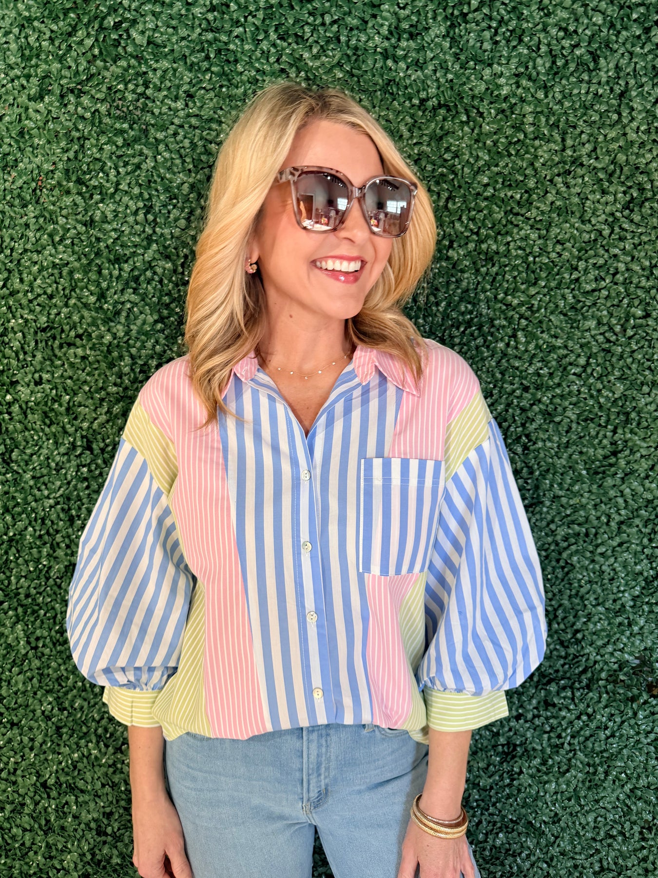 Elevate your everyday wardrobe with this versatile stripe button-down top. The classic striped pattern pairs effortlessly with your favorite jeans, skirts, or trousers, making it a go-to piece for work, weekend outings, or casual gatherings. Crafted for comfort and style, this top features a timeless design that transcends seasonal trends. The button-down front offers easy layering options, while the structured fit flatters various body types. Whether you're dressing up or down, this striped essential delivers polished sophistication without sacrificing comfort. A wardrobe staple that works as hard as you do.