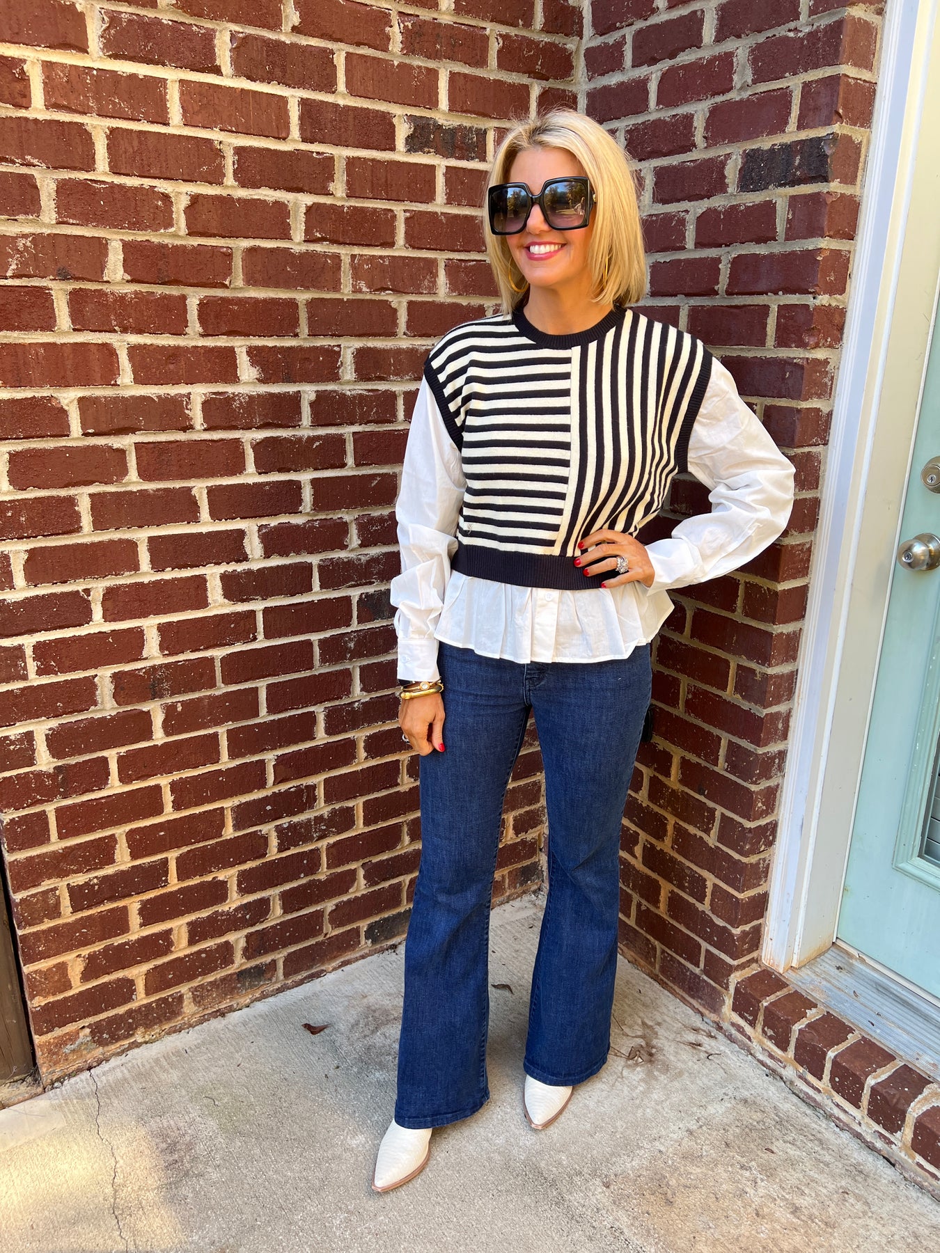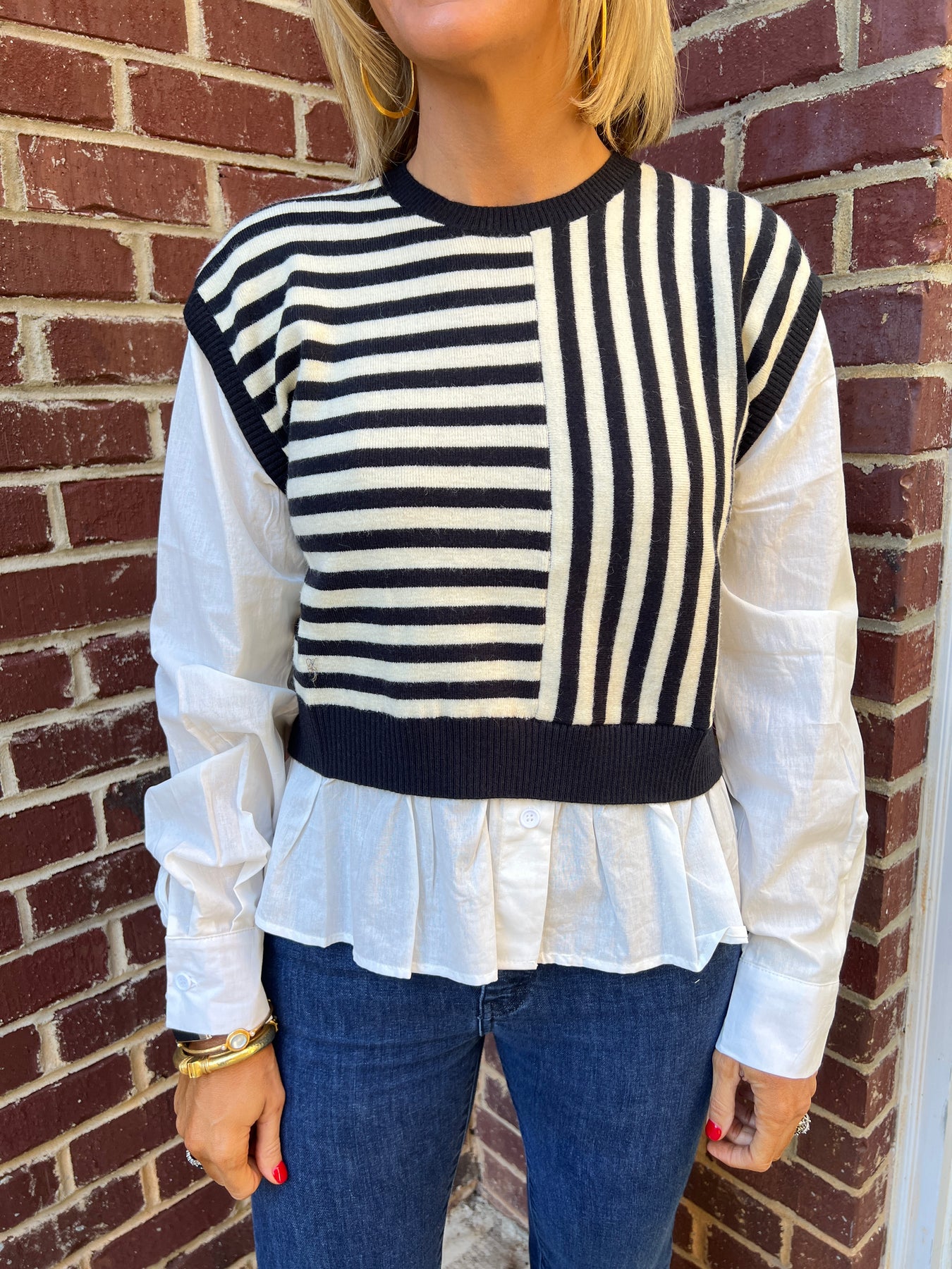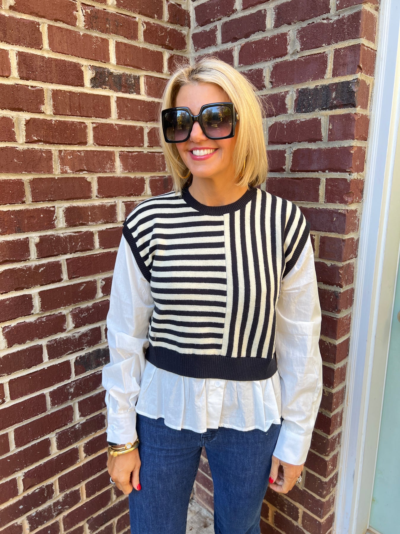 Layer up with effortless style in this charming stripe pattern sweater combo blouse. The mixed-fabric design pairs a cozy knit sweater with a crisp blouse underneath, giving you two looks in one piece. Perfect for transitional weather, it's your go-to for casual Fridays or weekend adventures. Mix textures, mix vibes, mix it all together!
