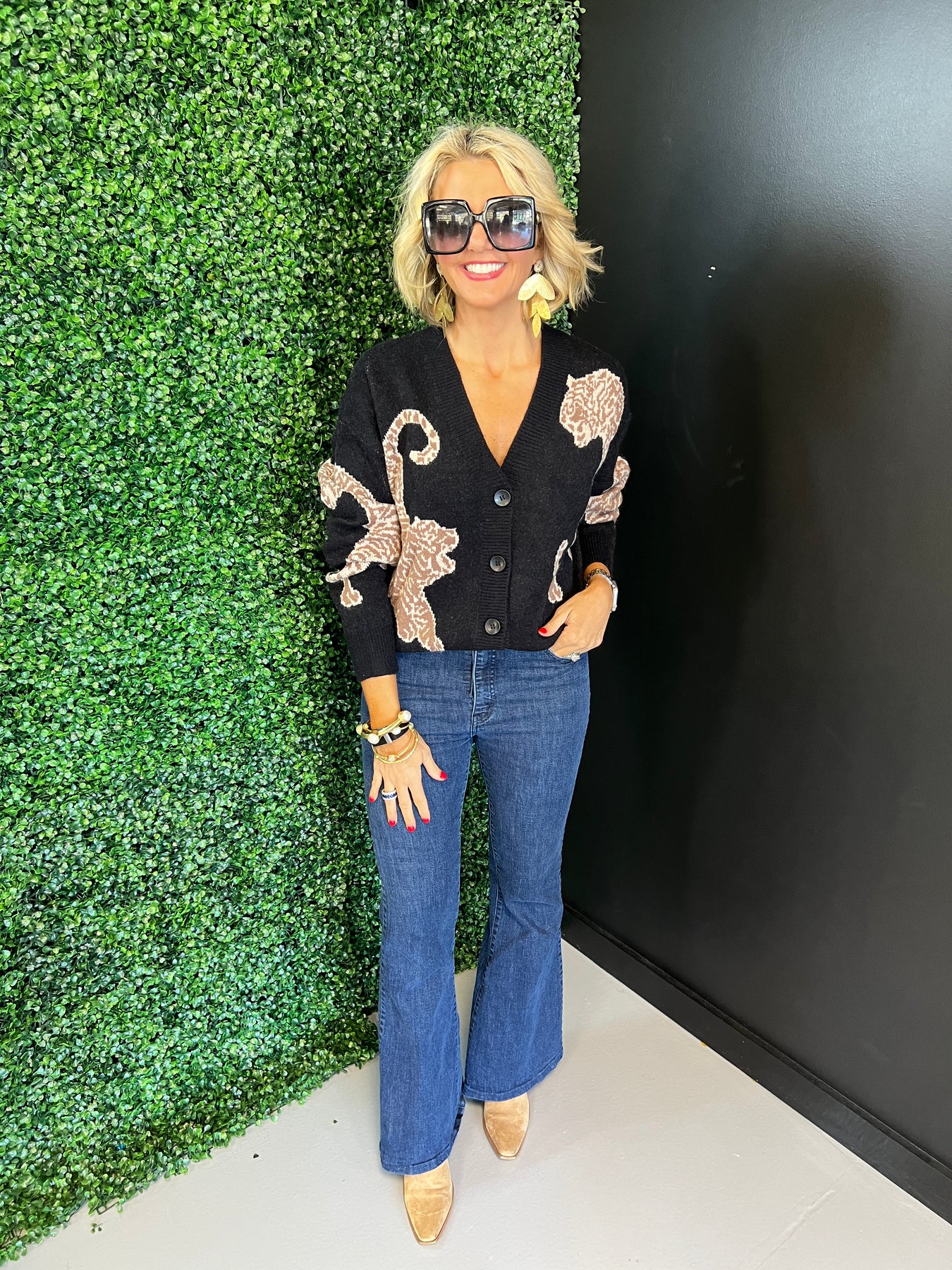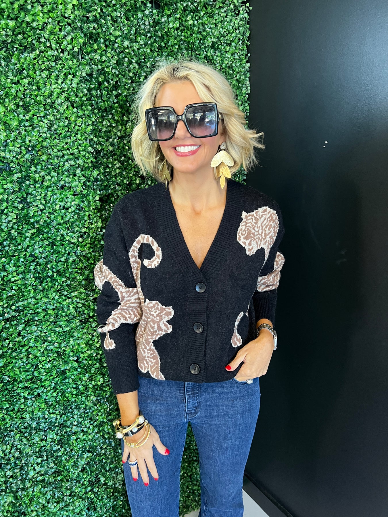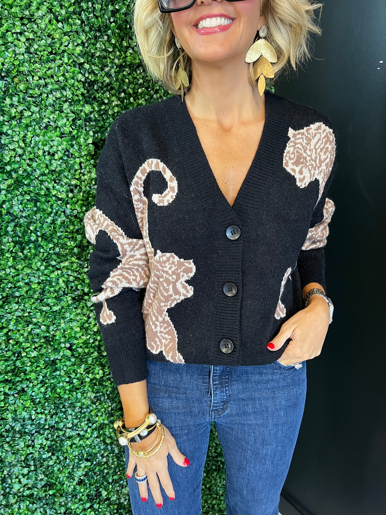 Embrace bold style and cozy comfort with this Black Tiger Printed Sweater Cardigan. Featuring a striking tiger print, it adds a fierce touch to any outfit while keeping you warm and comfortable. Perfect for layering, this cardigan effortlessly combines fashion and function to elevate your everyday look.