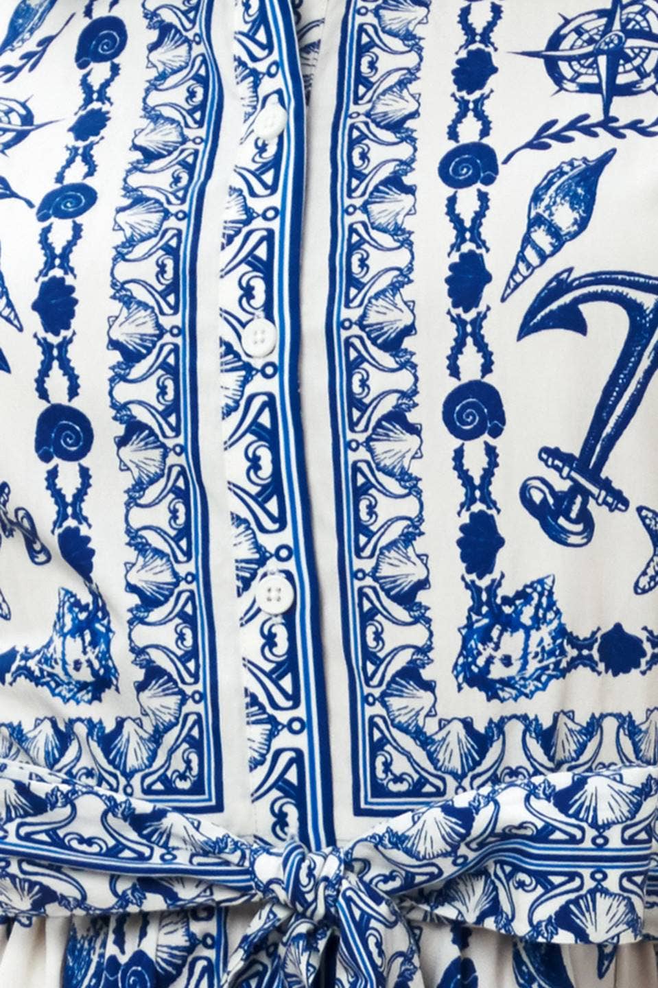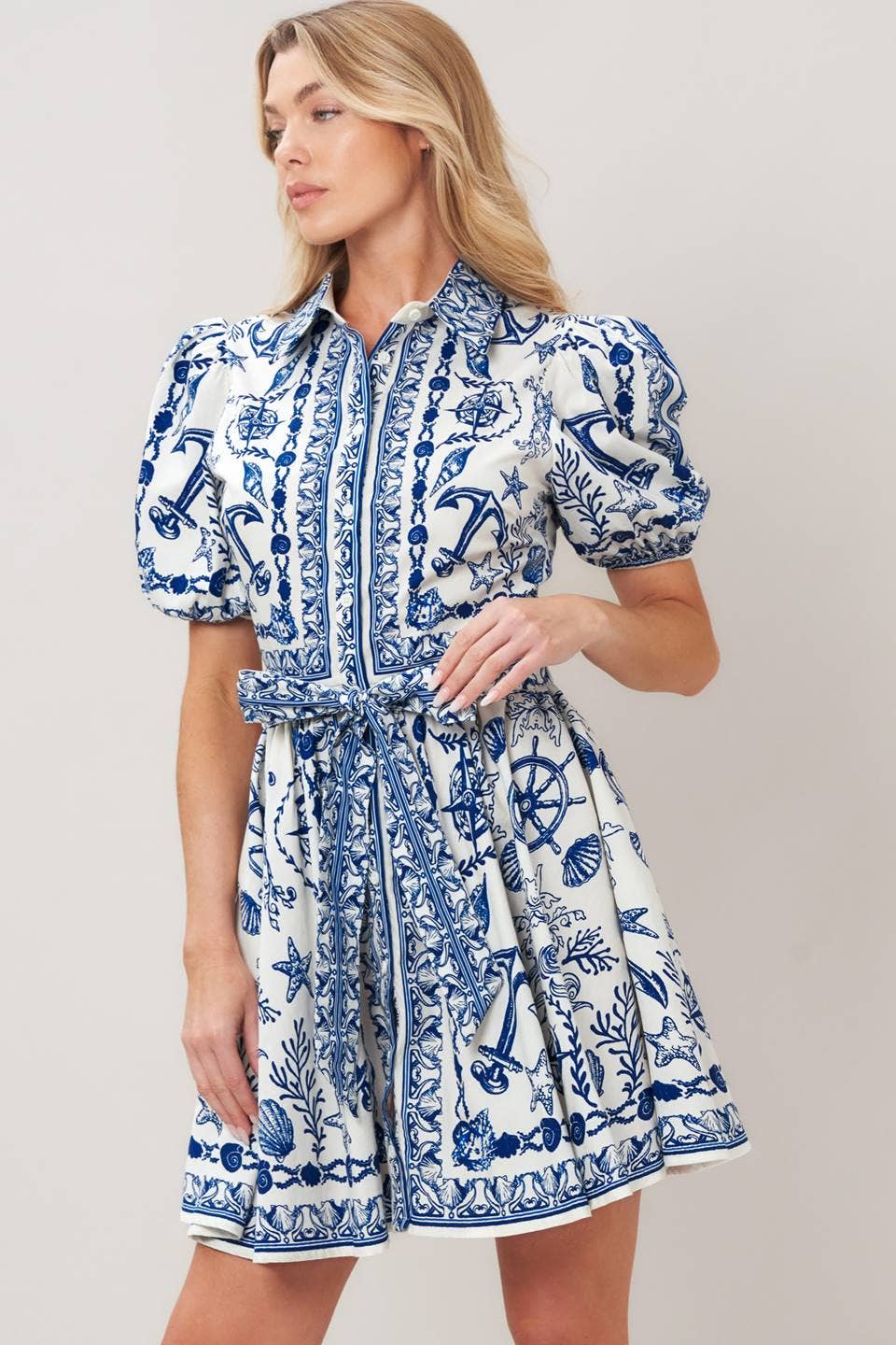 A printed woven mini dress featuring collar, puff short sleeve, front button down, self sash tie and full skirt.