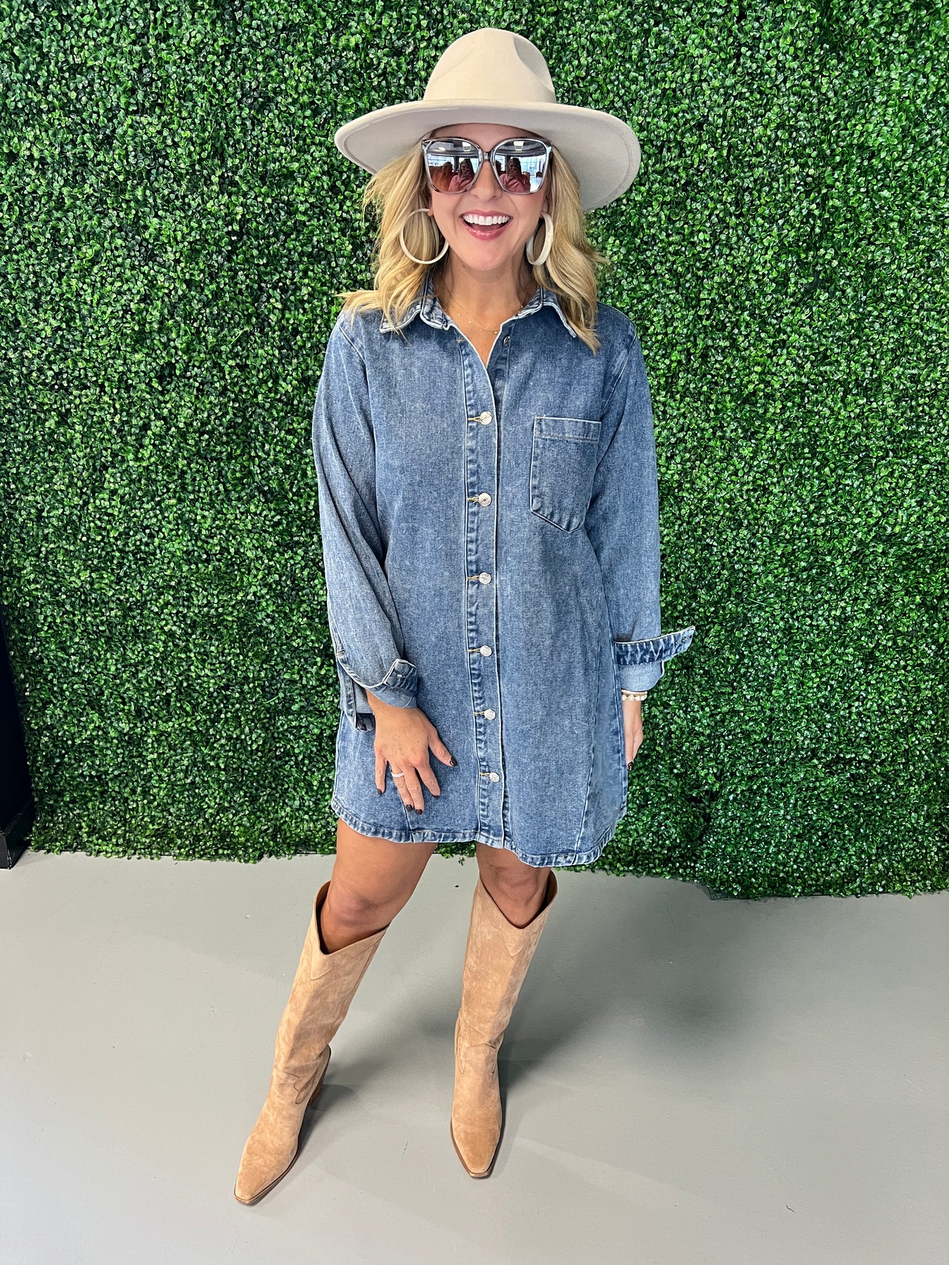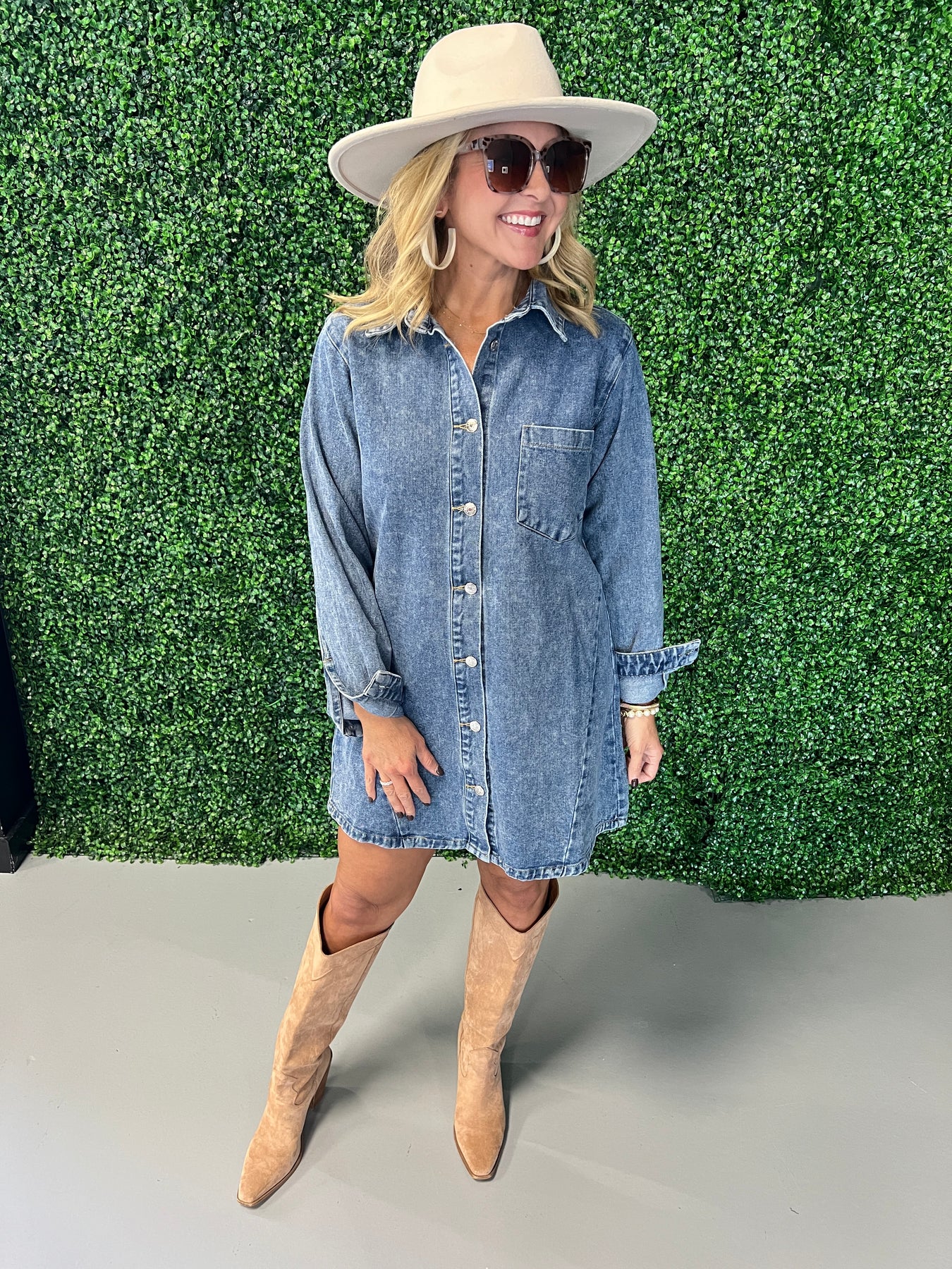 Elevate your wardrobe with this Blue Denim Button Down Shirt Dress, blending classic style and effortless cool. Crafted from durable denim, its tailored fit and button-down front offer versatility for day-to-night wear. Perfect for layering or wearing solo, this dress guarantees both comfort and a polished look wherever you go.