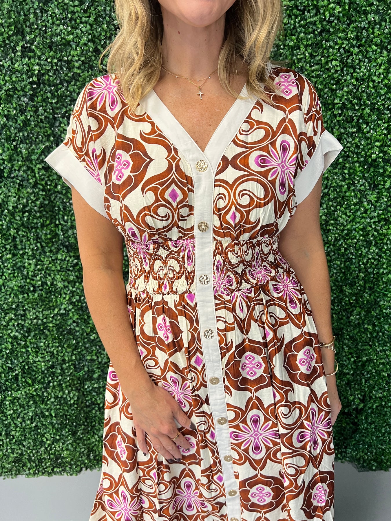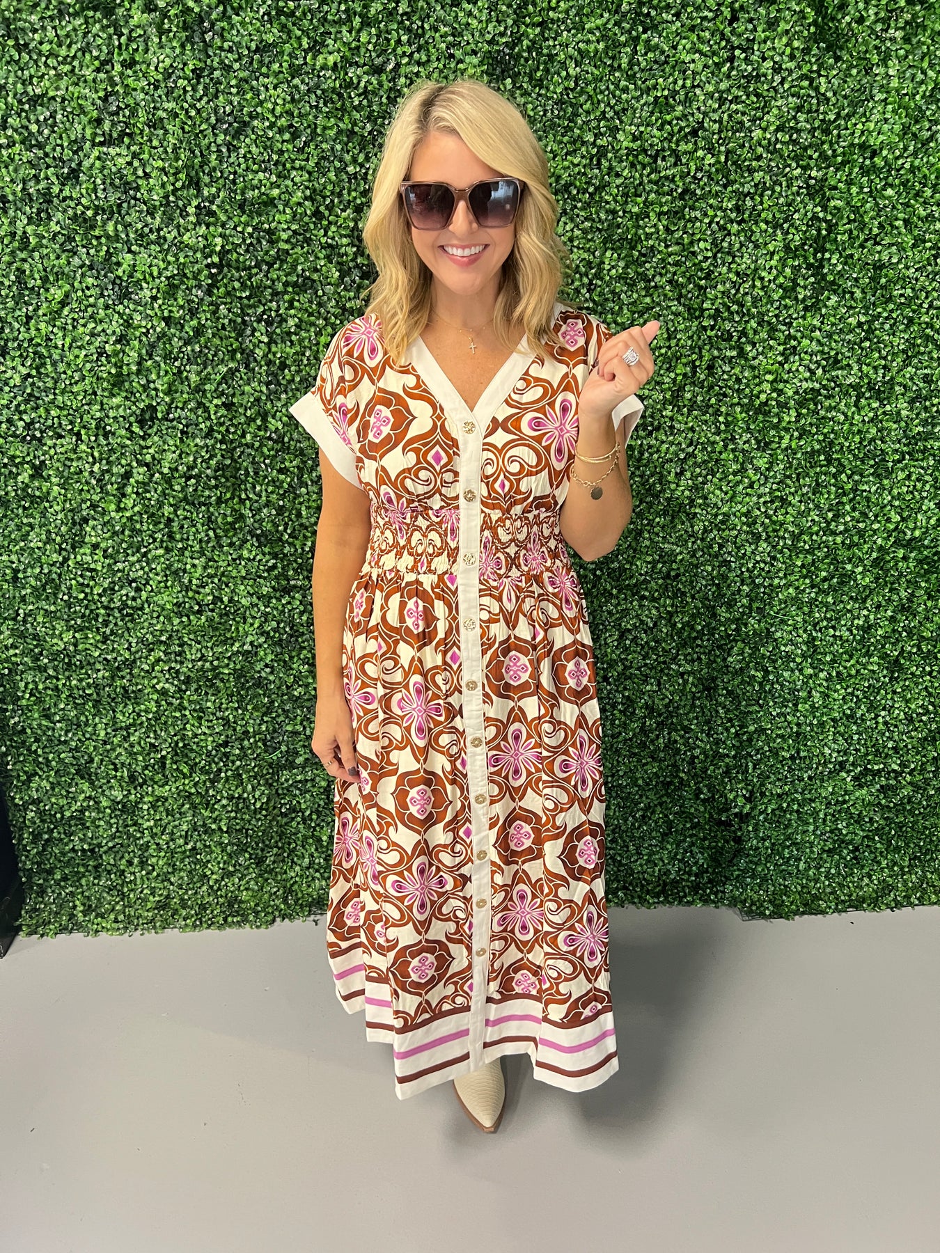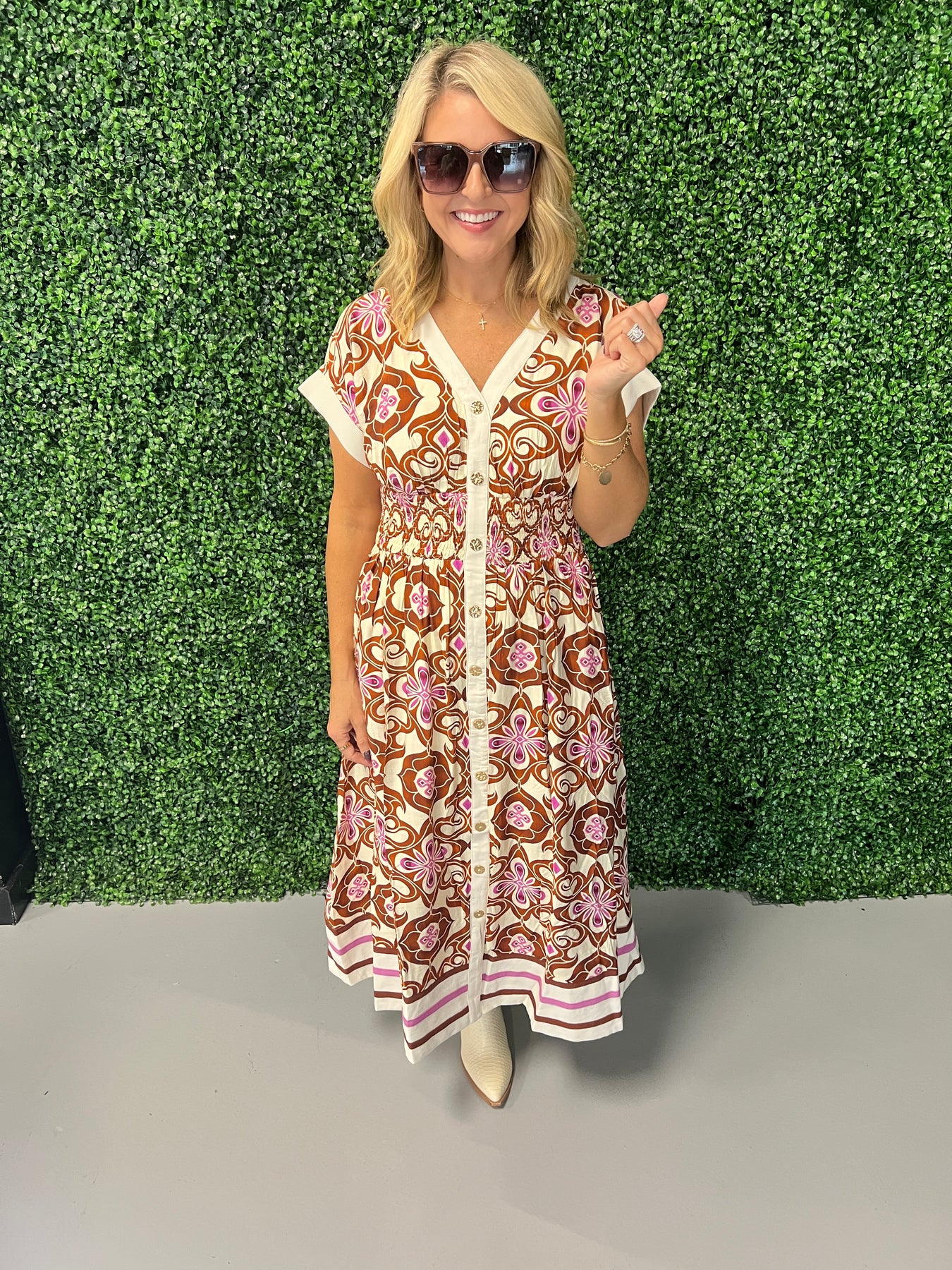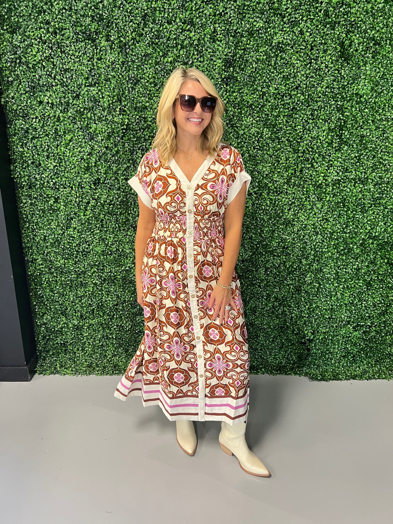 Embrace effortless elegance with the Botanical Print Cap Sleeve Midi Dress. Its flattering cap sleeves and flowing midi length create a graceful silhouette, while the vibrant botanical print adds a fresh, nature-inspired touch. Perfect for daytime events or casual outings, this dress offers comfort without sacrificing style. Elevate your wardrobe with a piece that combines timeless charm and modern appeal.