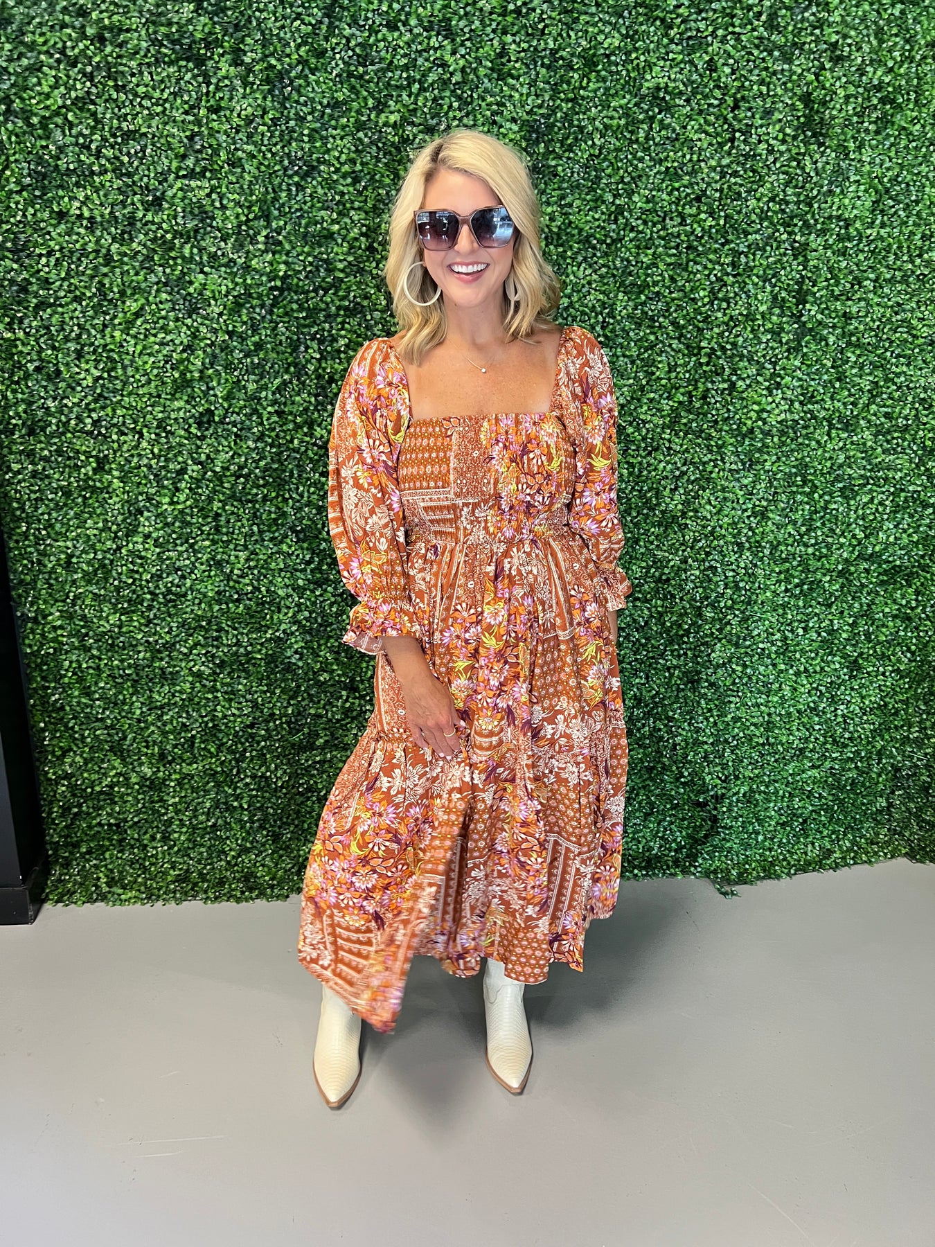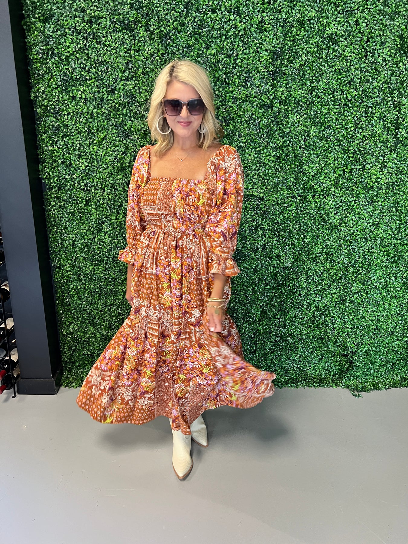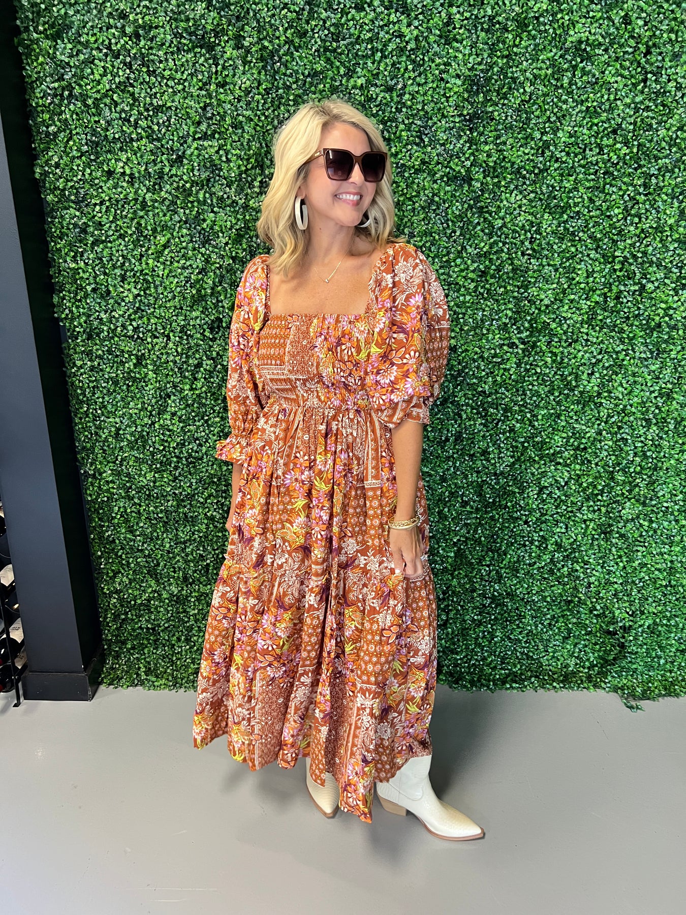 Elevate your wardrobe with this Brown Multi Print Smocked Midi Dress, designed to blend comfort and style effortlessly. The smocked bodice offers a flattering fit that moves with you, while the vibrant multi print adds a touch of playful sophistication. Perfect for day-to-night wear, this midi dress pairs beautifully with sandals or heels, making it a versatile choice for any occasion. Embrace a look that’s both chic and comfortable with this must-have dress.