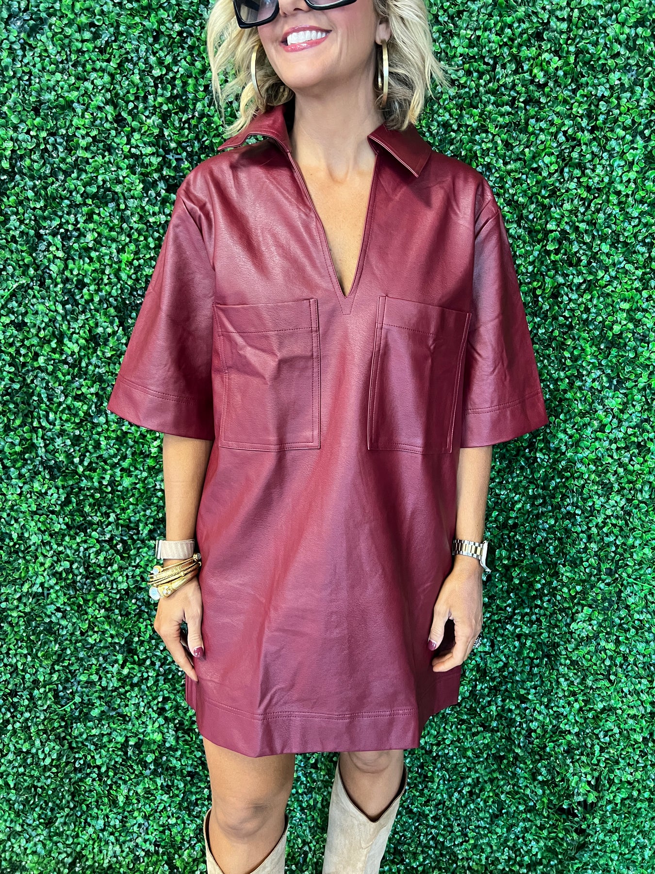 Elevate your wardrobe with this stunning Burgundy Leather Dress. Crafted from rich, supple leather, it offers a sleek silhouette that effortlessly combines elegance and edge. The deep burgundy hue adds a touch of sophistication, perfect for evening events or stylish daytime outings. Designed to flatter your figure, this dress ensures you stand out with confidence and grace. Make a bold fashion statement that's both classic and contemporary.