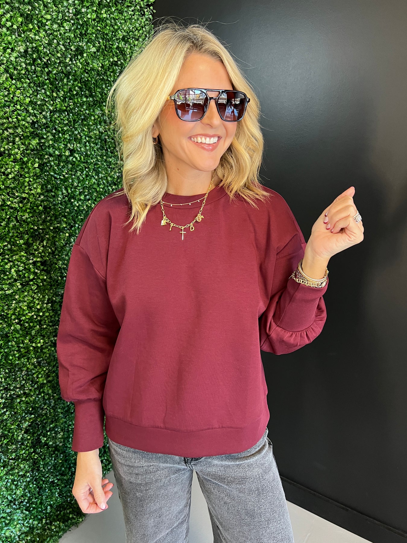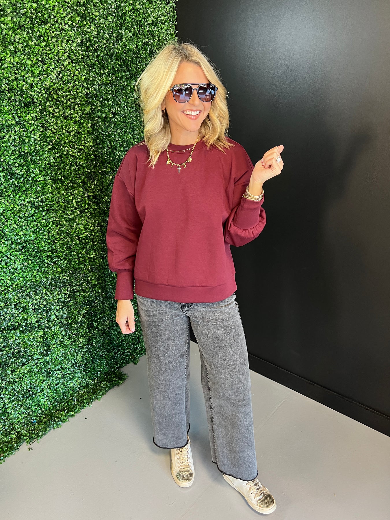 Slip into effortless style with this burgundy beauty that's basically a hug in fabric form. The wide cuff details add a fun, fashion-forward touch that elevates your everyday look without trying too hard. Soft, breathable, and designed for all-day comfort, this top pairs perfectly with your favorite jeans or loungewear vibes. Whether you're running errands or settling in for a cozy night, you'll love how this piece makes you feel—relaxed, put-together, and ready for anything.