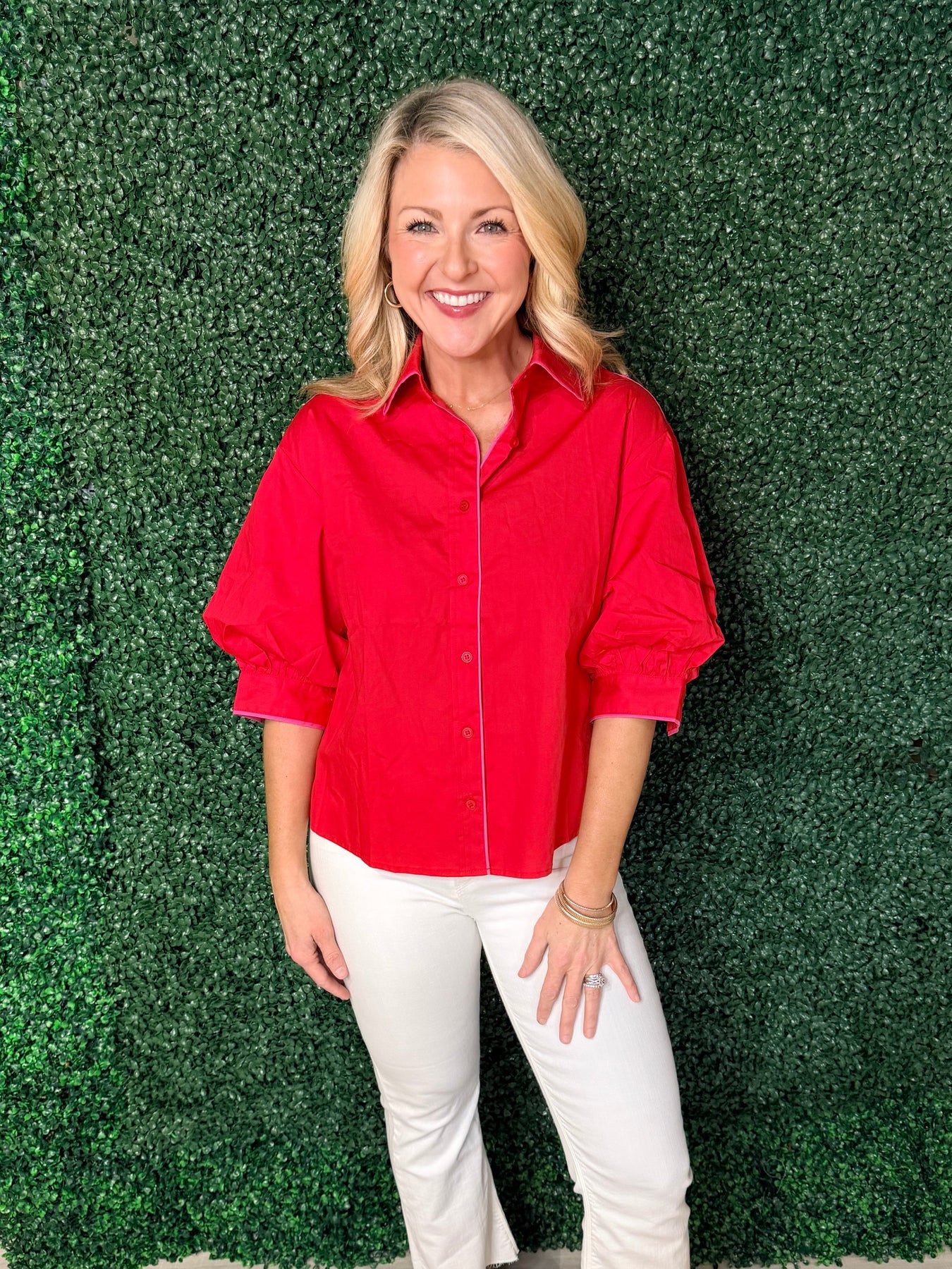 Button Down Shirt w/ Bubble Sleeves & Contrast Piping