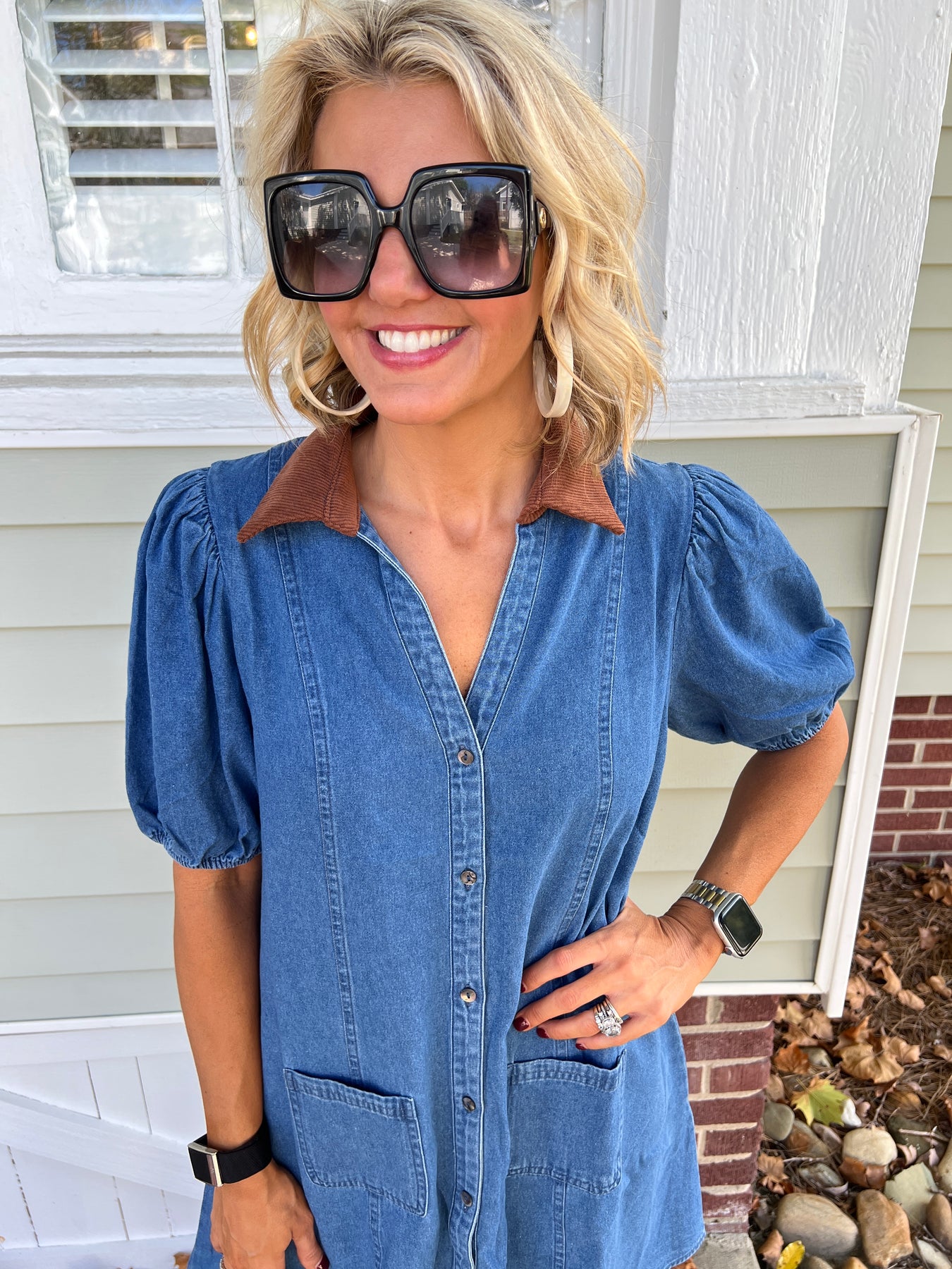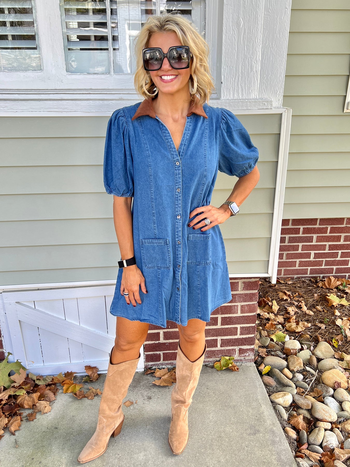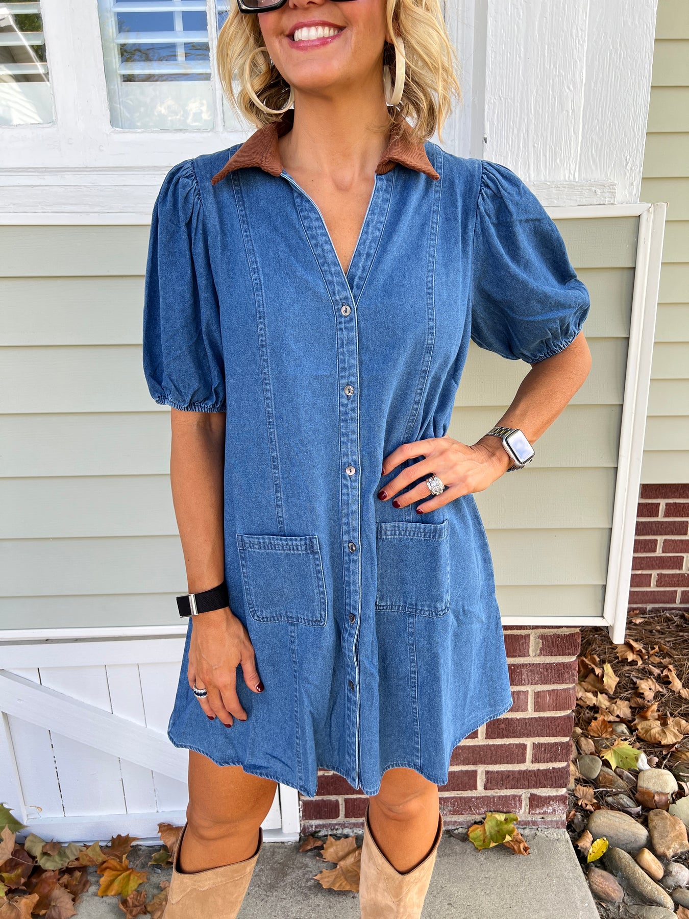 Elevate your wardrobe with the Contrast Collar Puff Sleeve Denim Dress. This stylish piece features a distinctive contrast collar that adds a touch of sophistication, while puff sleeves introduce a playful, feminine flair. Crafted from durable denim, it offers lasting comfort and a flattering fit. Perfect for day-to-night wear, this dress effortlessly combines classic charm with modern design, making it a versatile addition to any closet.