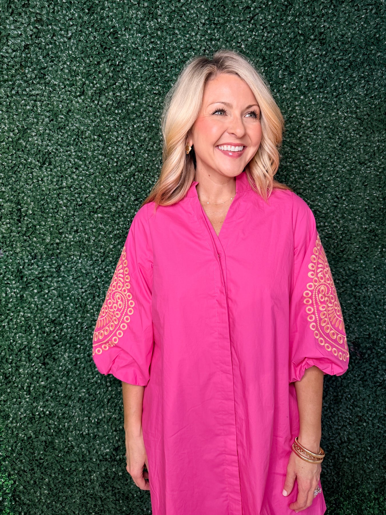 Elevate your wardrobe with this stunning embroidered balloon sleeve dress that effortlessly combines elegance and comfort. The romantic 3/4 length sleeves feature charming balloon details that add movement and dimension to your silhouette, while intricate embroidery brings sophisticated texture throughout. A covered placket provides a polished, refined finish, and the fully lined interior ensures a smooth, comfortable fit all day long. Perfect for special occasions or elevated everyday wear, this dress is designed to make you feel confident and beautiful.
