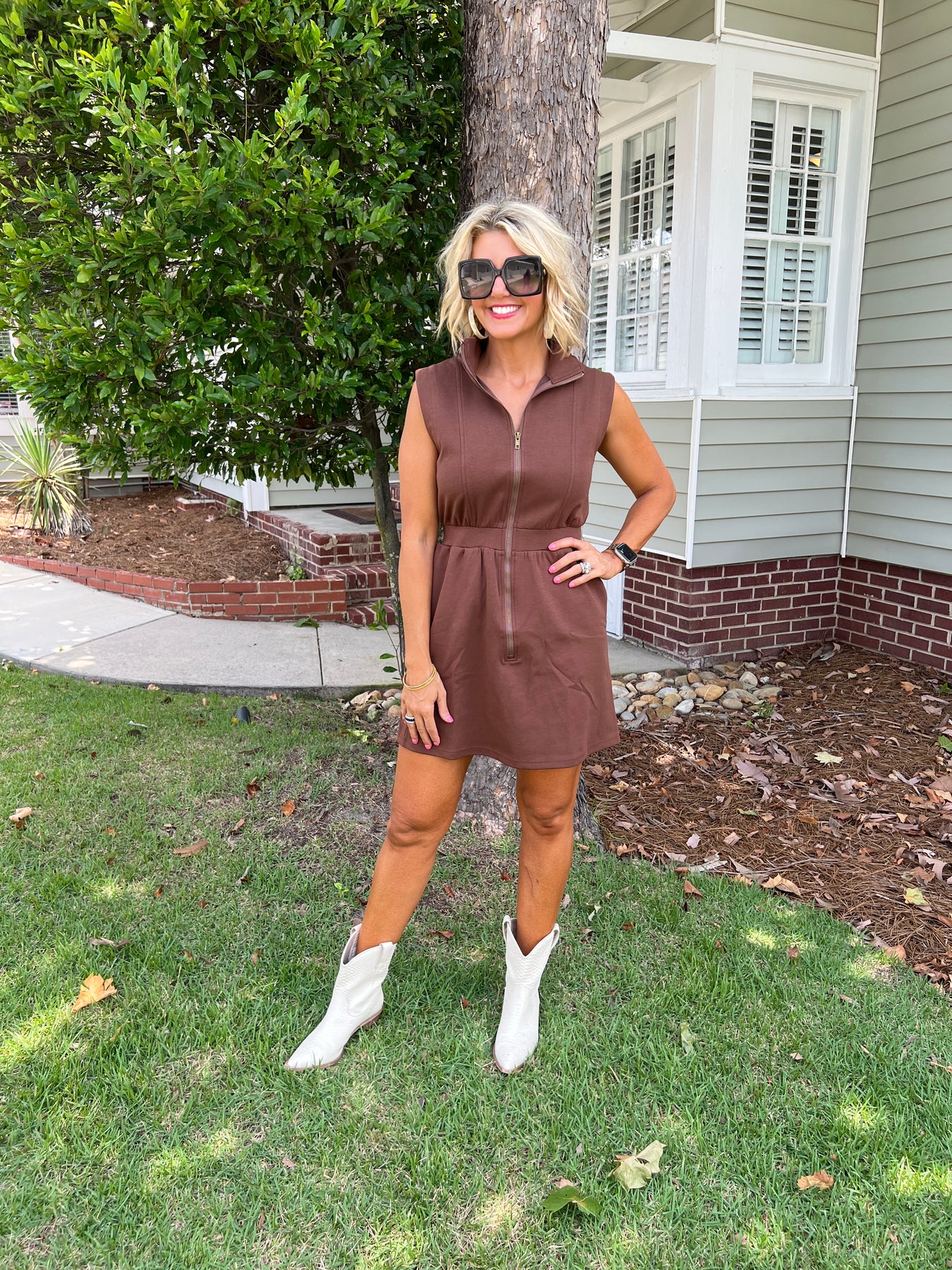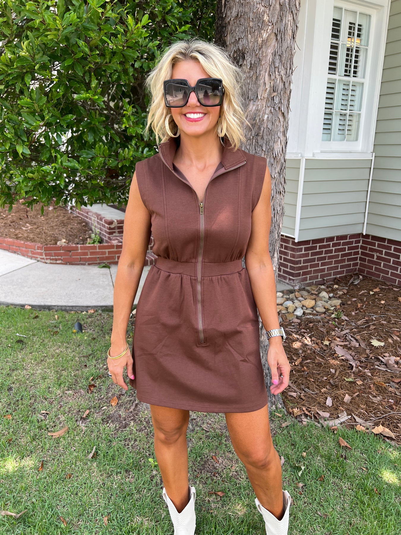 Elevate your wardrobe with the Espresso Sleeveless Zip-Up Dress, designed for effortless style and comfort. Its sleek zip-up front offers easy wear and a flattering fit, while the sleeveless cut keeps you cool and chic. Perfect for day-to-night looks, this dress combines practicality with a modern edge, making it a versatile addition to any closet.