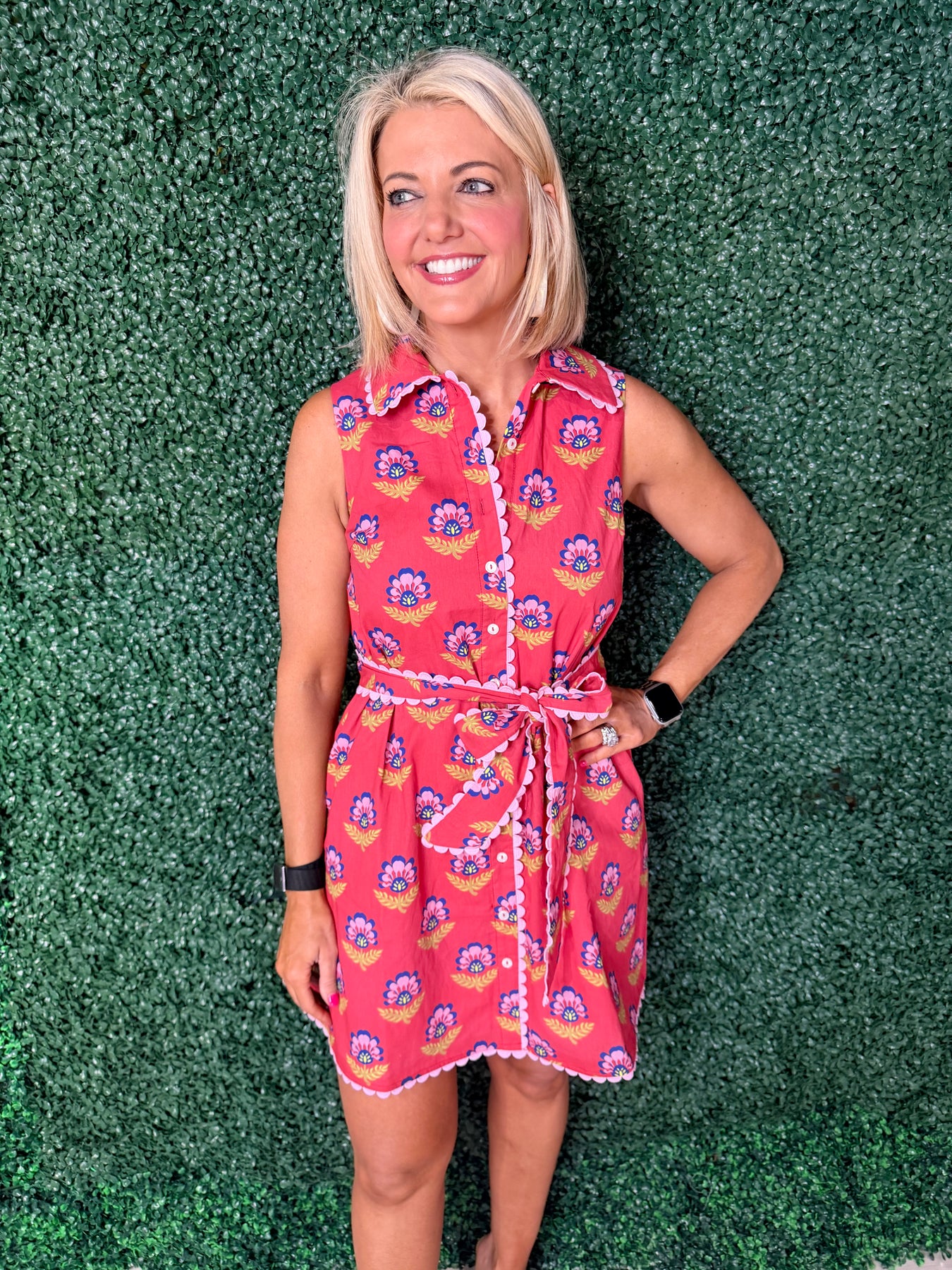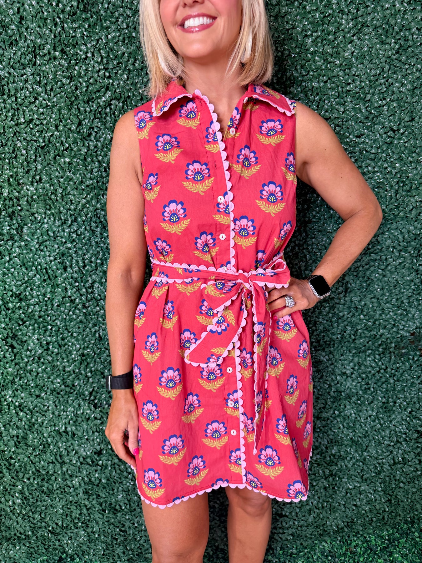 Elevate your wardrobe with this charming floral print dress, featuring delicate scalloped trim detailing and contrasting accents. The feminine floral pattern brings effortless style to any occasion, while the scalloped edges add a sophisticated touch. Perfect for spring gatherings, casual outings, or dressing up your everyday look. The contrast trim creates visual interest and dimension, making this dress a versatile staple that transitions seamlessly from day to night.
