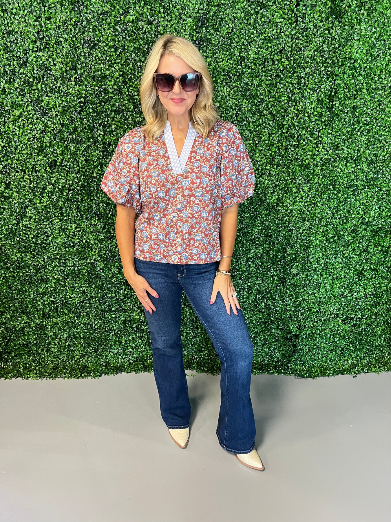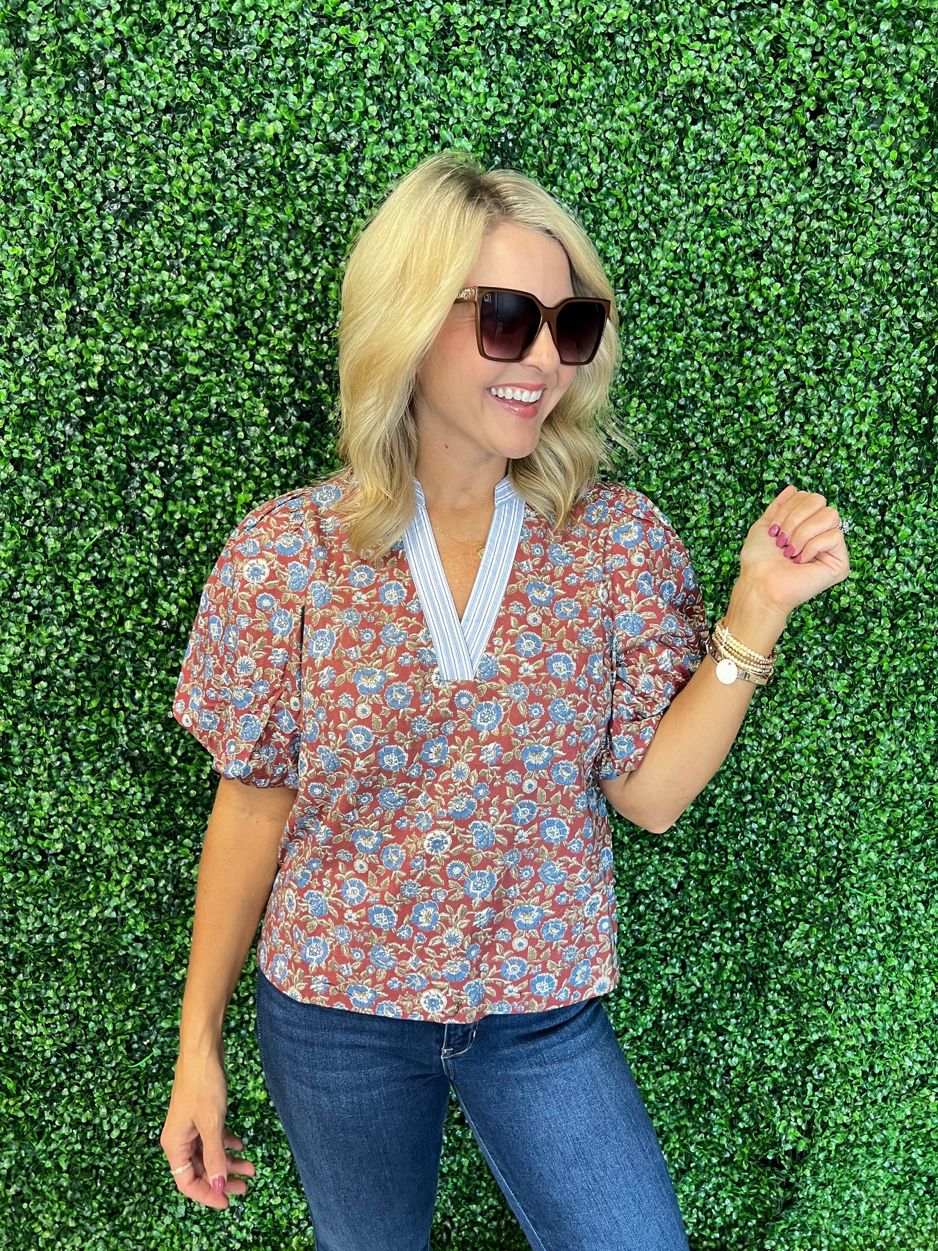 Elevate your wardrobe with this Floral Puff Sleeve Top featuring elegant striped trim. Its soft fabric and voluminous sleeves create a flattering silhouette, while the delicate floral pattern adds a fresh, feminine touch. Perfect for both casual outings and dressier occasions, this top effortlessly combines comfort and style to keep you looking chic all day.