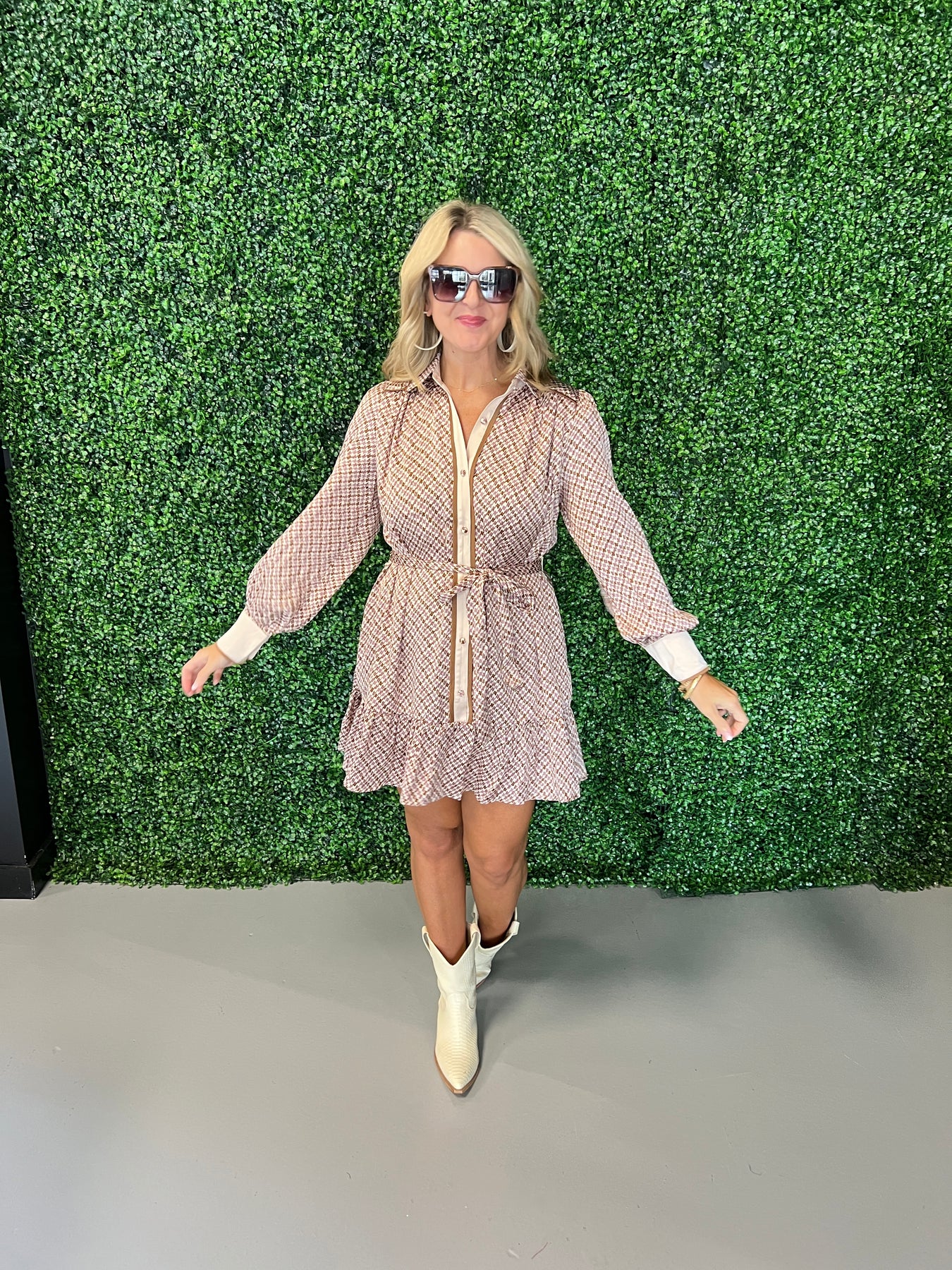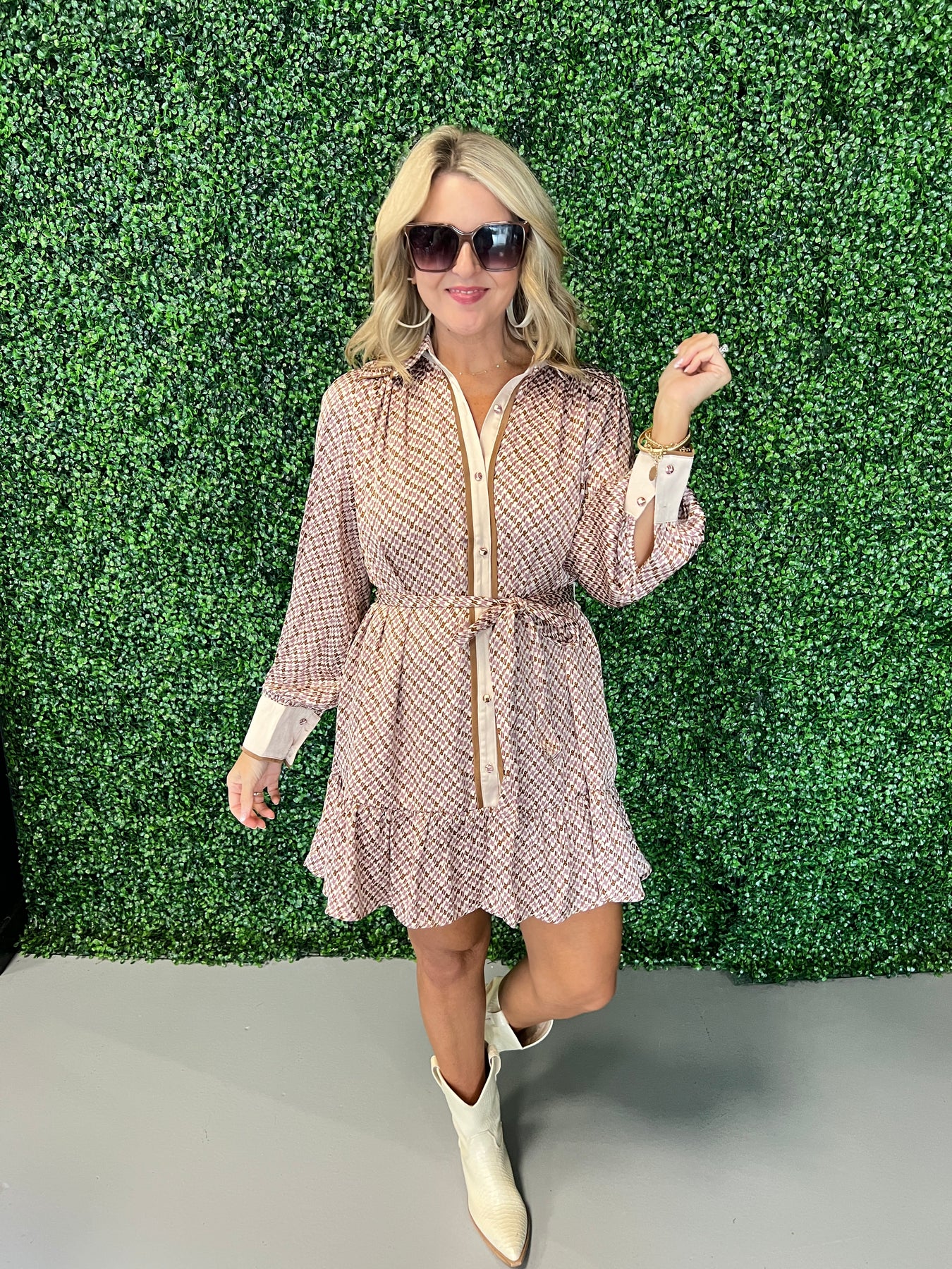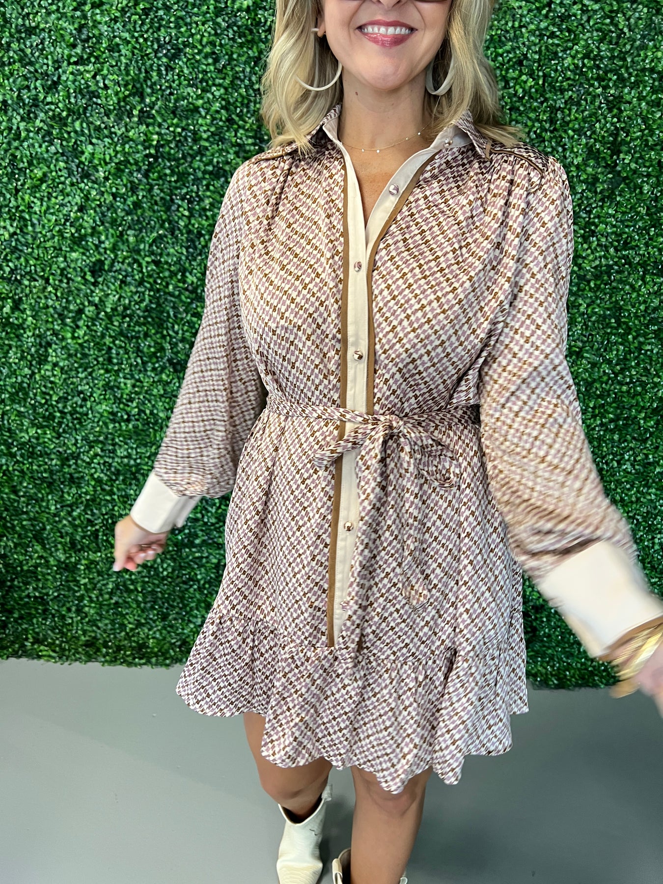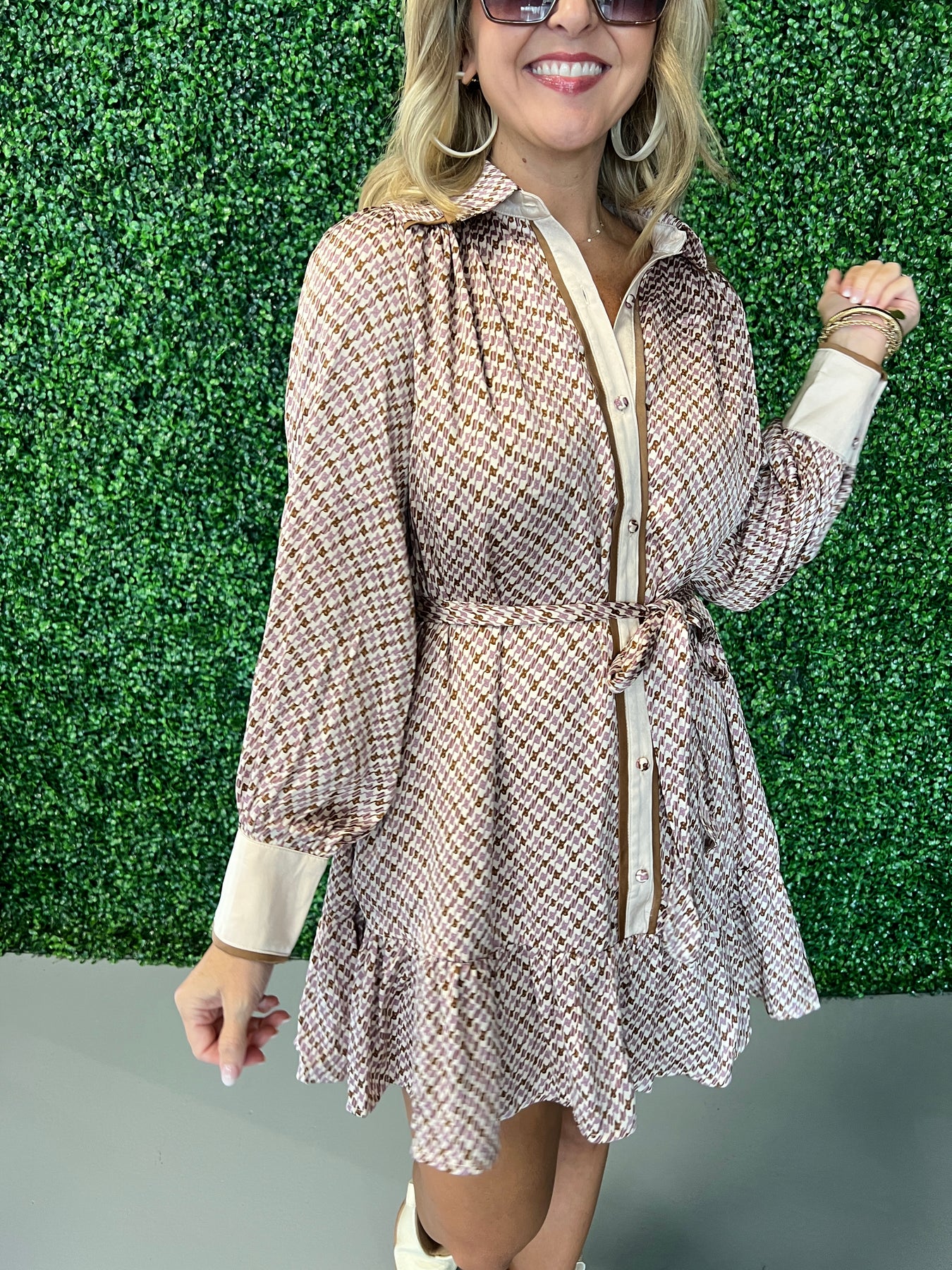 Elevate your wardrobe with this Geo Print Satin Tie Waist Button Down Shirt Dress. Crafted from smooth satin, it offers a sleek and comfortable fit, while the geometric print adds a modern touch. The adjustable tie waist flatters your silhouette, and the button-down design lends classic versatility, perfect for transitioning from day to night with ease.