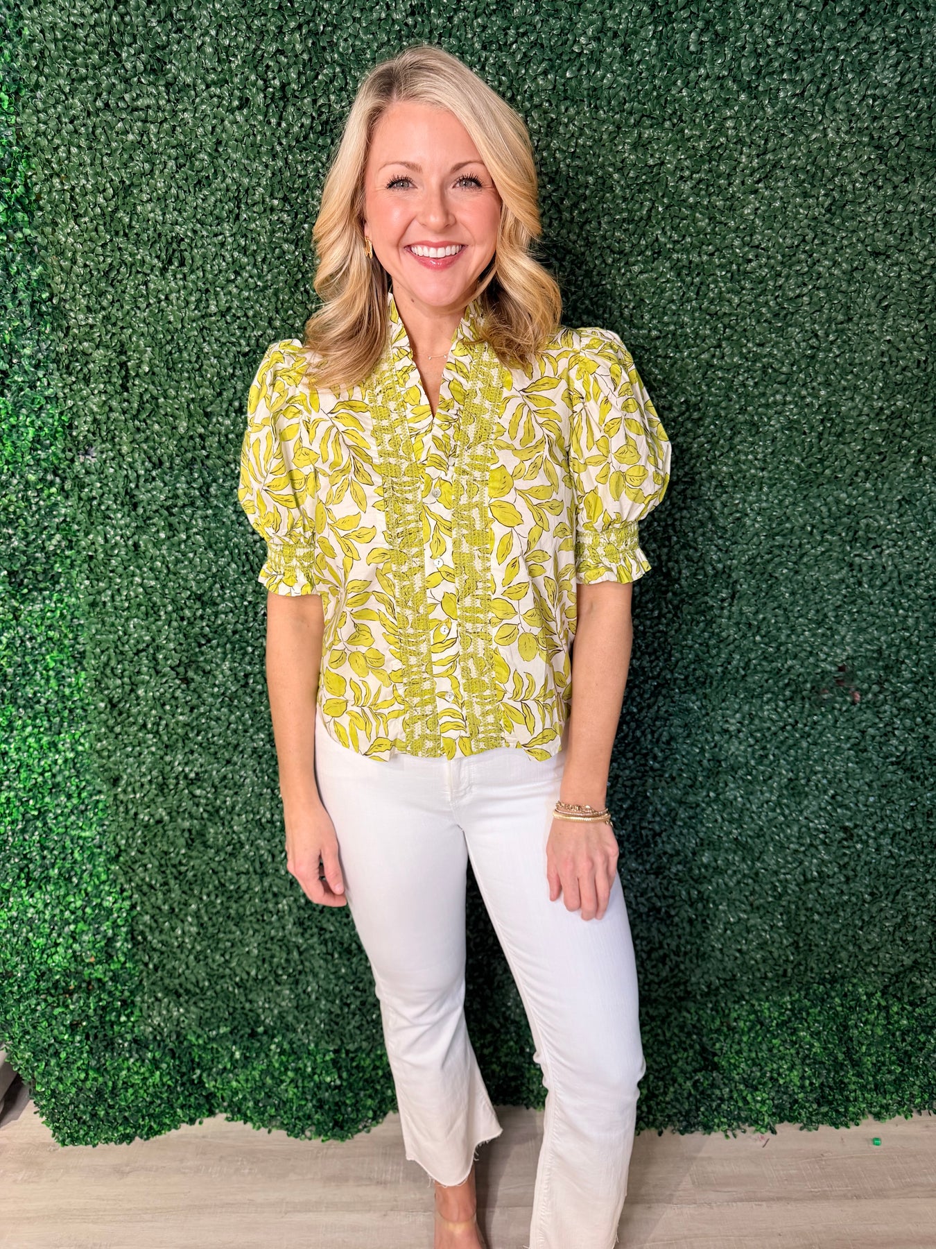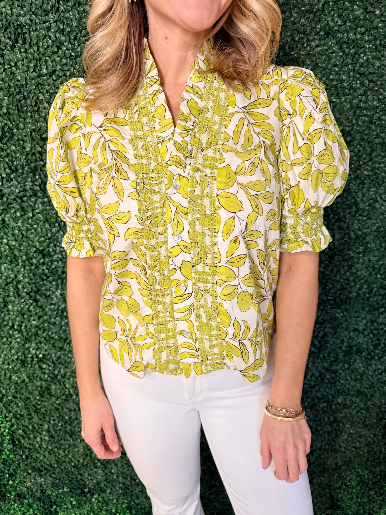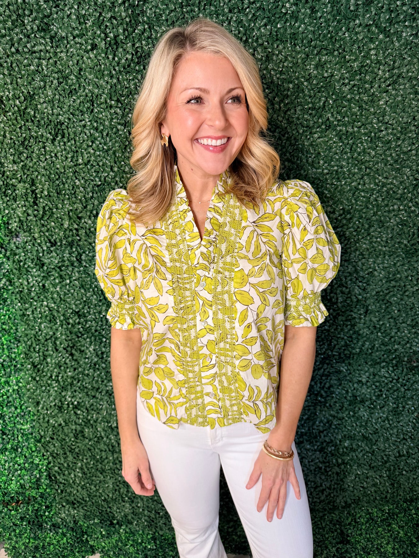 Elevate your wardrobe with this charming green blouse featuring a delicate ruffle V-neckline and romantic smocked puff sleeves. The floral design adds timeless elegance, while the structured smocking at the shoulders creates a flattering silhouette. Perfect for dressing up casual outfits or layering under jackets, this versatile piece transitions seamlessly from day to evening. The soft fabric and thoughtful details make it an essential addition to any style-conscious closet.