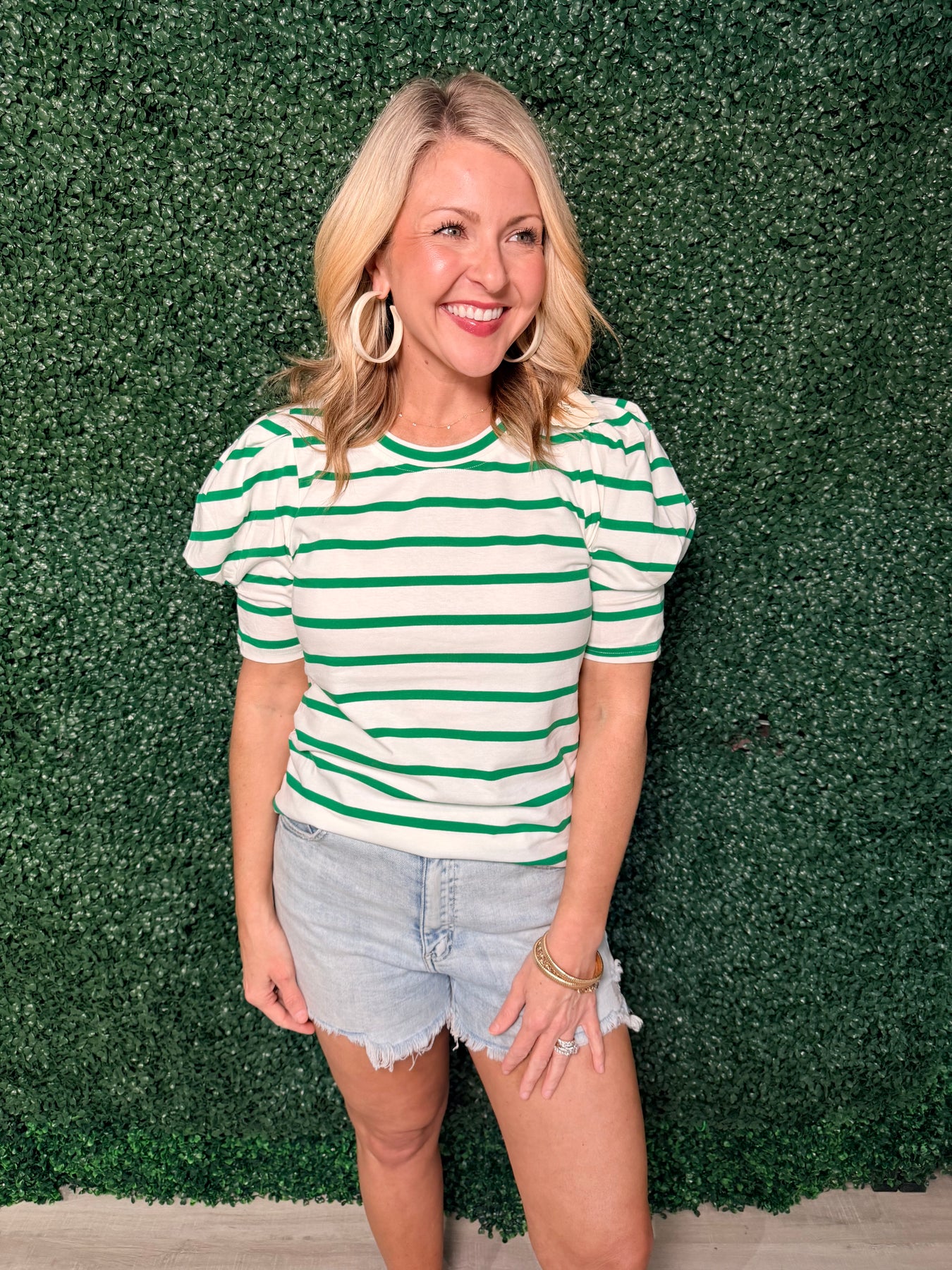 Effortless style meets comfort in this green striped puff sleeve tee. The soft, breathable fabric feels amazing against your skin, while the playful puff sleeves add a touch of charm to any casual outfit. Perfect for layering or wearing solo, this versatile piece transitions seamlessly from weekend errands to relaxed hangouts. A wardrobe essential that doesn't compromise on comfort.