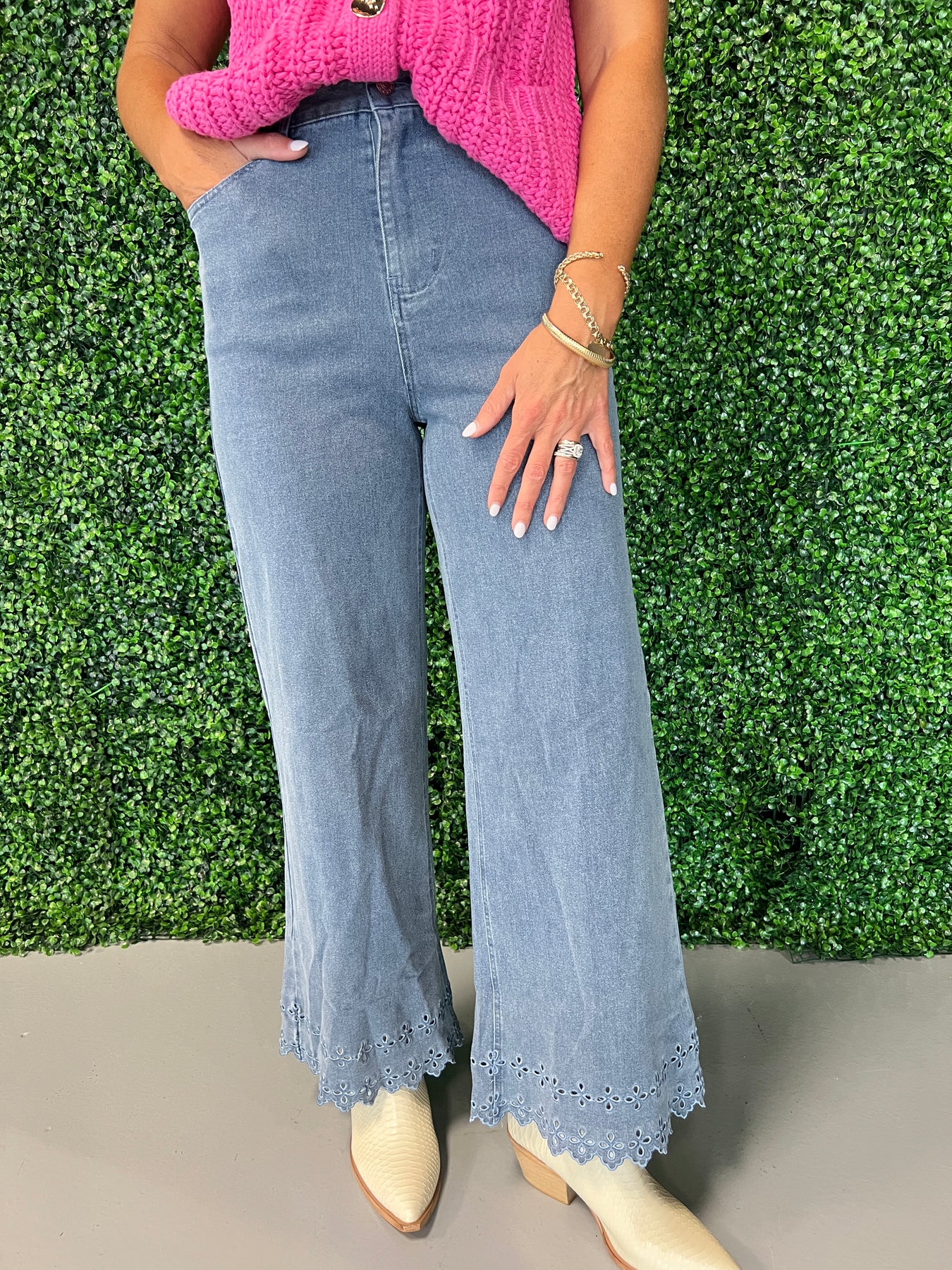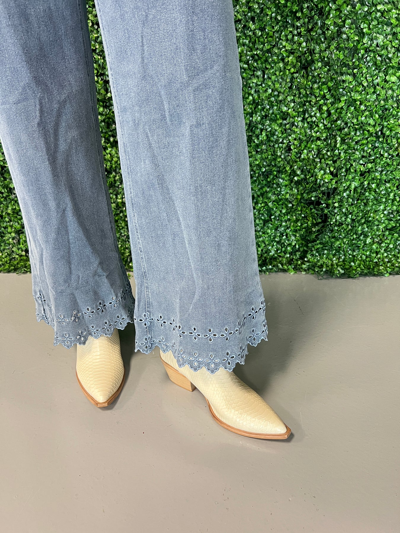 Elevate your wardrobe with these high waist pants featuring a delicate floral embroidered hem. Designed to flatter your silhouette, they offer a comfortable fit while adding a touch of elegance to any outfit. Perfect for both casual and dressy occasions, these pants combine style and sophistication effortlessly.