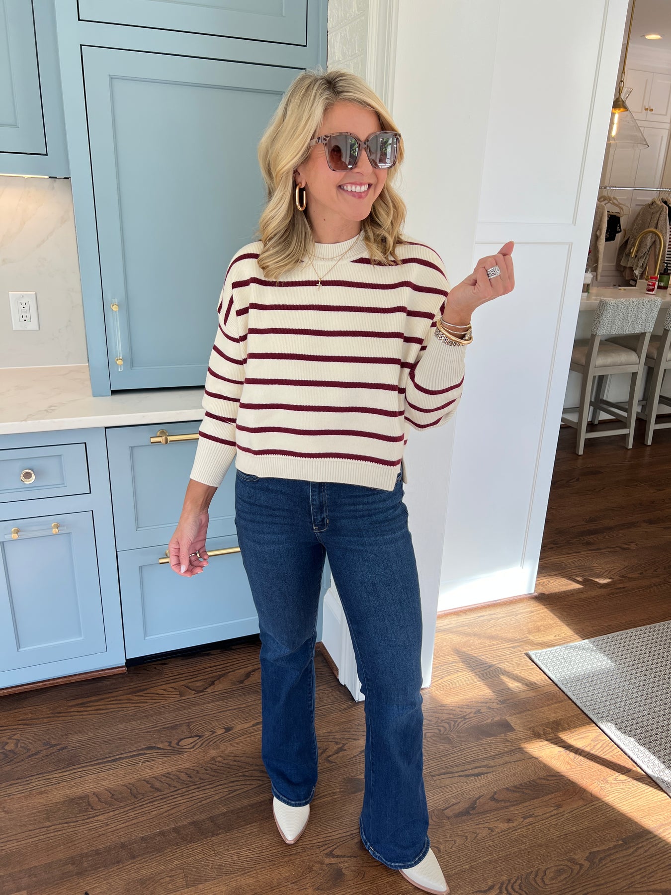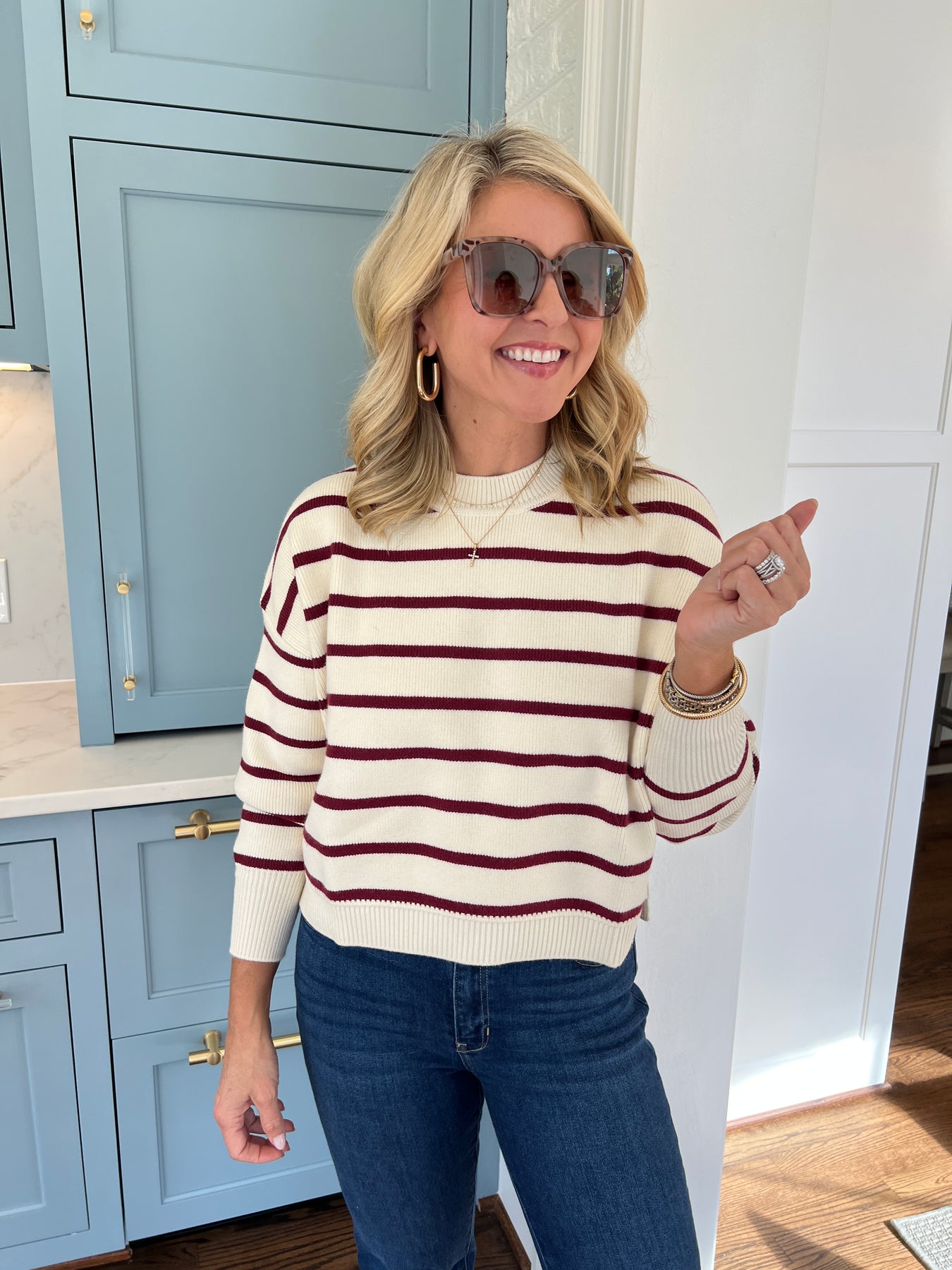 Stay effortlessly stylish and cozy with this Ivory Burgundy Striped Sweater. Crafted for comfort, its warm hues and classic stripes make it a versatile addition to any wardrobe. Perfect for layering or wearing on its own, this sweater adds a touch of refined color that enhances your look while keeping you comfortable throughout the day. Elevate your casual outfits with a piece designed to blend fashion and function seamlessly.