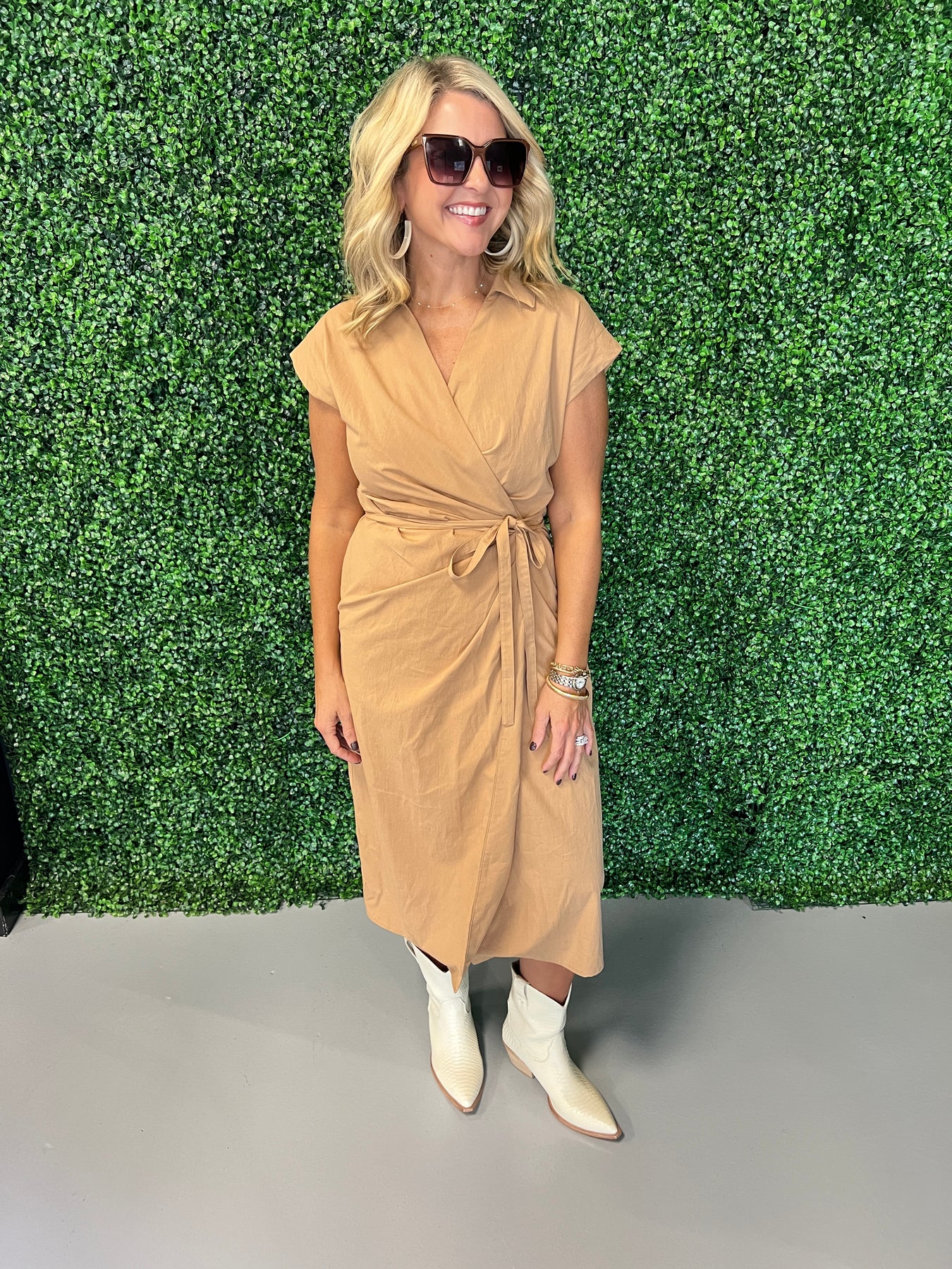This Khaki V-neck Wrap Dress is the perfect addition to your wardrobe! Its flattering wrap design and v-neckline will accentuate your figure, while the khaki color adds a touch of elegance. Wear it to any occasion and feel confident and stylish. A must-have for any fashion lover!