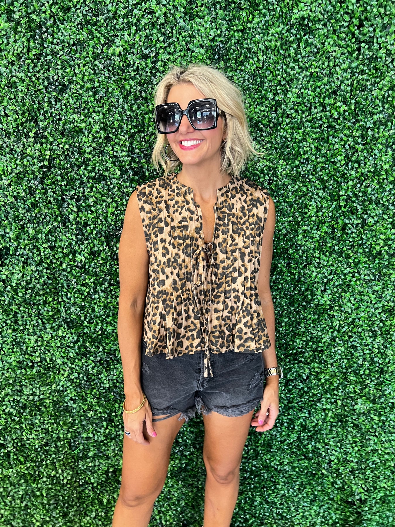Elevate your wardrobe with the Leopard Pleated Sleeveless Top, designed to combine bold style and effortless comfort. Its lightweight pleated fabric offers a flattering silhouette, while the sleeveless cut keeps you cool and chic all day. Perfect for pairing with jeans or skirts, this top adds a fierce, fashionable edge to any outfit. Make a statement with a piece that’s as versatile as it is eye-catching.