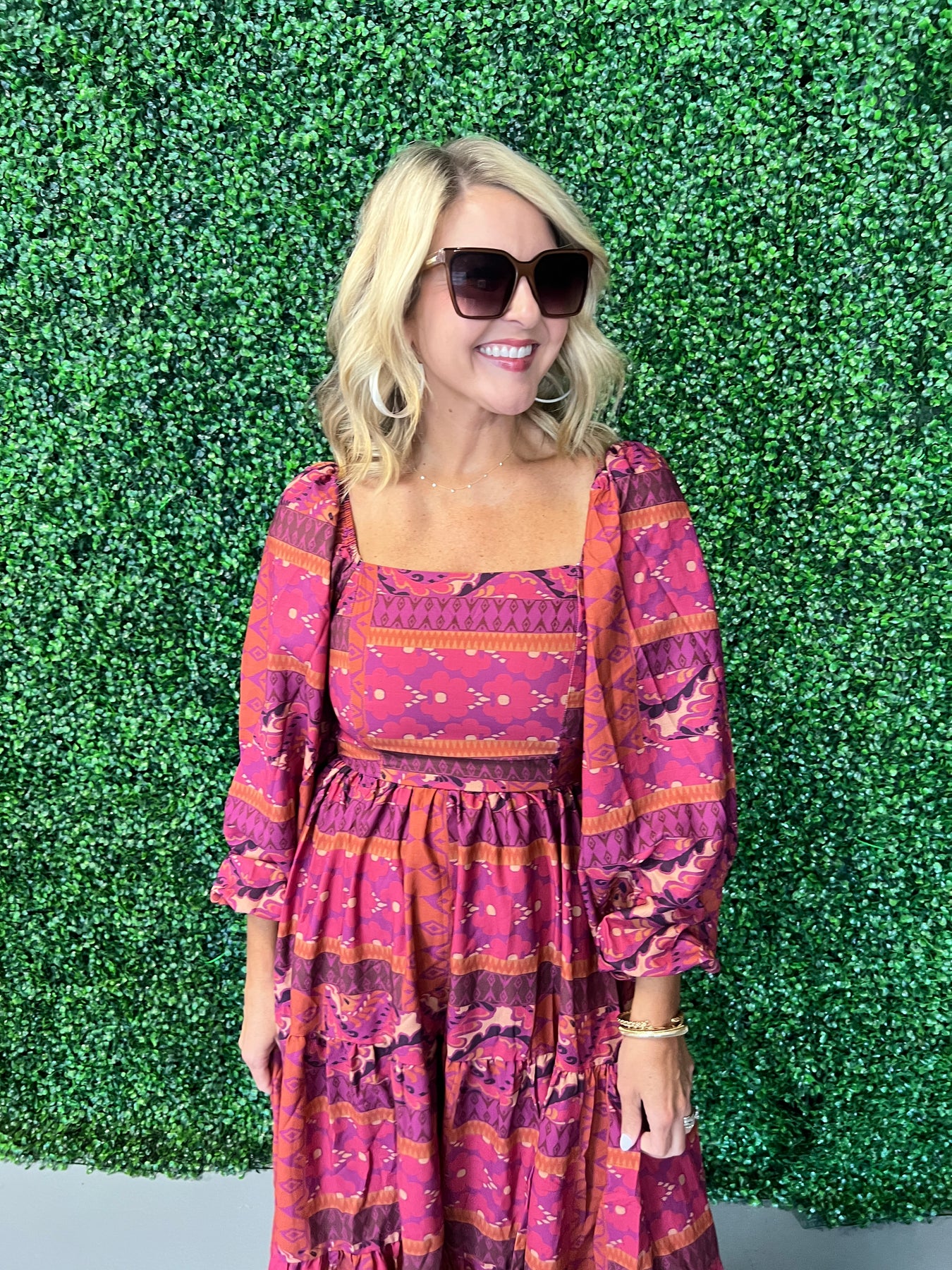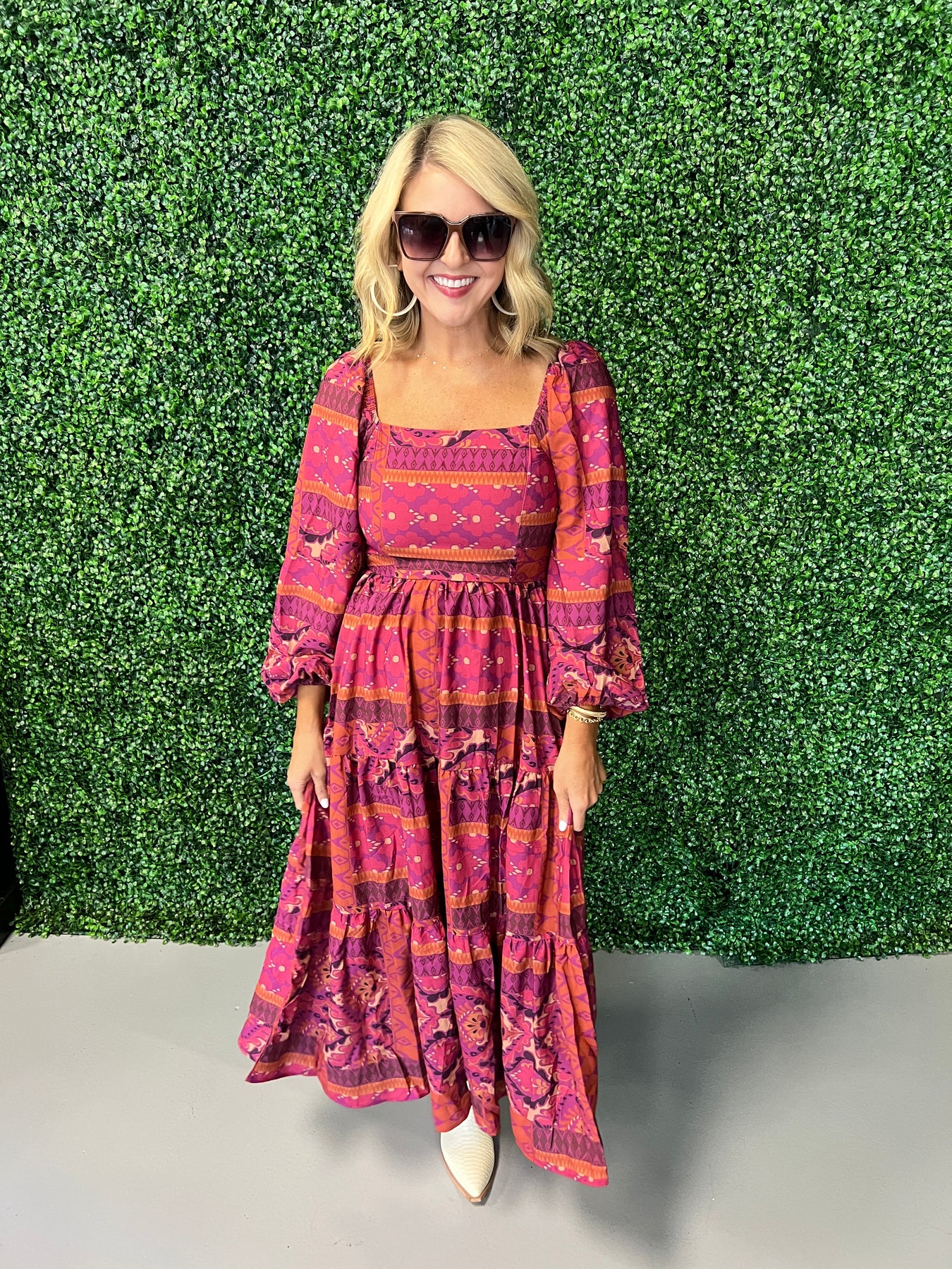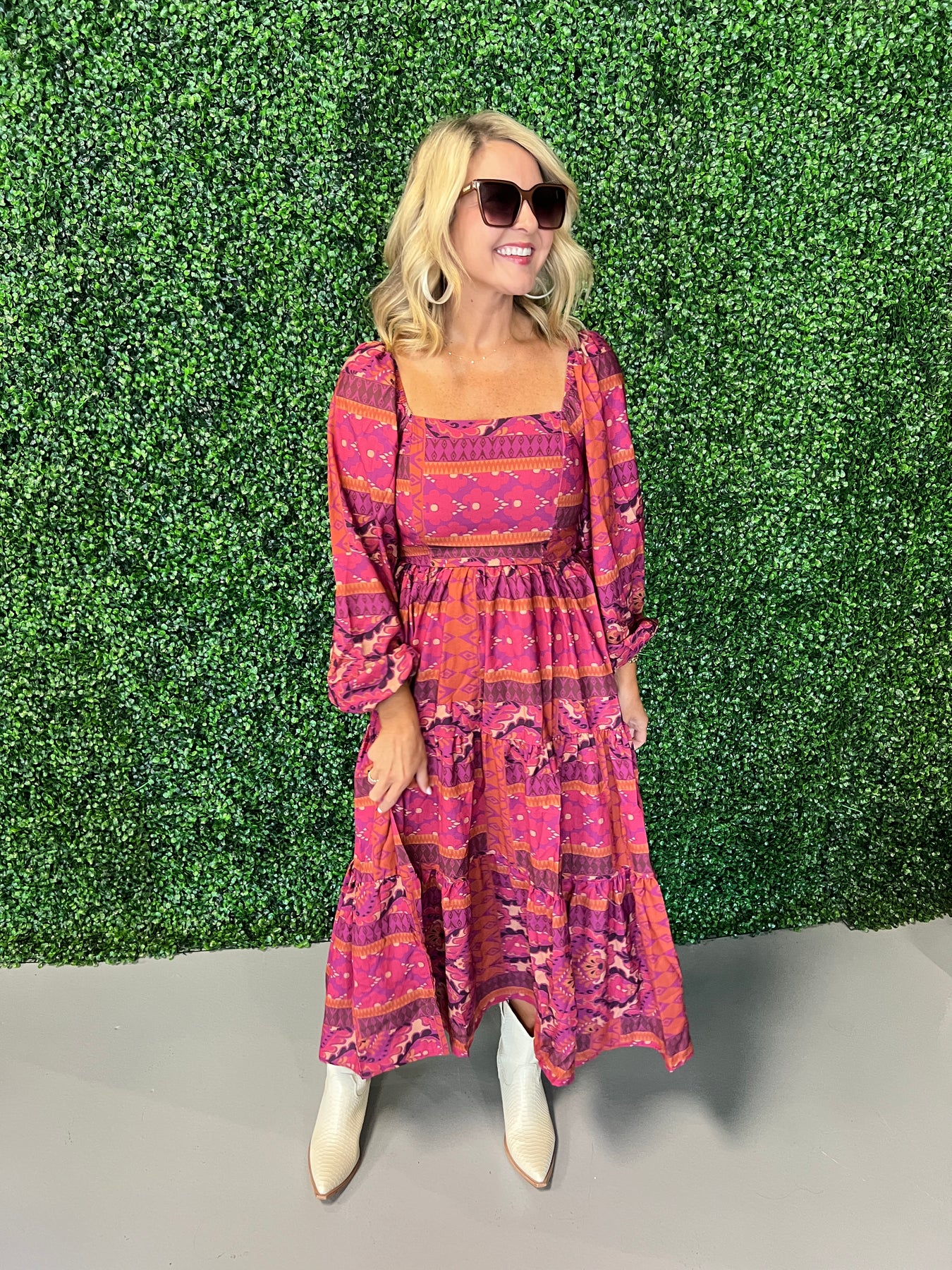 Elevate your wardrobe with the Magenta Abstract Midi Dress, featuring elegant puff long sleeves and a flattering smocked back for a comfortable, tailored fit. Its vibrant abstract pattern adds a modern touch, making it perfect for both casual outings and special occasions. Experience style and ease in one stunning dress.