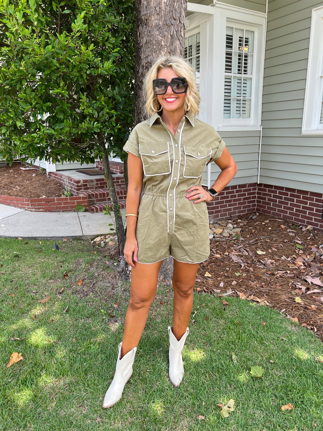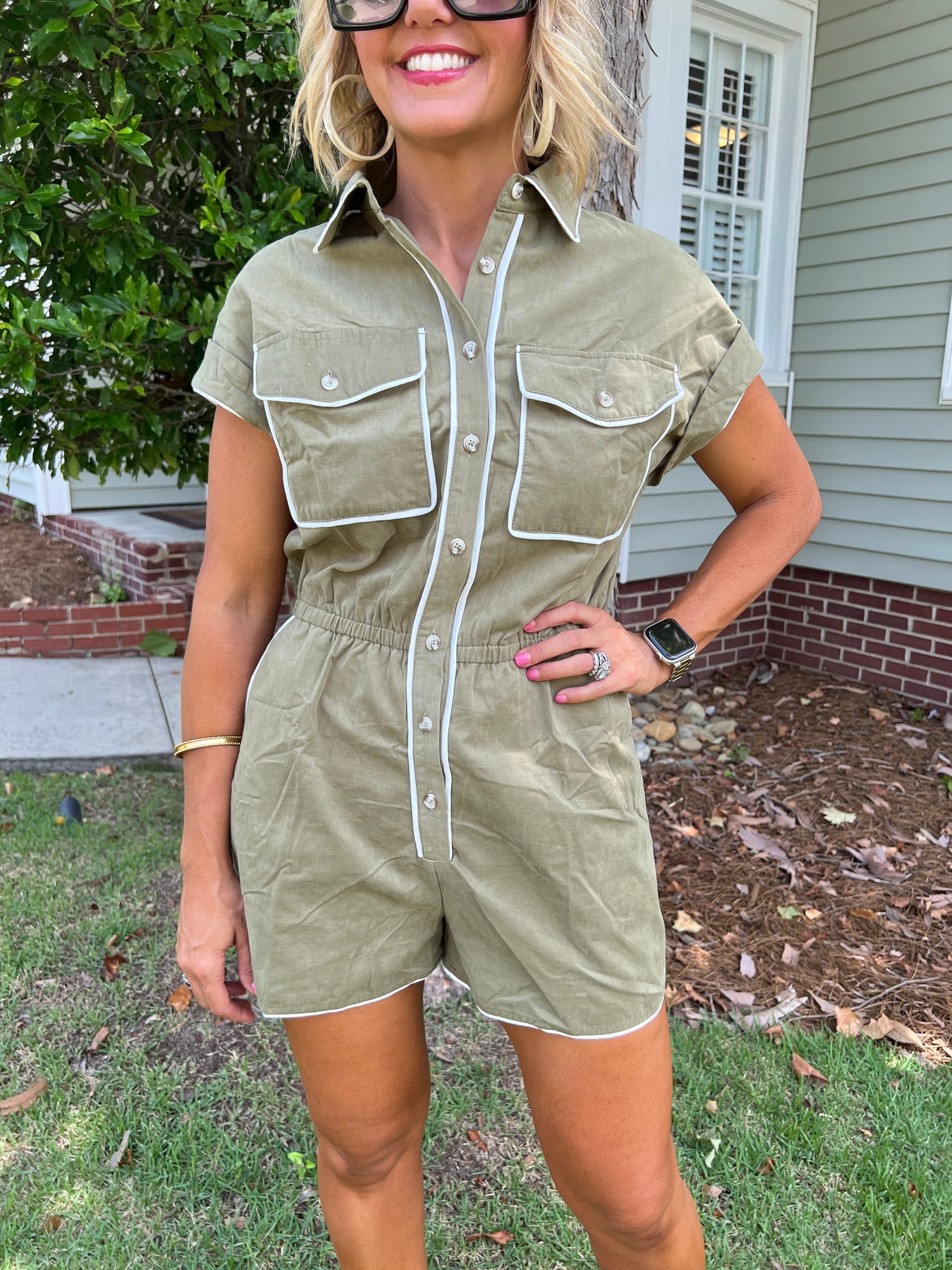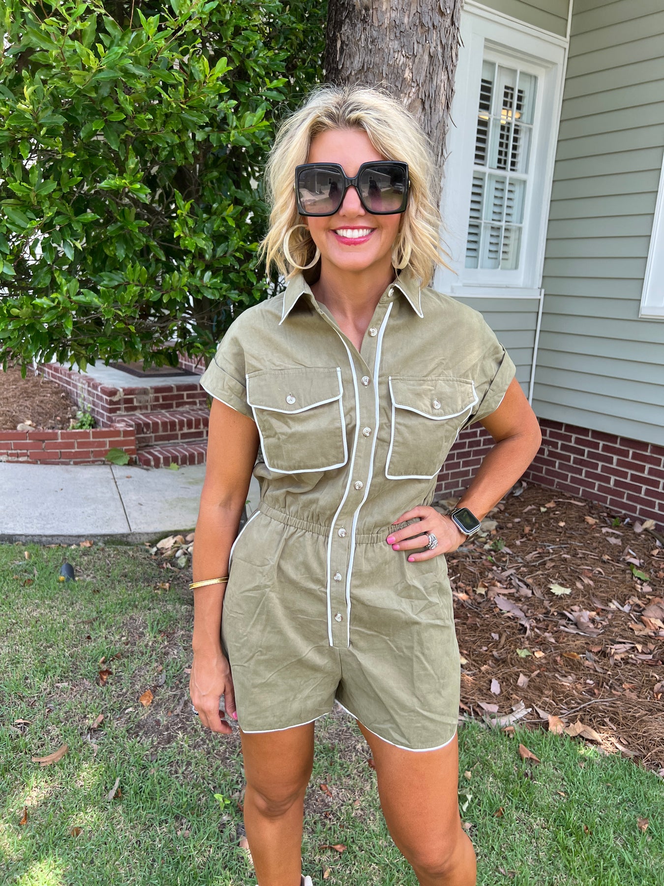 Elevate your casual wardrobe with the Olive Contrast Piping Romper. Featuring a flattering olive shade accented by sharp contrast piping, this romper combines style and comfort effortlessly. Its lightweight fabric and relaxed fit make it perfect for warm days, while the tailored details add a touch of sophistication. Ideal for both daytime outings and laid-back evenings, this romper ensures you look polished with minimal effort.