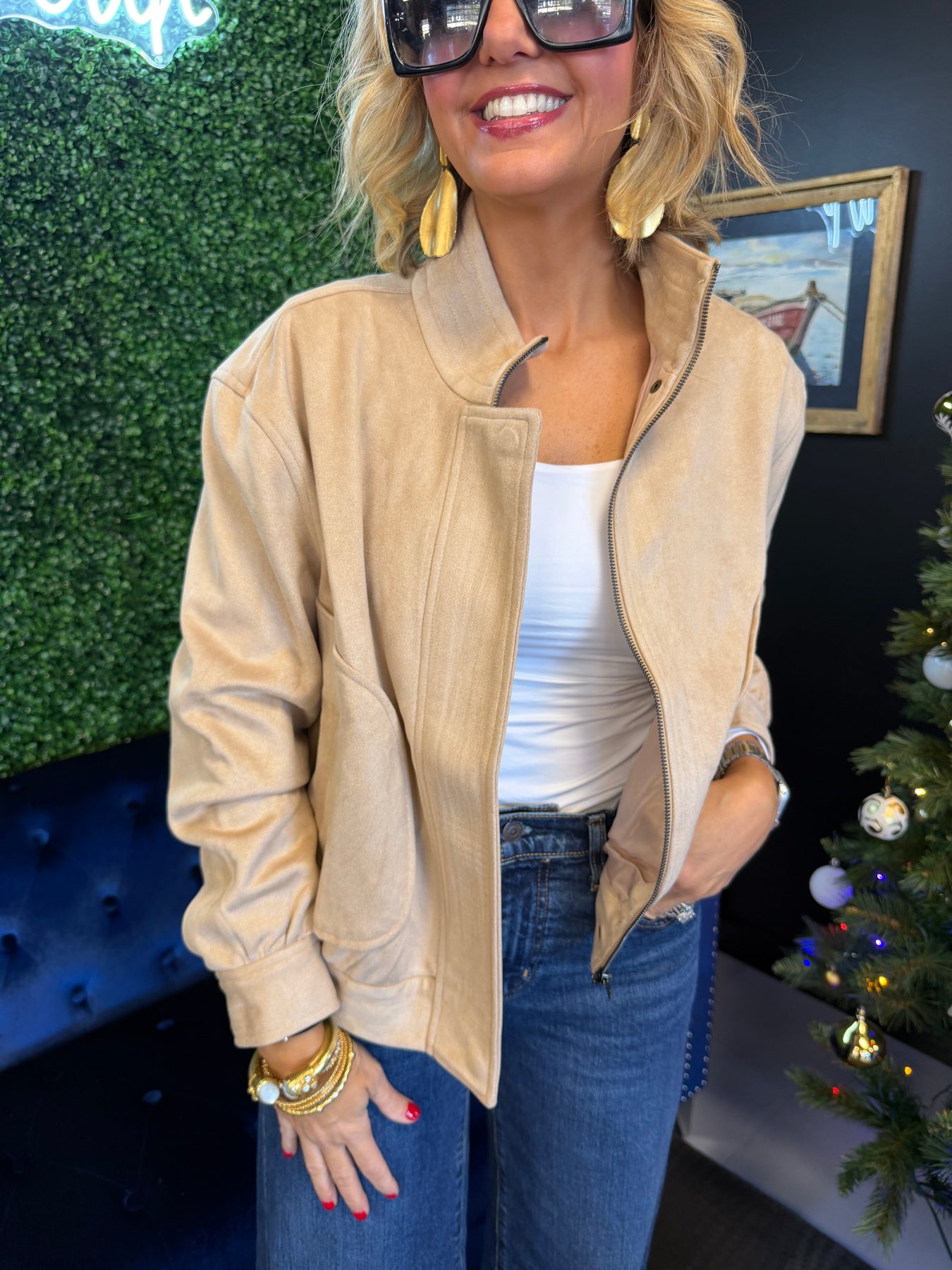 Make a bold statement with this oversized high neck suede jacket—the perfect blend of luxury and effortless style. Crafted from premium suede, it drapes beautifully while the relaxed fit offers comfort without compromising sophistication. The elevated high neck adds modern edge and extra warmth, making it ideal for layering or wearing solo. Whether you're dressing up or down, this versatile piece instantly elevates any outfit and works season after season. A timeless investment piece that transforms your wardrobe.