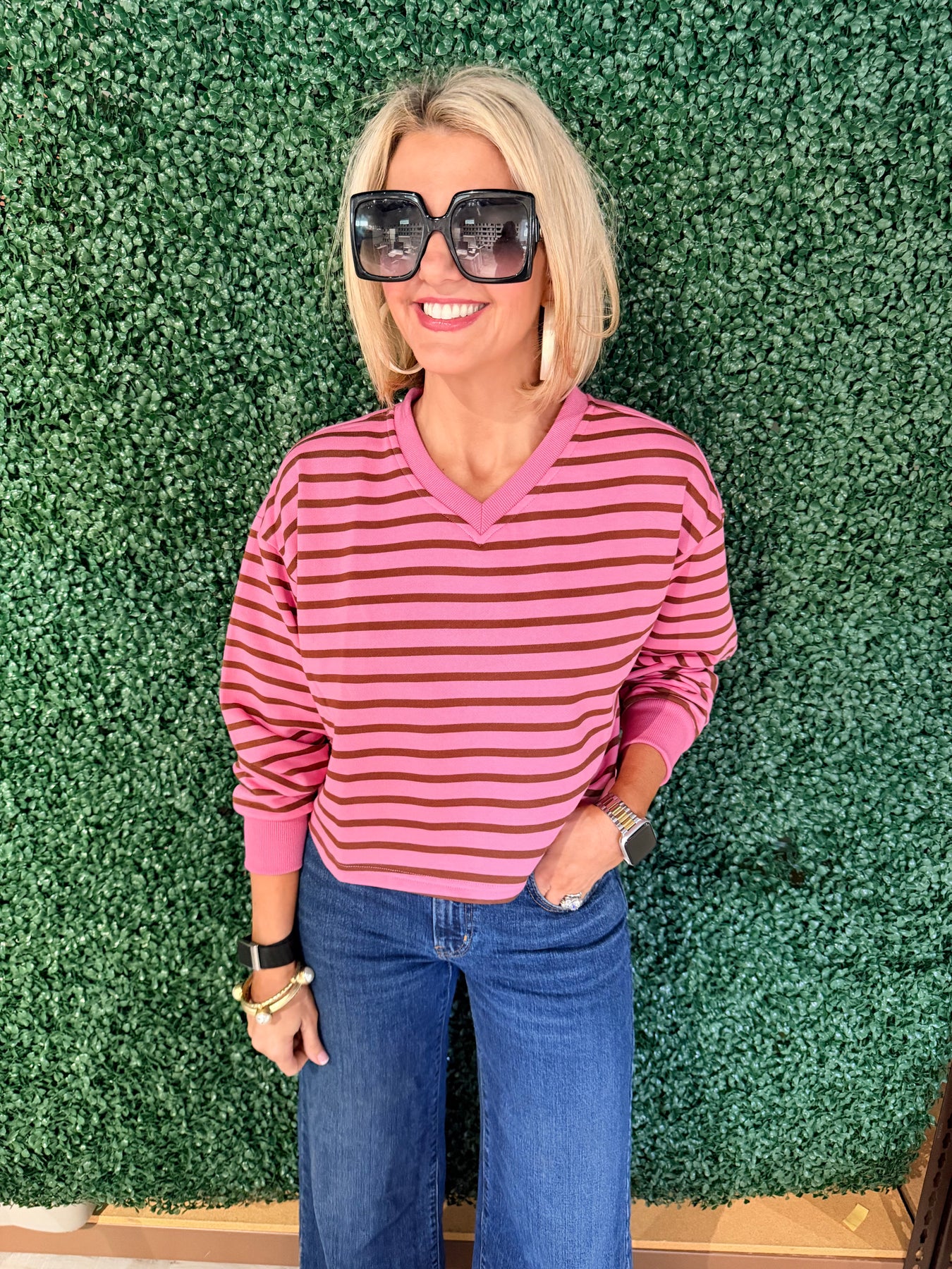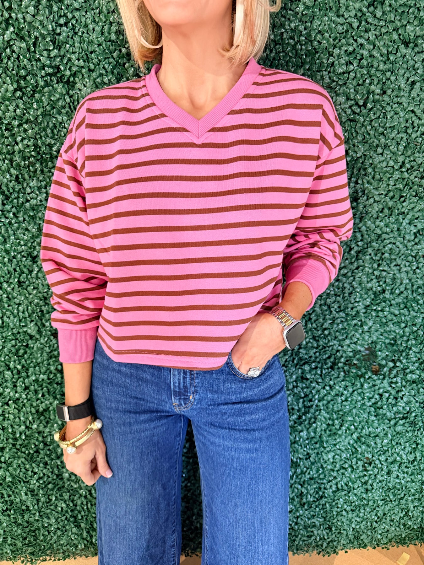 Elevate your everyday wardrobe with this sophisticated striped long sleeve. The classic pink and brown color combination offers versatile styling options that transition seamlessly from office to weekend. The flattering V-neckline creates an elongated silhouette, while the long sleeves provide comfortable coverage year-round. Perfect for layering or wearing solo, this timeless piece pairs effortlessly with jeans, trousers, or skirts. A wardrobe essential that delivers both style and practicality.