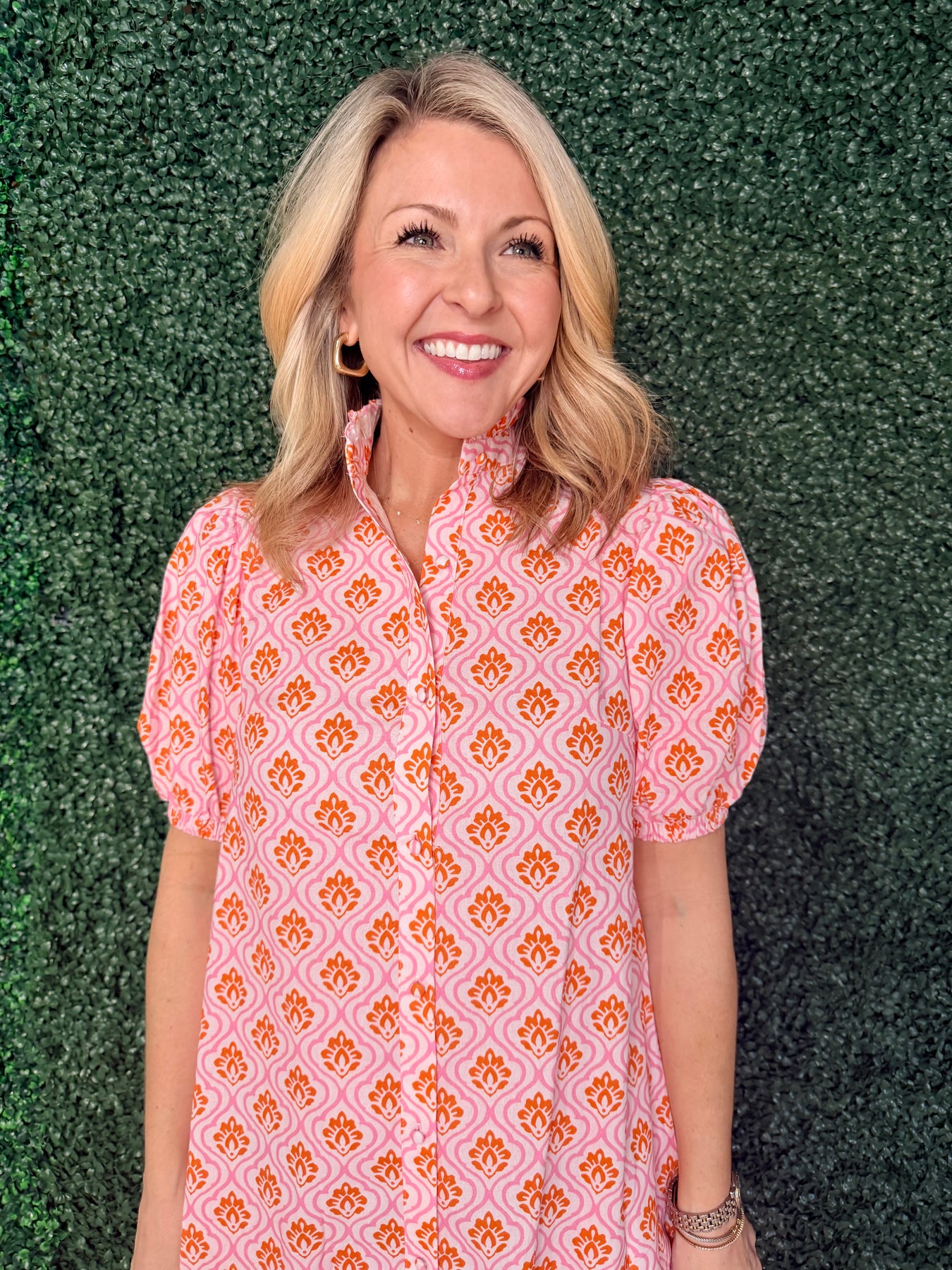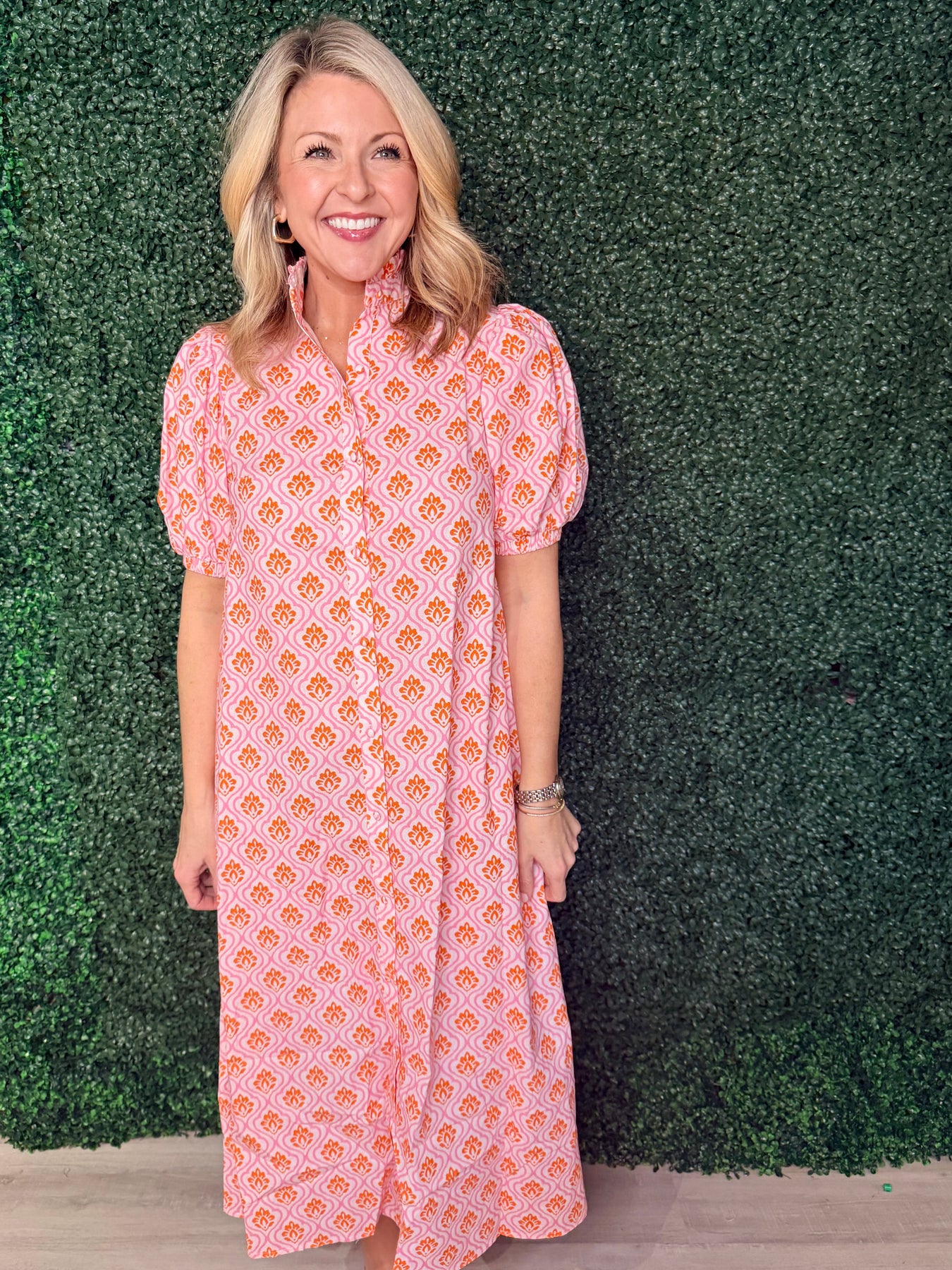 Elevate your everyday wardrobe with this striking pink and orange printed button-down midi dress. The classic button-front design offers effortless styling versatility, while the midi length provides sophisticated coverage that works from office to weekend outings. The bold geometric print adds visual interest and pairs beautifully with sneakers, heels, or flats depending on your mood. Crafted for comfort and durability, this dress is the perfect investment piece that transitions seamlessly through seasons. Whether you're dressing up for a special occasion or keeping it casual, this timeless style delivers both elegance and practicality in one stunning package.